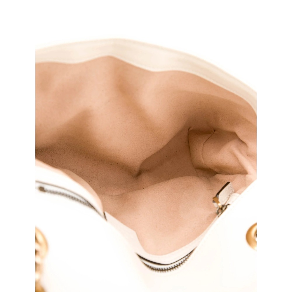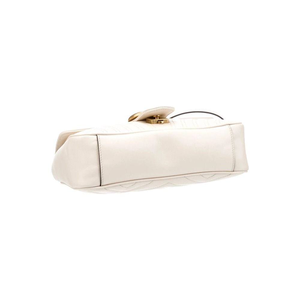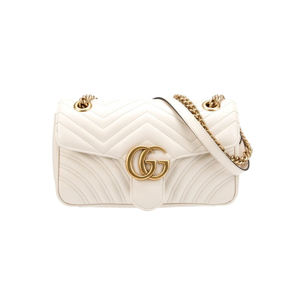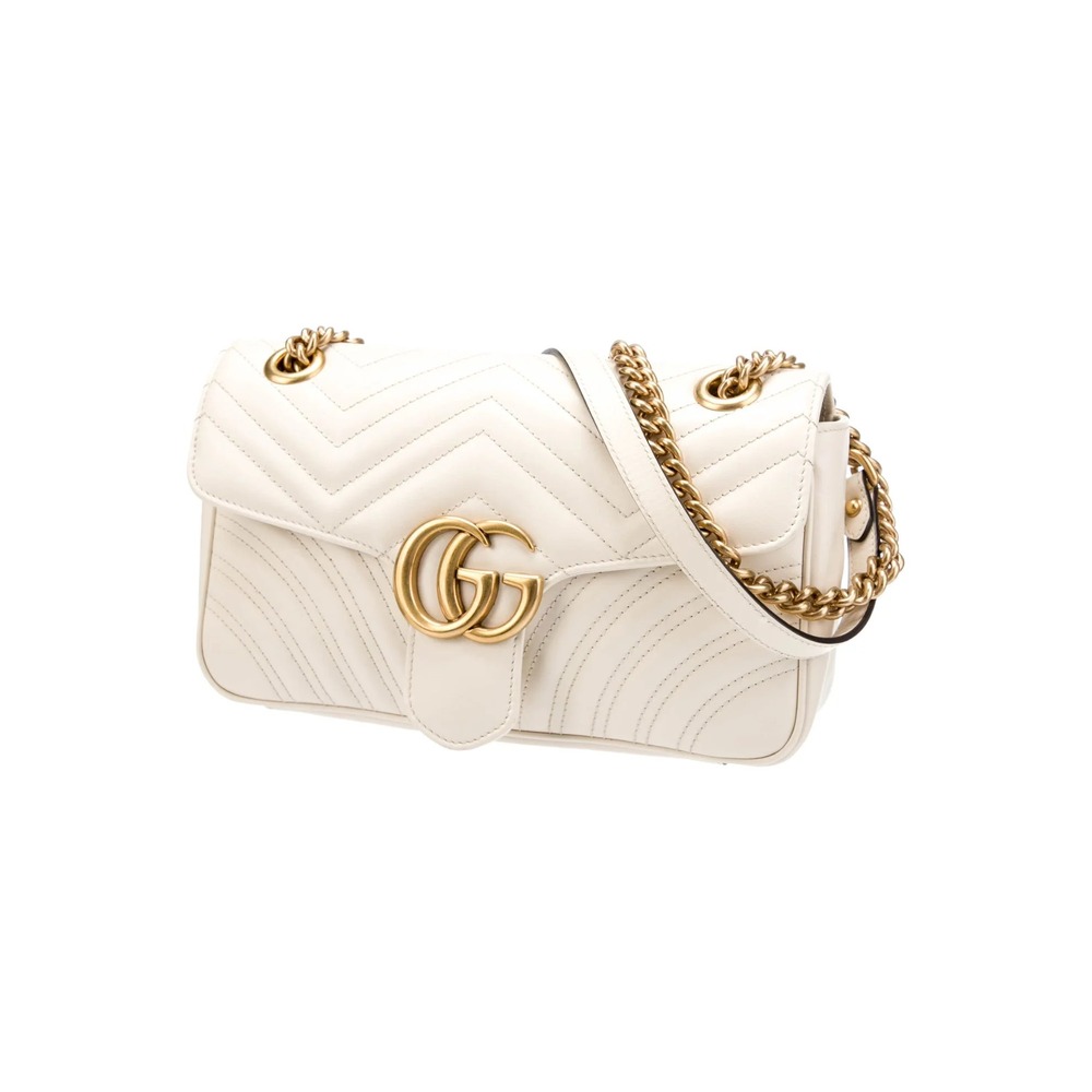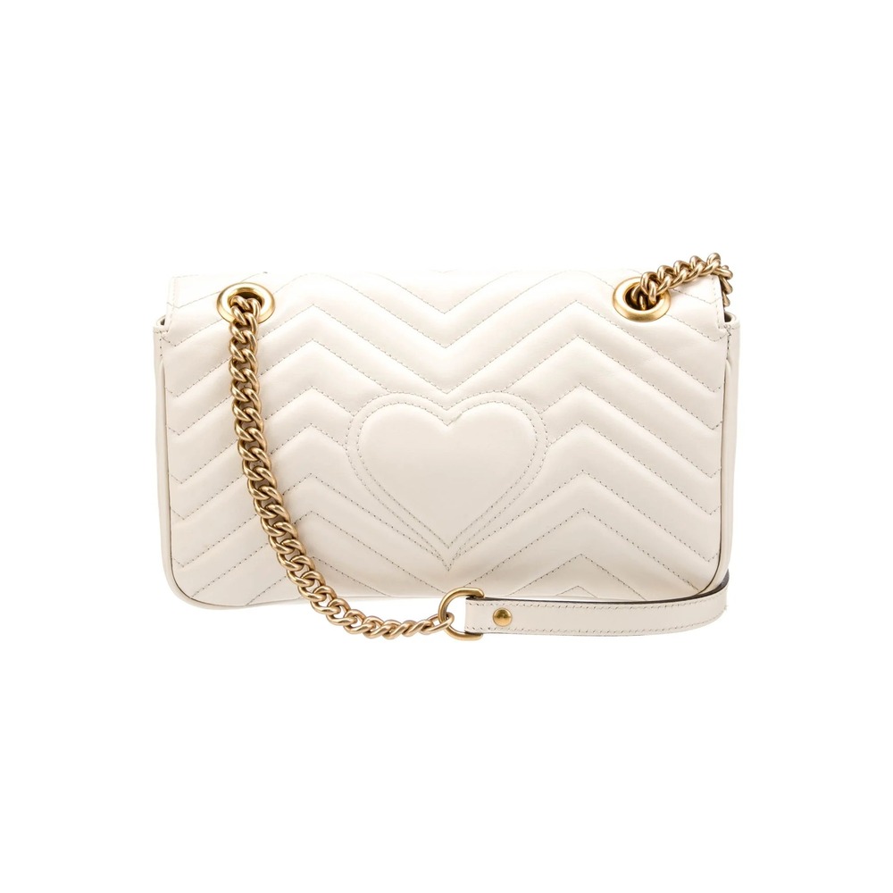 The small GG Marmont camera bag has a softly structured shape and a flap closure with Double G hardware. The sliding chain strap can be worn multiple ways, changing between a shoulder and a top handle bag. Made in matelass?? chevron leather with a heart on the back.