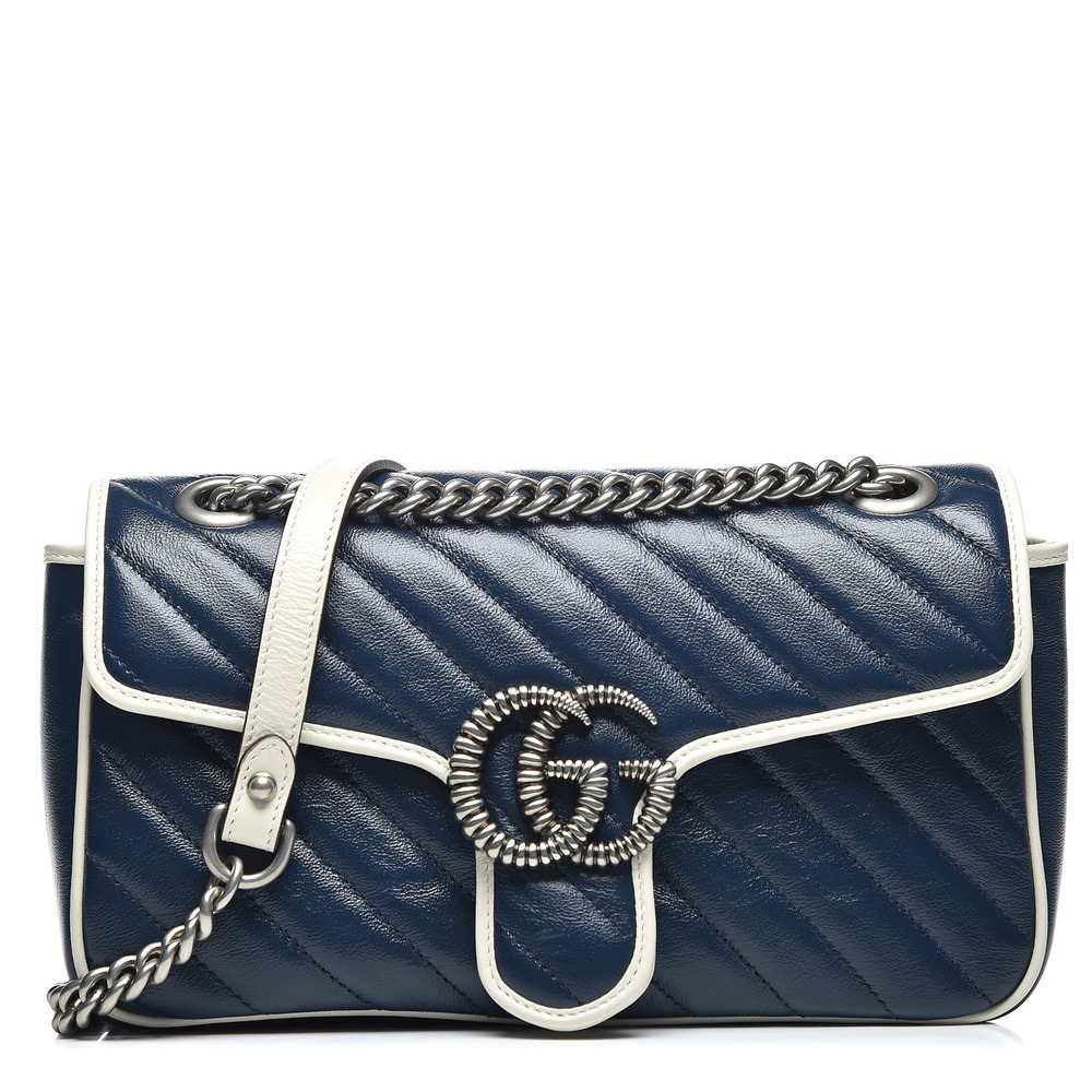 GUCCI Monogram Matelasse Diagonal Small GG Marmont Shoulder Bag in Light Blue, Pink, Blue, Green, and Red. This stylish shoulder bag is crafted of multicolor Gucci monogram with navy blue leather trim and features a silver chain-link shoulder strap, with a navy blue leather shoulder pad. The crossover flap has a prominent silver interlocking GG logo and opens with a press lock to a beige microfiber interior with a zipper pocket.