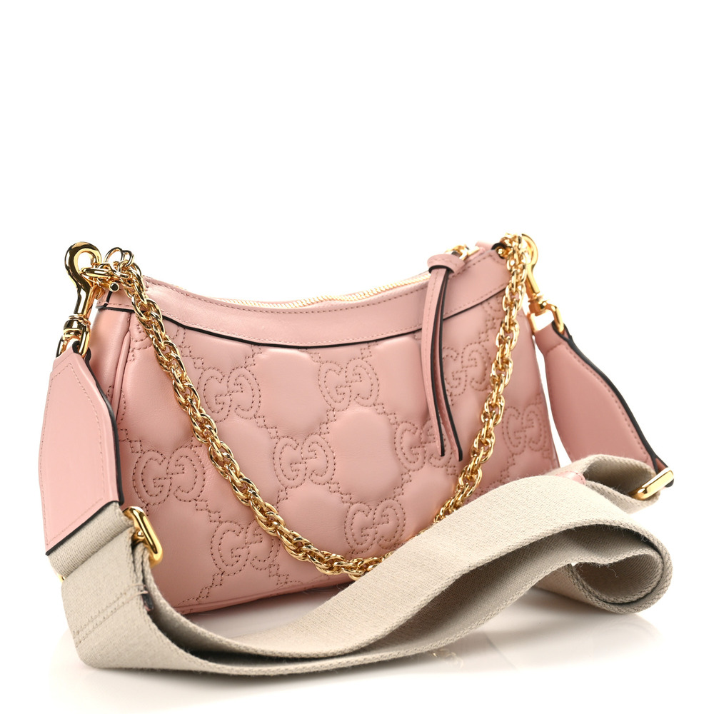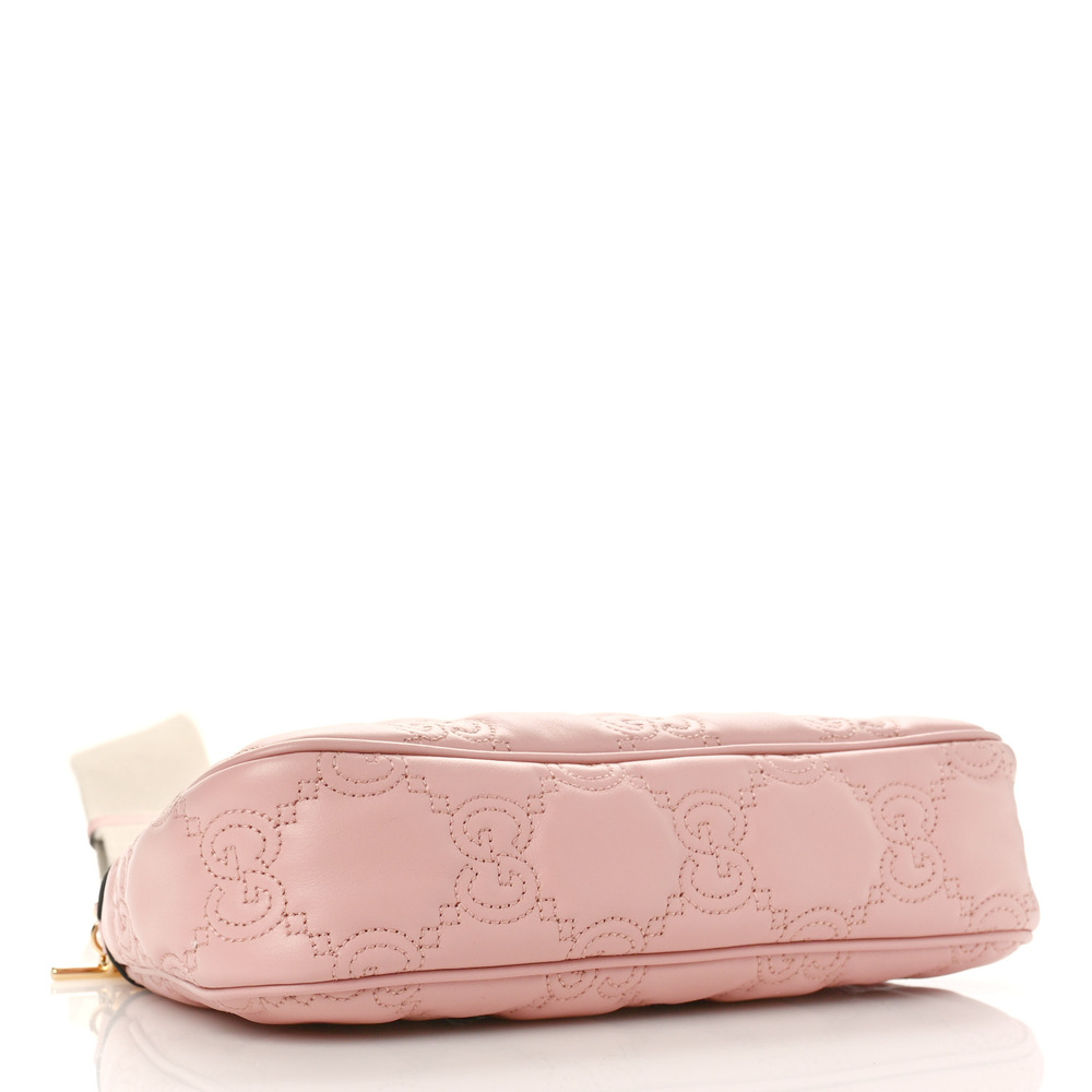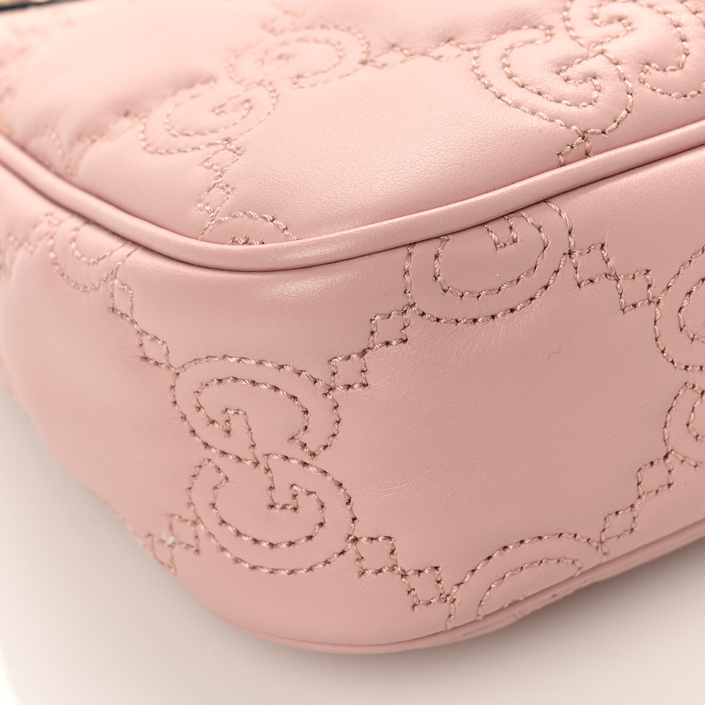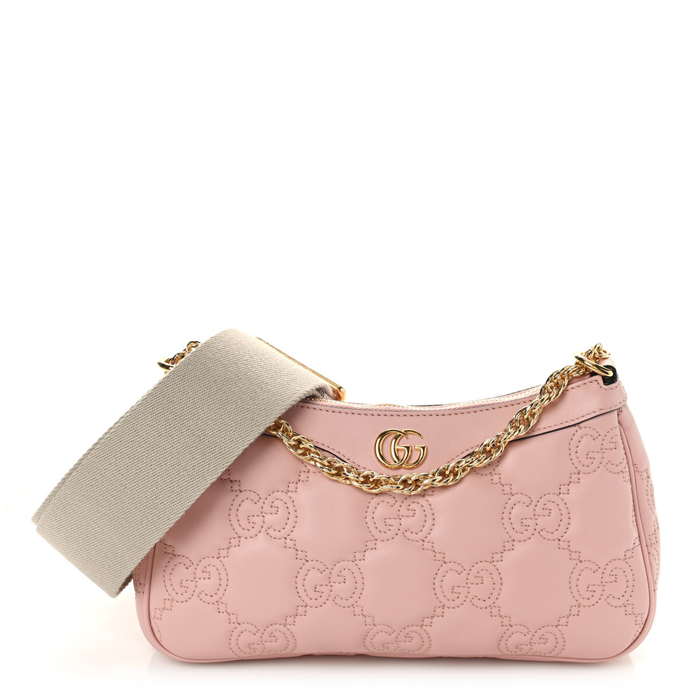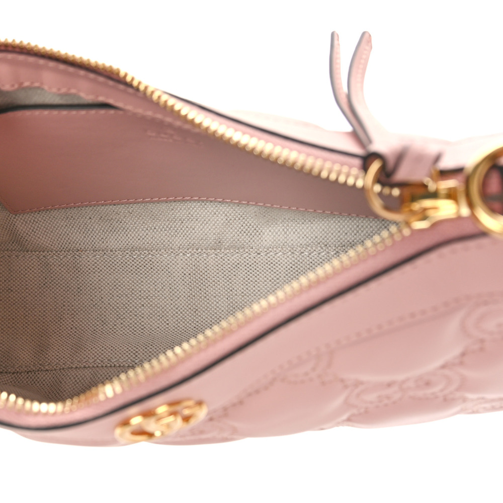 Matelass?? leather is a signature material of the House, thanks to its super soft finish. The textured GG motif defines a selection of handbags, including this pink leather bag. The Double G hardware decorates the front, continuing the logo feel of the design.