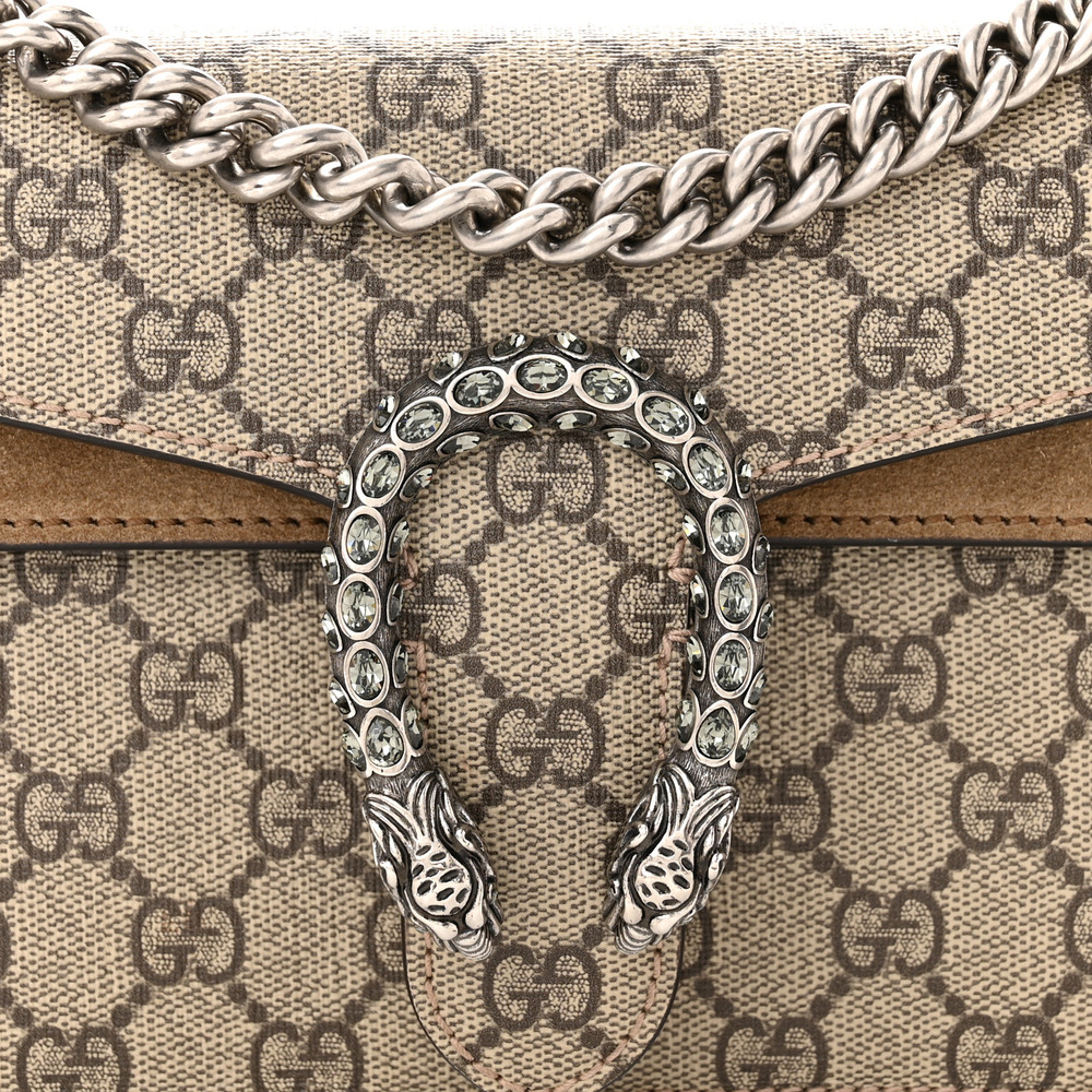 During the Cruise 2023 Gucci Cosmogonie fashion show, new constellations of House codes were presented. The now recognizable tiger head closure continues to decorate new iterations of the Dionysus handbag. Here, the small structured shape is juxtaposed by a bold Web strap embellished with studs that spell out Gucci.