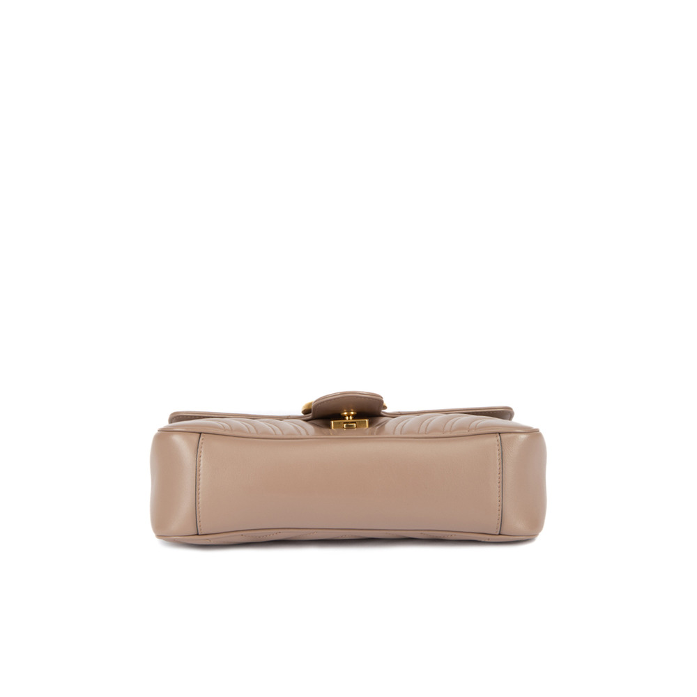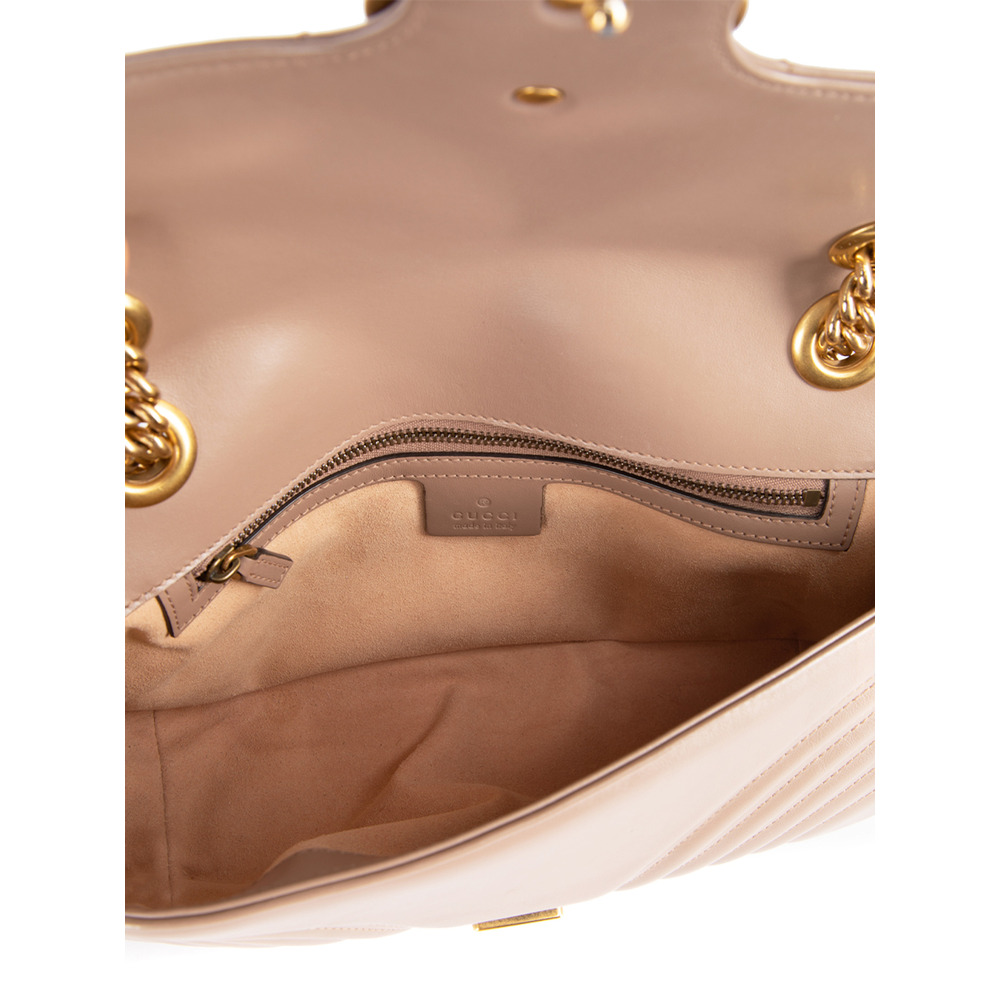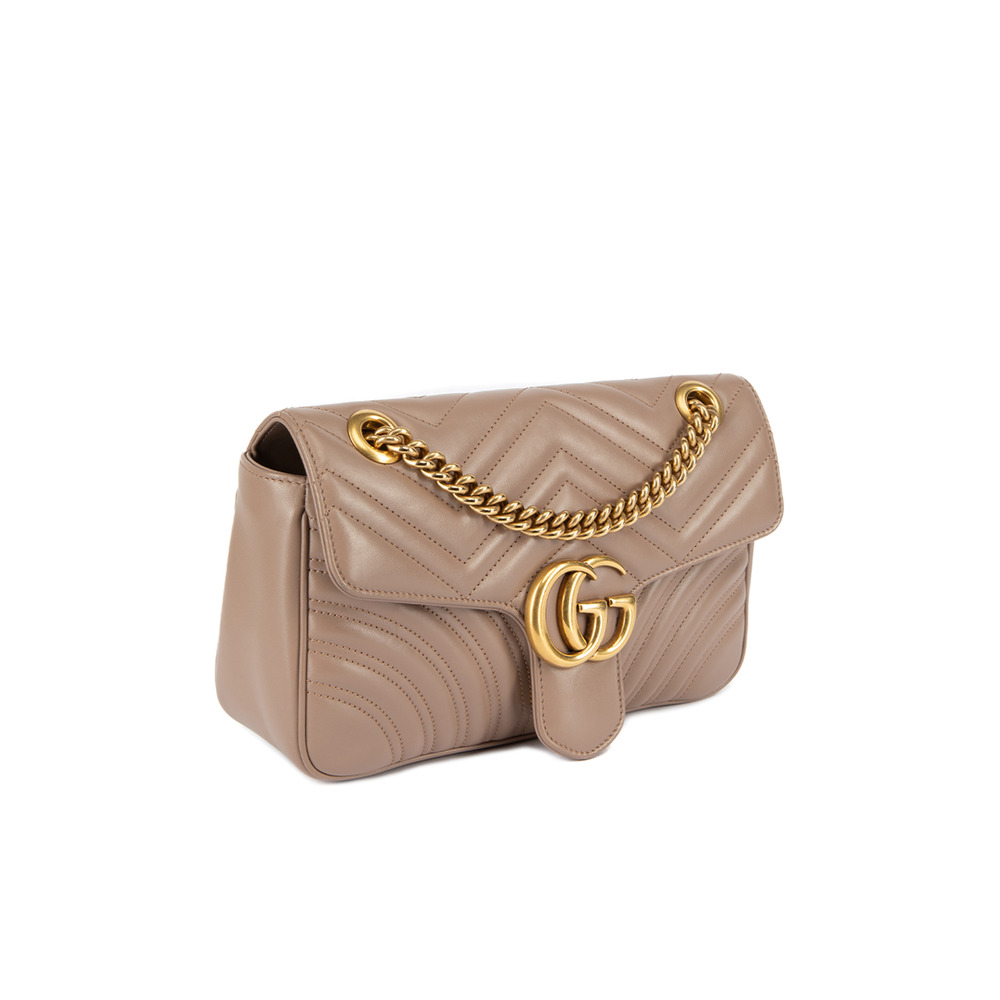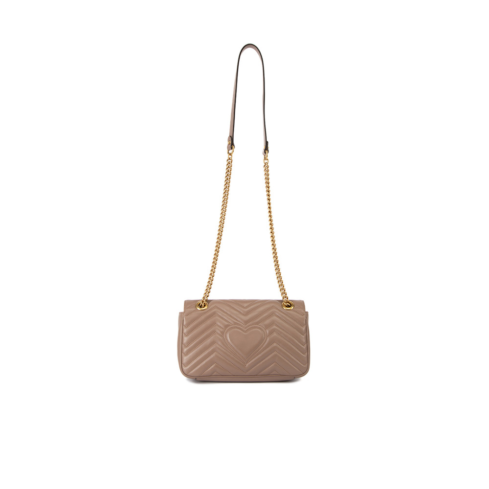 The small GG Marmont camera bag has a softly structured shape and a flap closure with Double G hardware. The sliding chain strap can be worn multiple ways, changing between a shoulder and a top handle bag. Made in matelass?? chevron leather with a heart on the back.