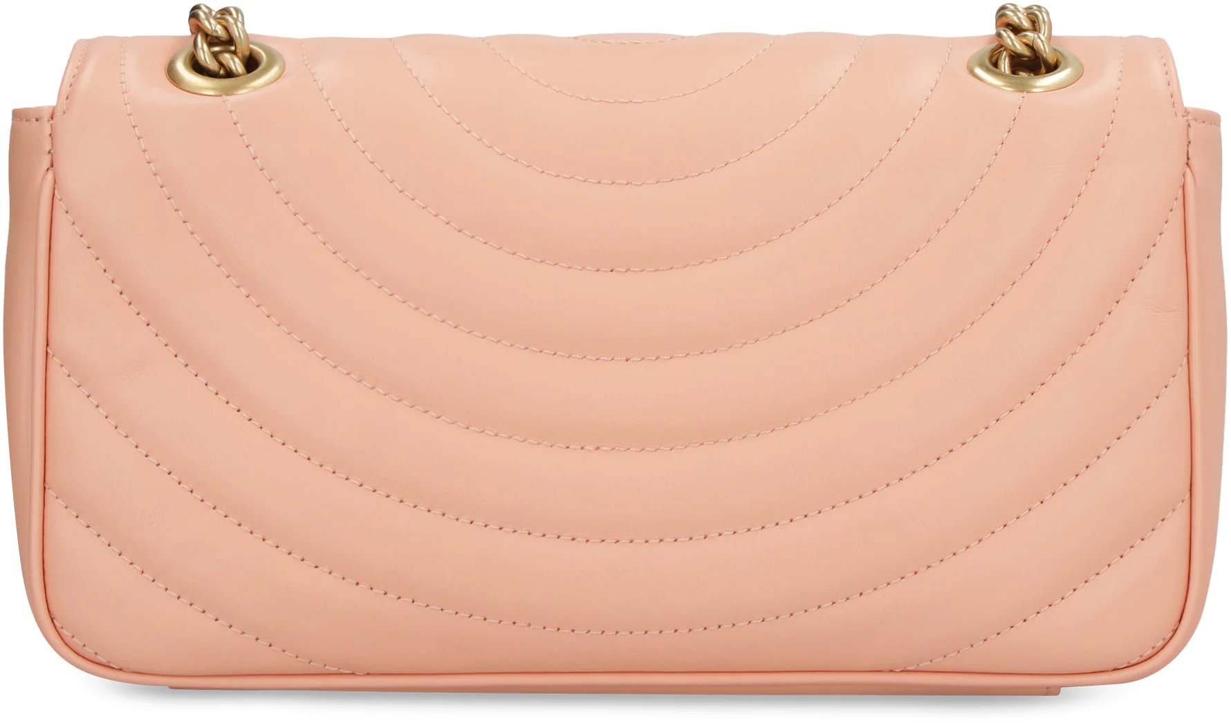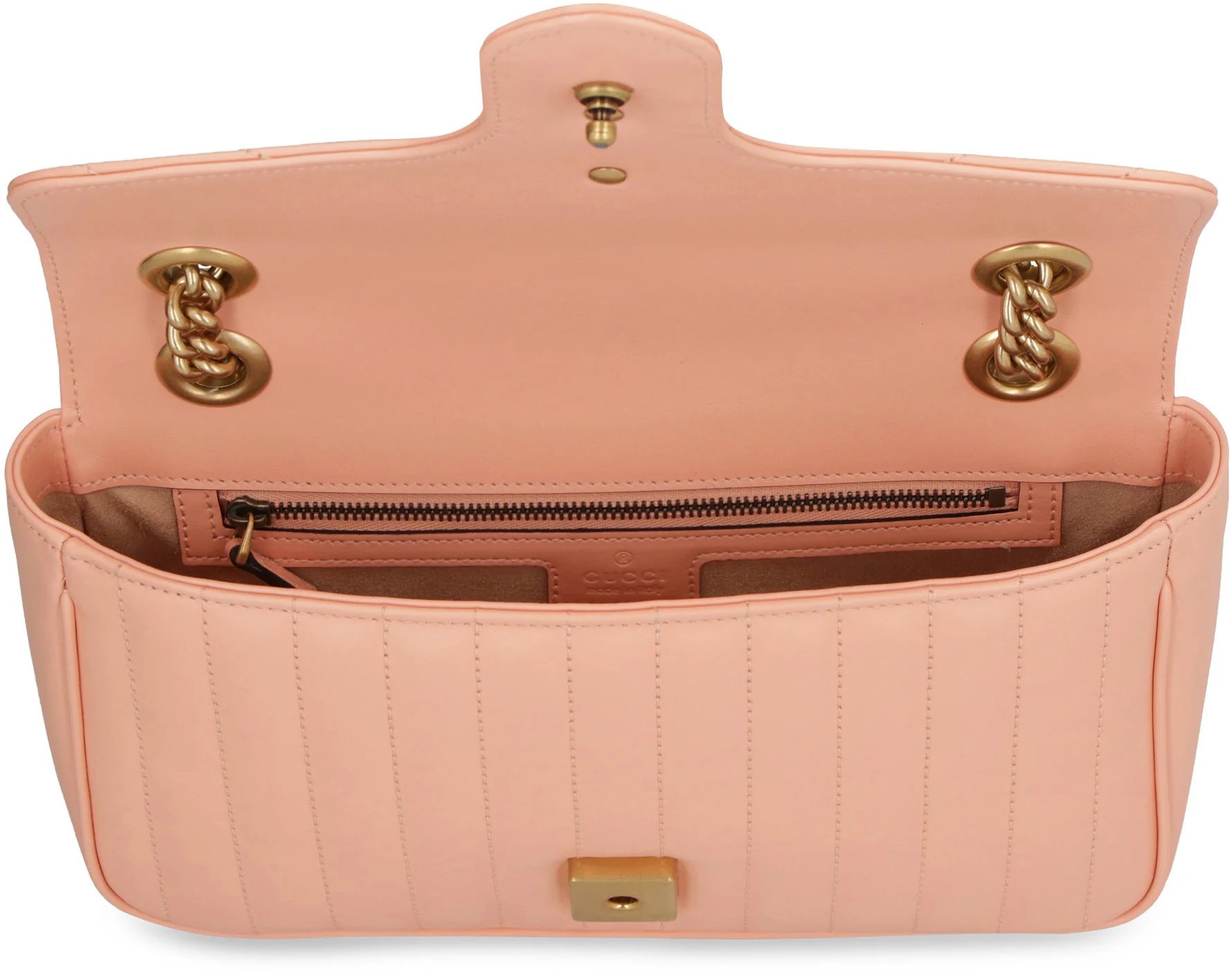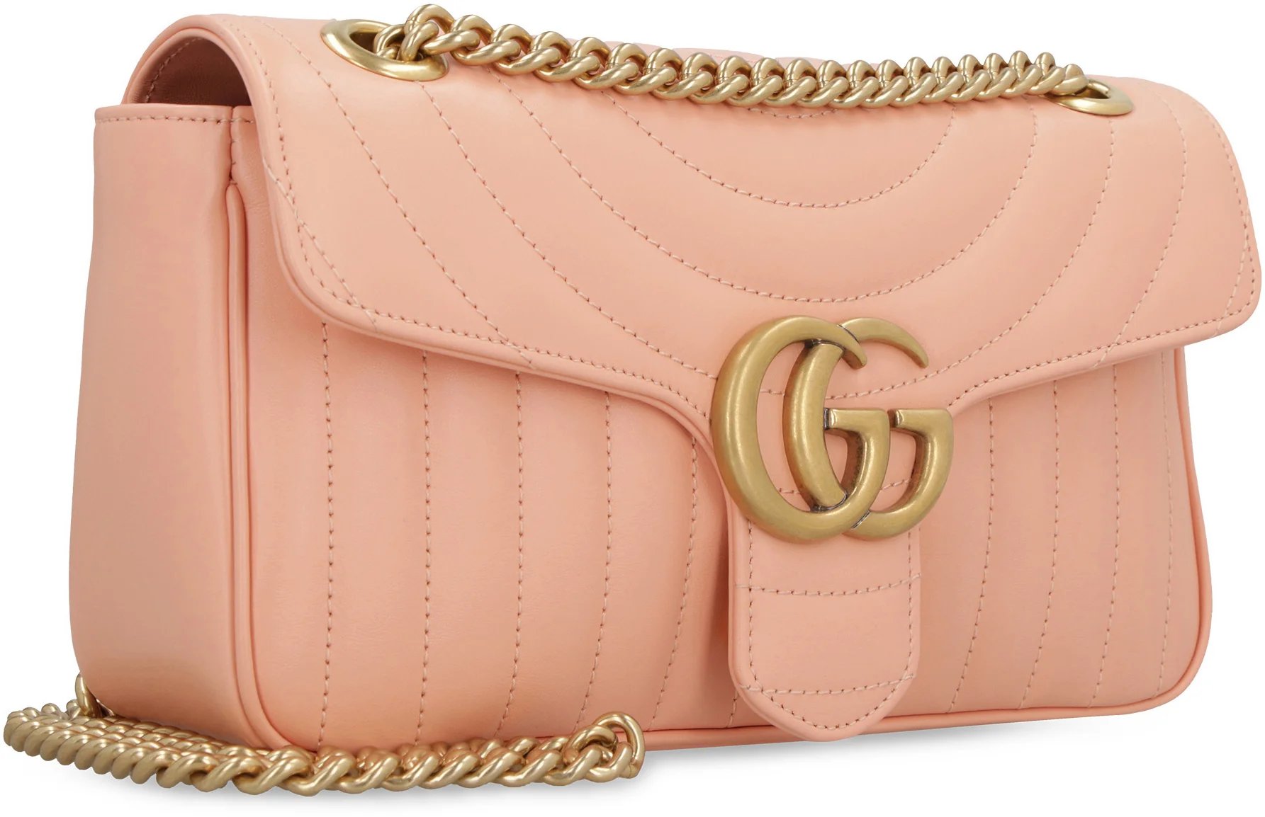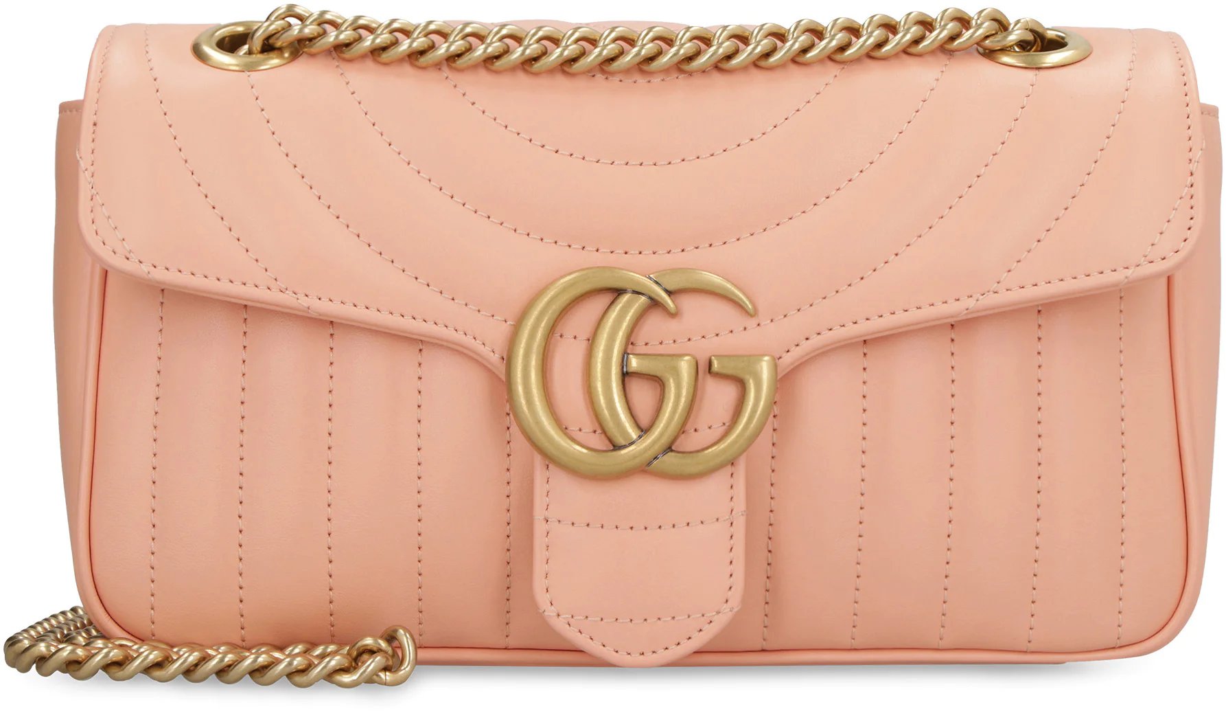 The small GG Marmont chain shoulder bag has a softly structured shape and an oversized flap closure with Double G hardware. The sliding chain strap can be worn multiple ways, changing between a shoulder and a top handle bag. Made in matelass?? chevron leather with a heart on the back.