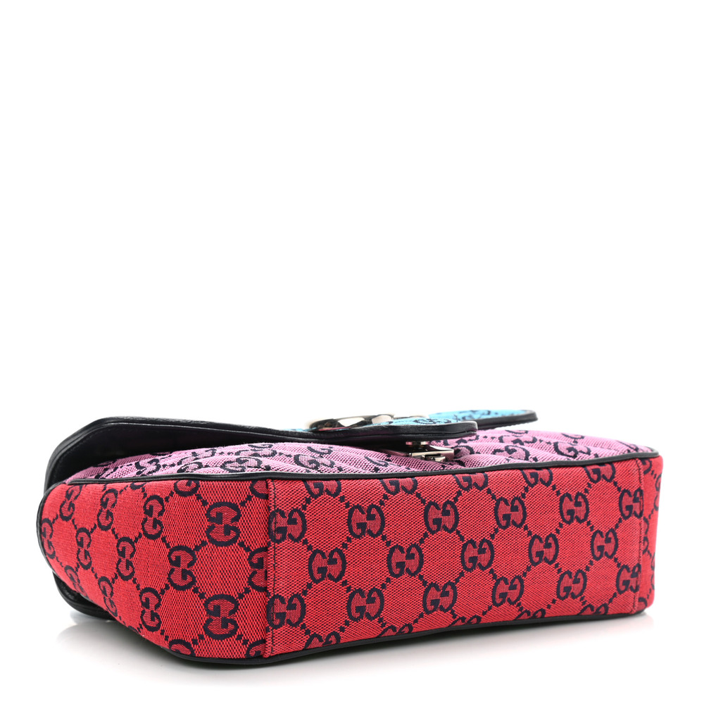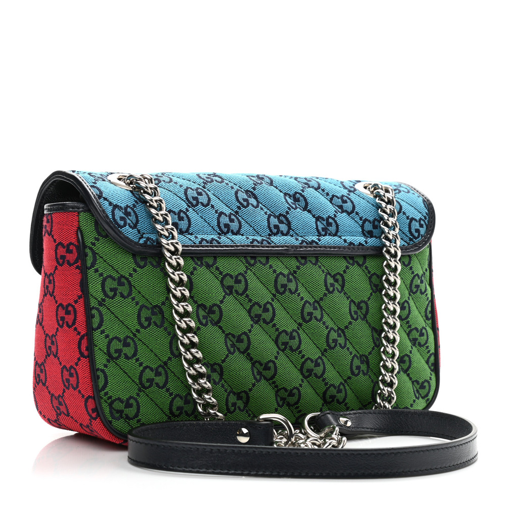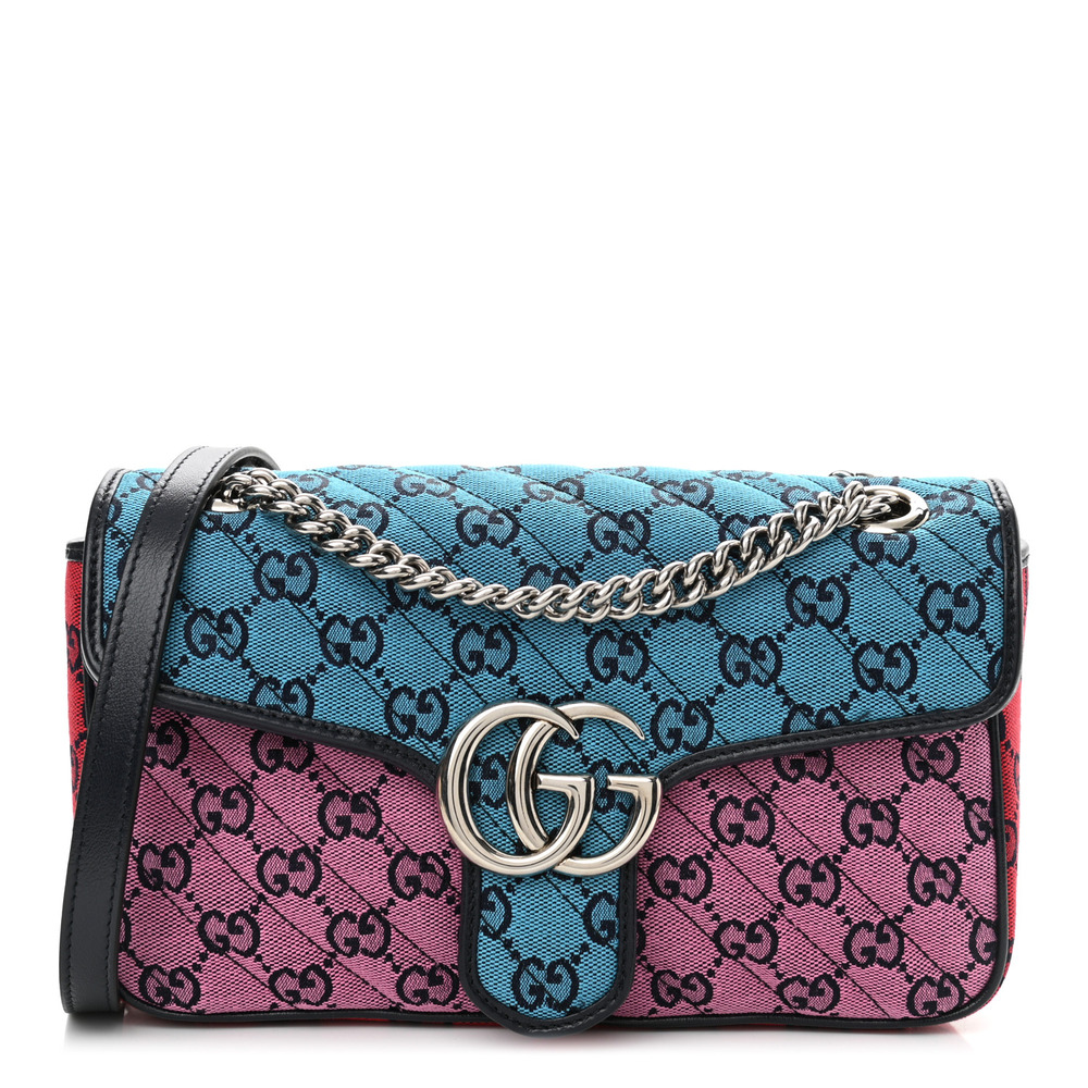 GUCCI Monogram Multicolor Matelasse Diagonal Small GG Marmont Shoulder Bag in Light Blue, Pink, Blue, Green, and Red. This stylish shoulder bag is crafted of multicolor Gucci monogram with navy blue leather trim and features a silver chain-link shoulder strap, with a navy blue leather shoulder pad. The crossover flap has a prominent silver interlocking GG logo and opens with a press lock to a beige microfiber interior with a zipper pocket.