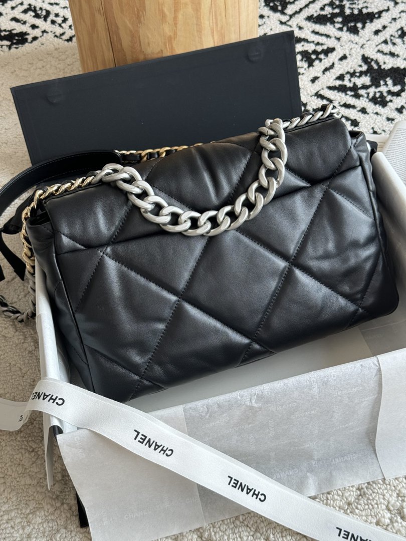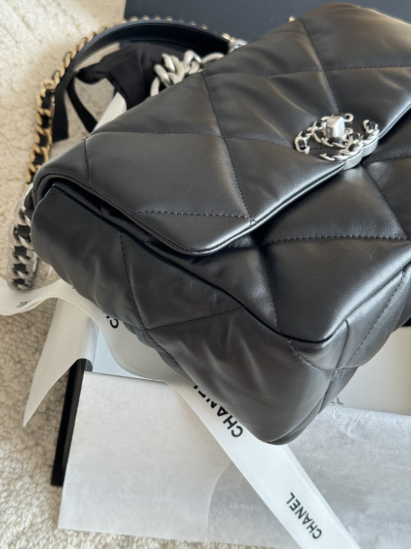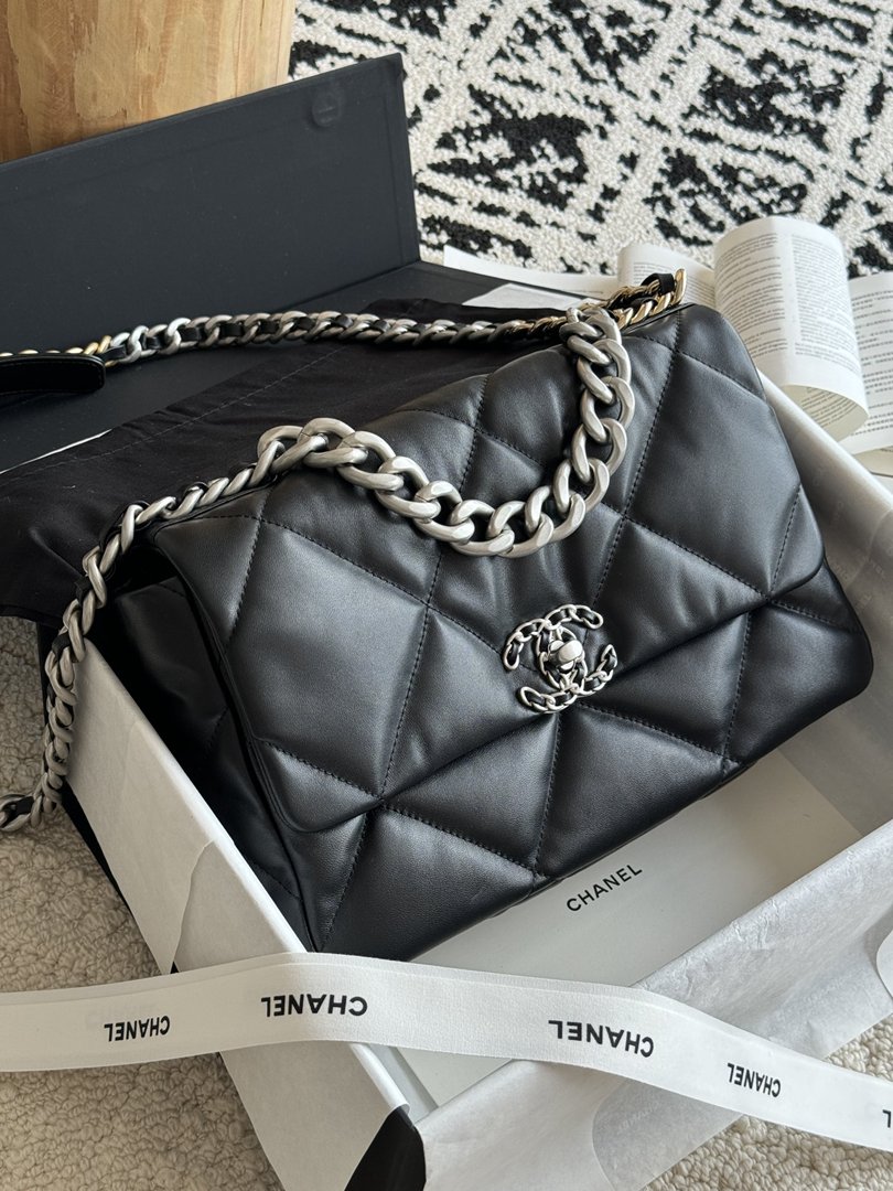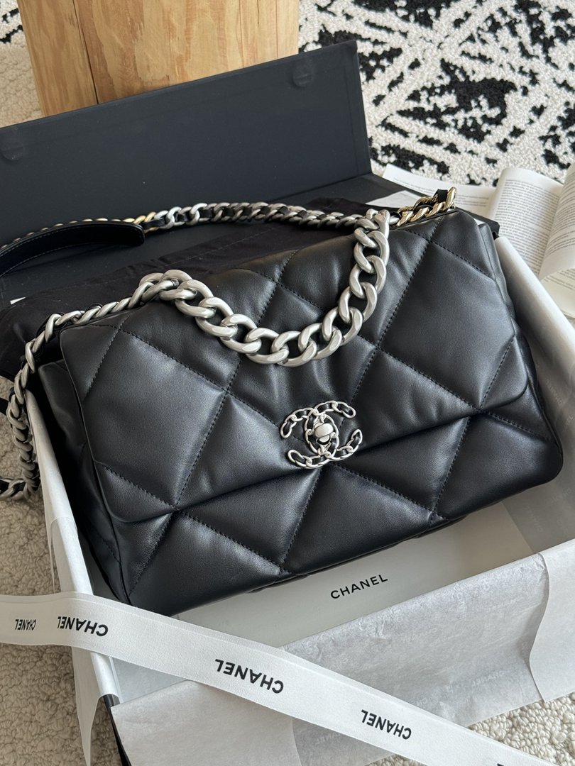 chanel 19 bag black shiny lambskin sliver cc gold&sliver hardware medium