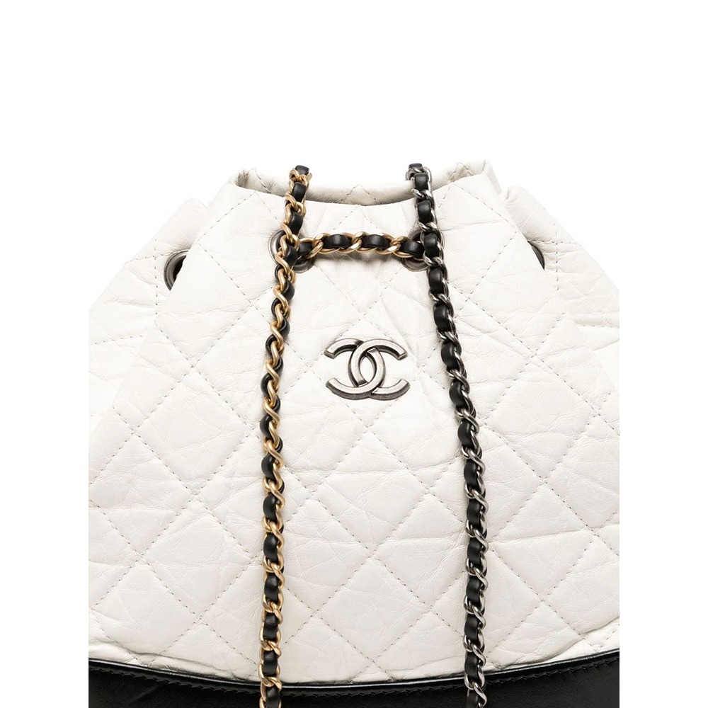 An authentic Chanel backpack crafted in diamond-stitched patent goatskin leather with white and black patent leather base, adorned with gold and silver ruthenium chain-threaded black leather straps. Spacious and stylish, perfect for everyday essentials.