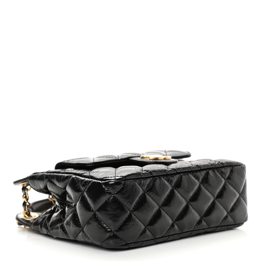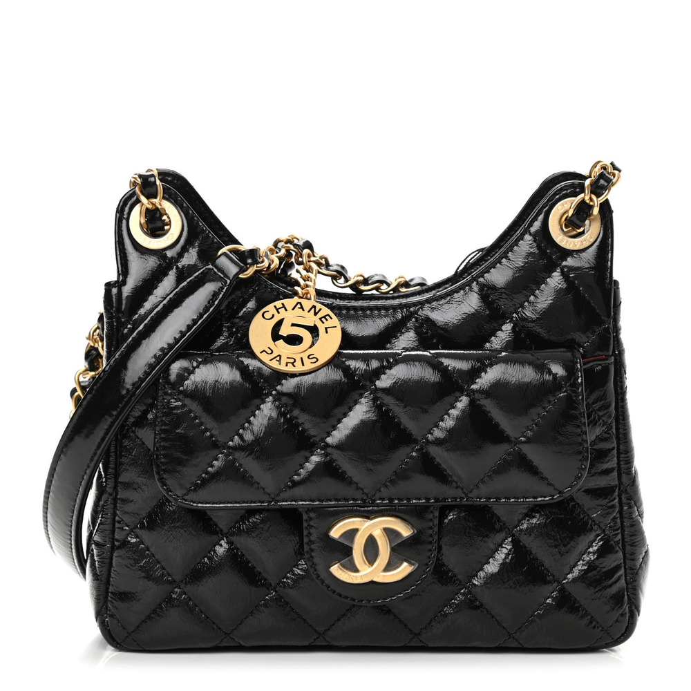 CHANEL Shiny Crumpled Calfskin Quilted Small Wavy CC Hobo Black