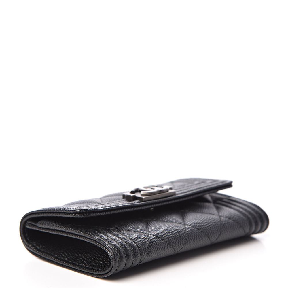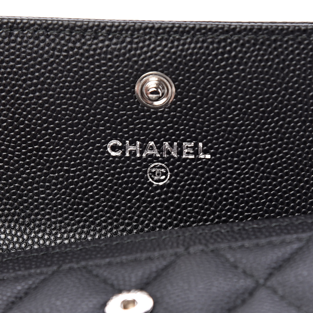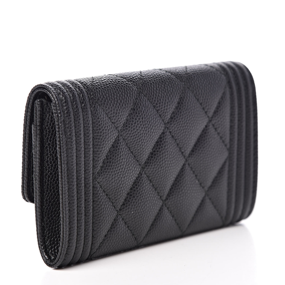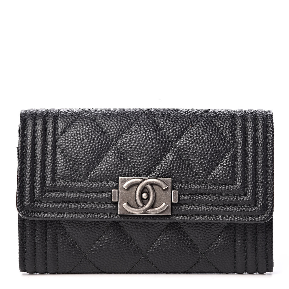 This stylish wallet is crafted of beautifully diamond quilted grained calfskin caviar leather in red with a periphery quilt. The wallet has a facing aged gold Chanel CC press lock, the 3/4 wrap around zipper opens to a compact interior of card slot panels with three compartments.