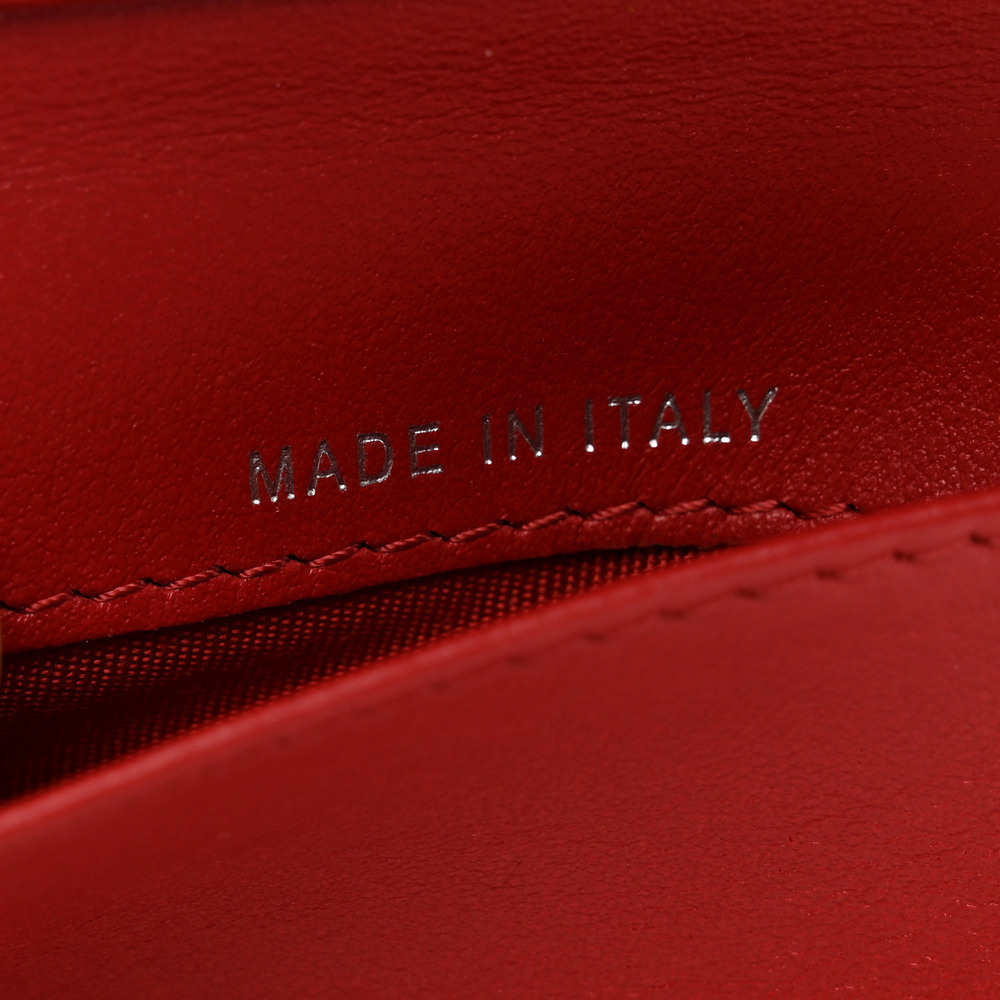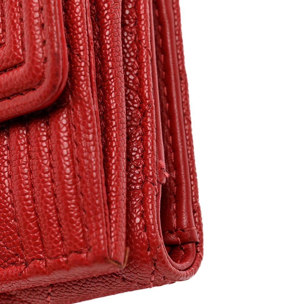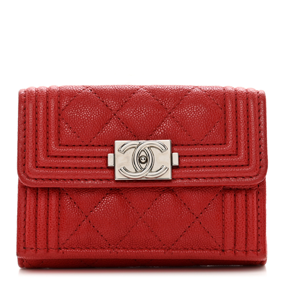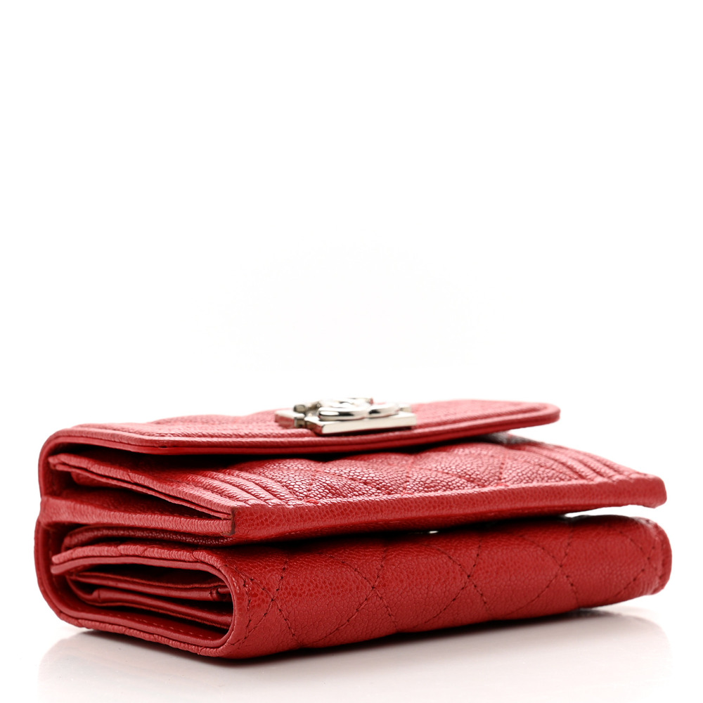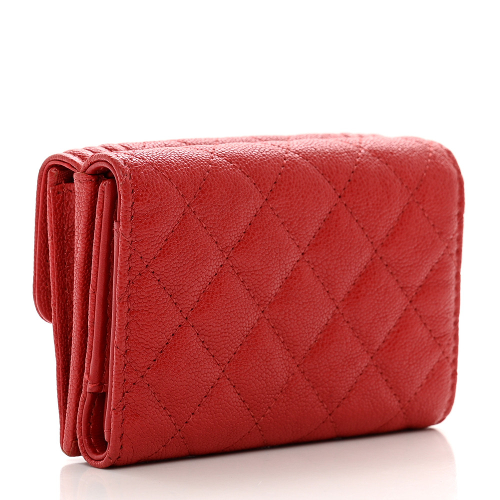 This stylish wallet is crafted of beautifully diamond quilted grained calfskin caviar leather in red with a periphery quilt. The wallet has a facing aged gold Chanel CC press lock, the 3/4 wrap around zipper opens to a compact interior of card slot panels with three compartments.