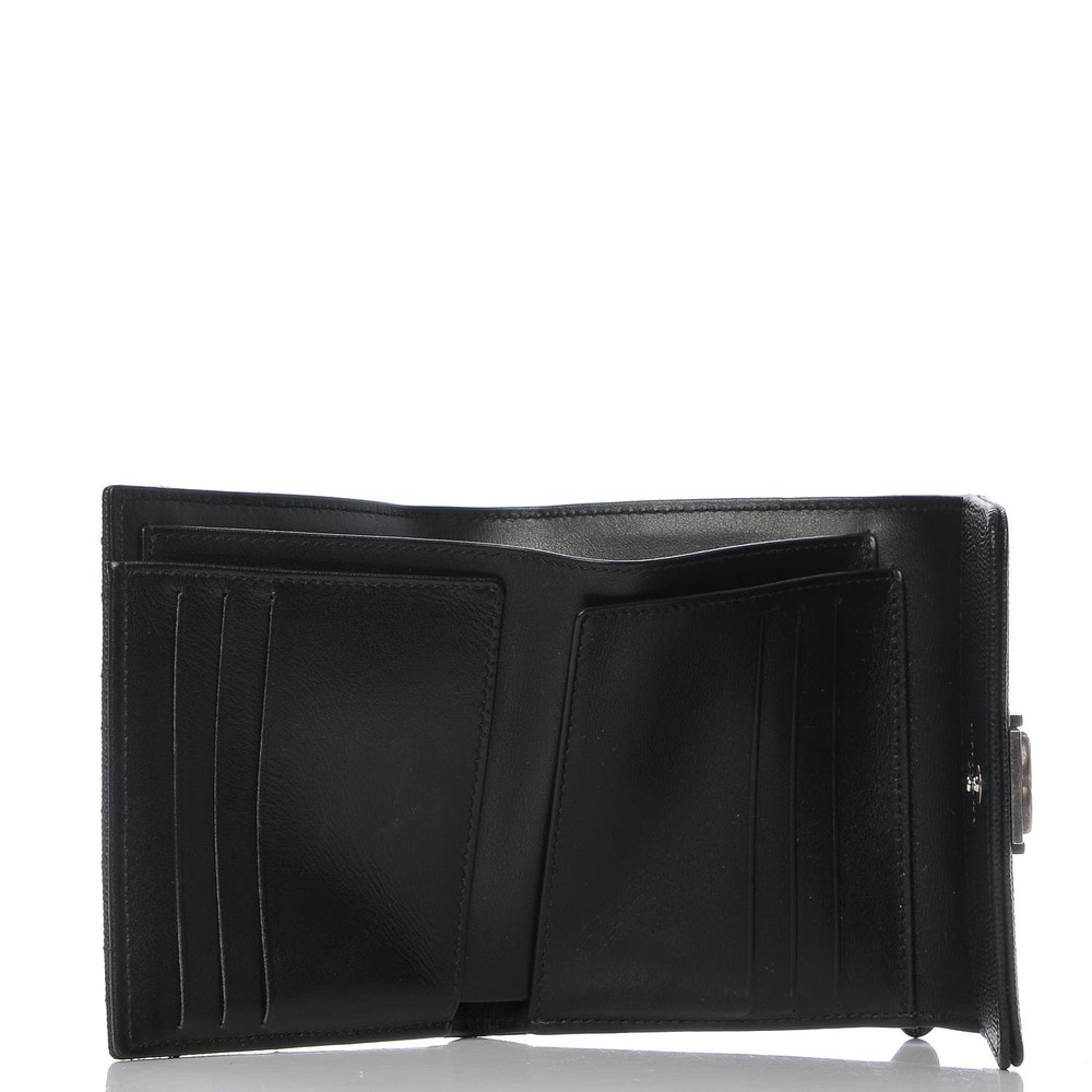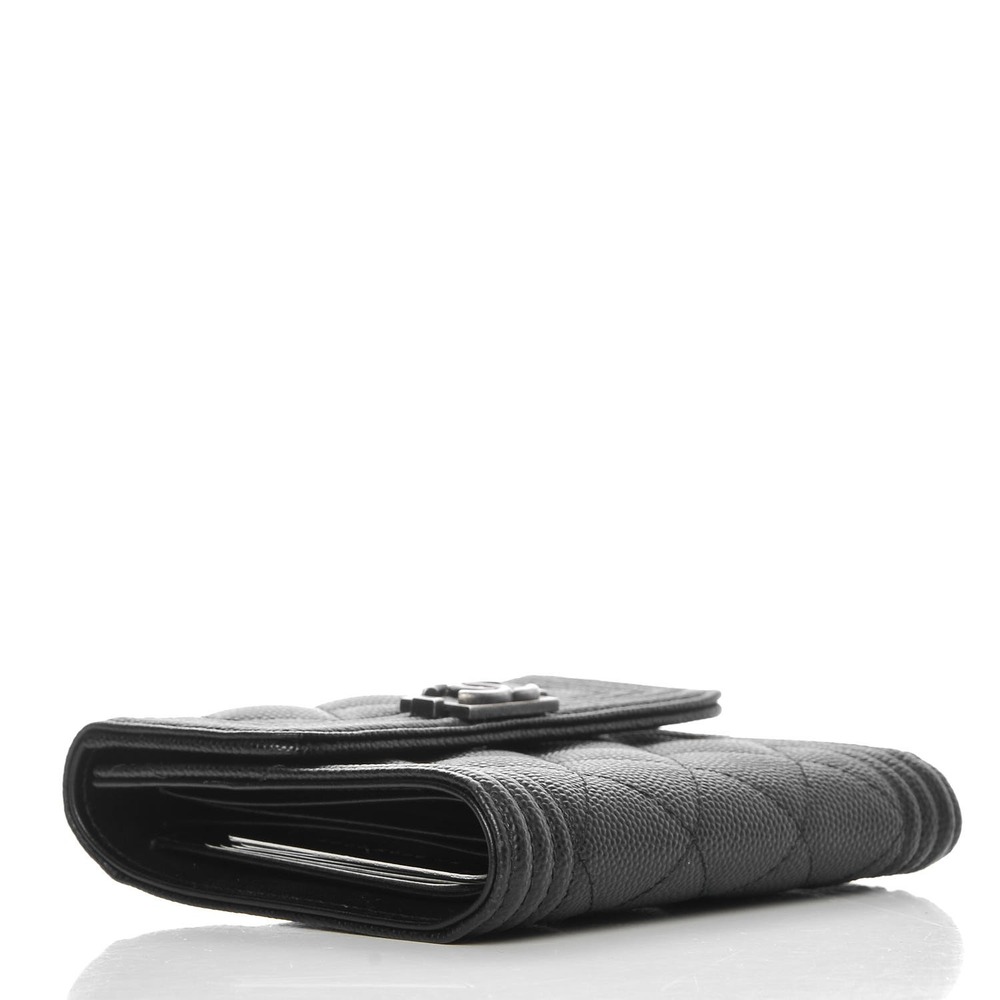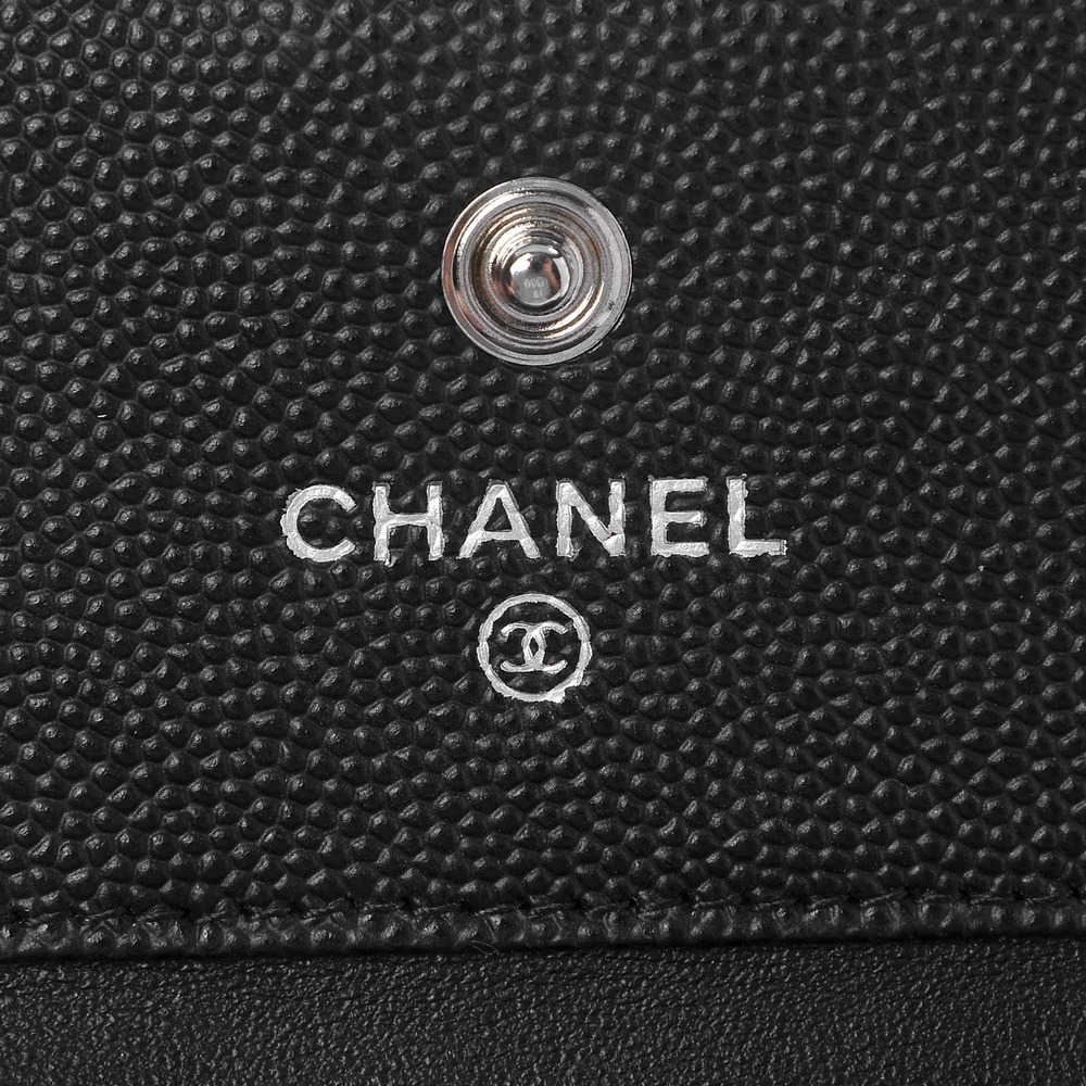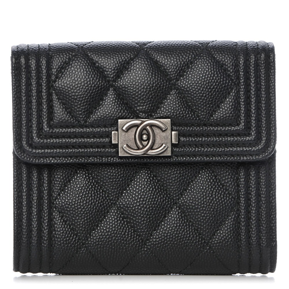 Crafted from luxurious diamond-quilted caviar leather in classic black, this stylish wallet features a small silver-tone Chanel CC lock on the front flap for a touch of elegance. Opening with a snap closure, the wallet unfolds to reveal a black interior trifold with card slots, bill folds, and a zippered coin compartment. Additionally, it boasts a convenient zippered coin compartment on the back exterior. Ideal for everyday use, this wallet combines practicality with the one-of-a-kind style synonymous with Chanel.