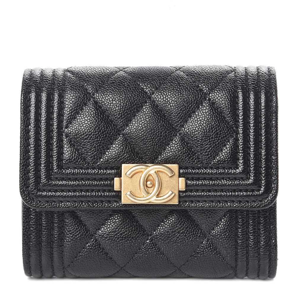Crafted from luxurious diamond-quilted caviar leather in classic black, this stylish wallet features a small silver-tone Chanel CC lock on the front flap for a touch of elegance. Opening with a snap closure, the wallet unfolds to reveal a black interior trifold with card slots, bill folds, and a zippered coin compartment. Additionally, it boasts a convenient zippered coin compartment on the back exterior. Ideal for everyday use, this wallet combines practicality with the one-of-a-kind style synonymous with Chanel.