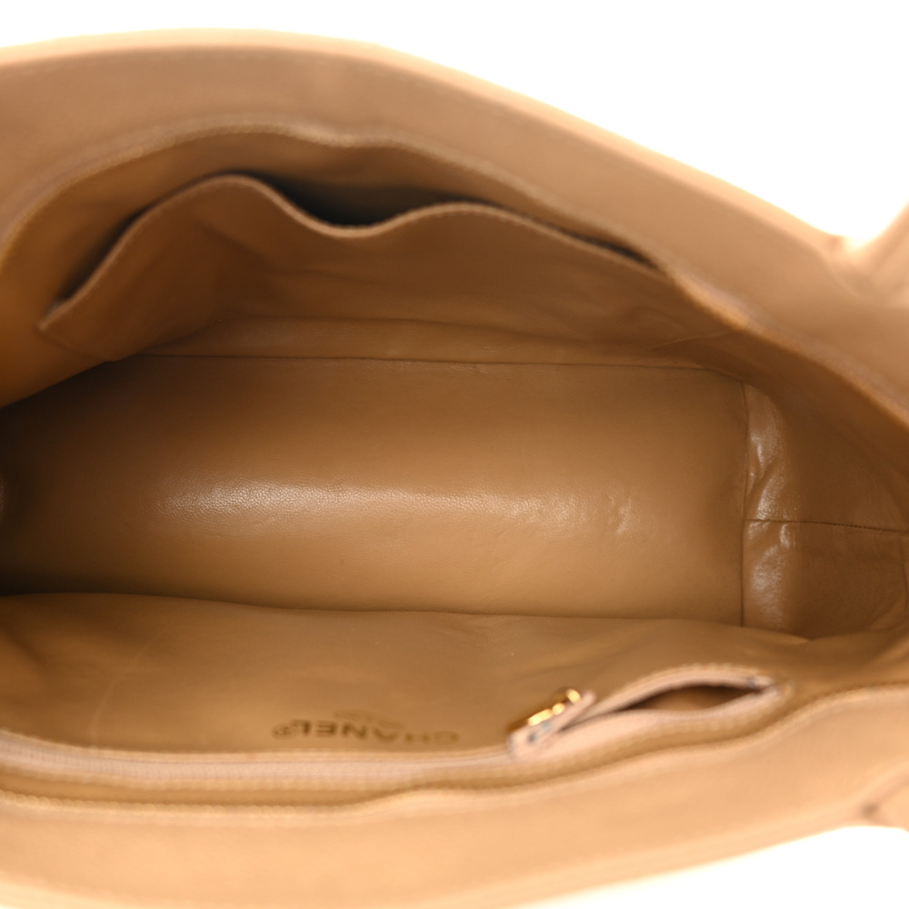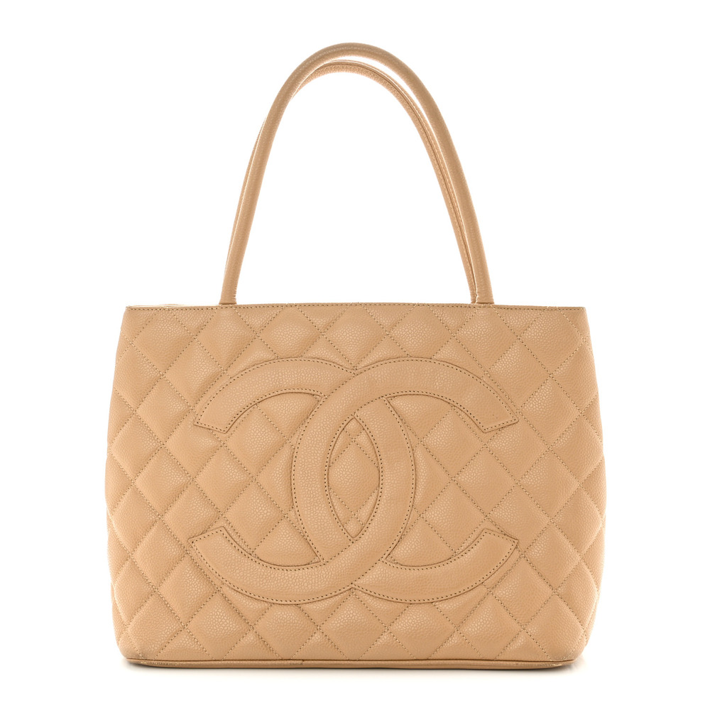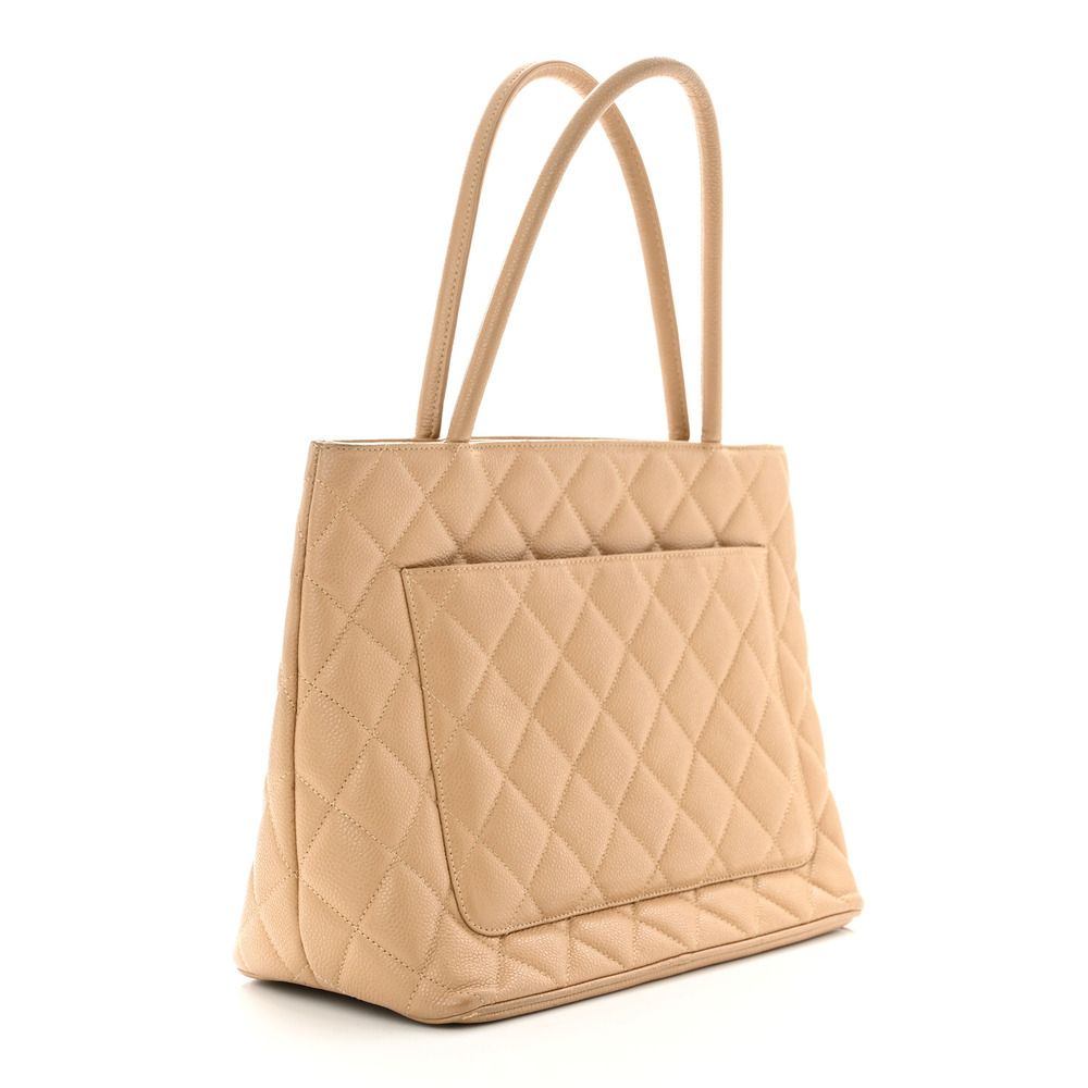 This stylish tote is beautifully crafted of diamond-quilted caviar leather in black with a prominent Chanel CC logo patch on the front. The bag features a rear patch pocket and rolled leather top handles. The gold medallion zipper pull opens the bag to a smooth black leather interior with zipper and patch pockets.