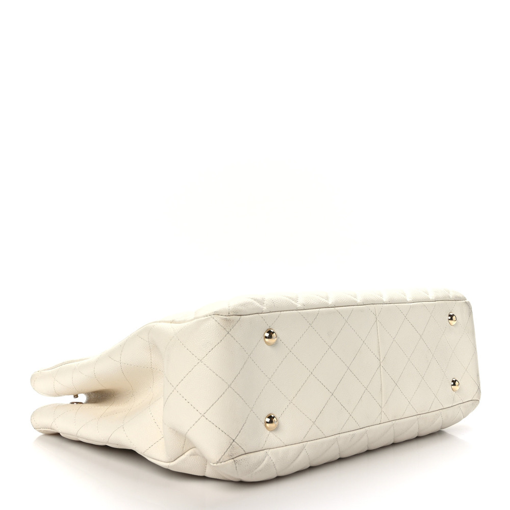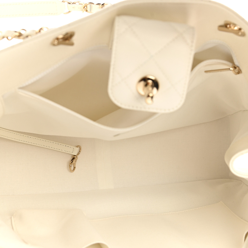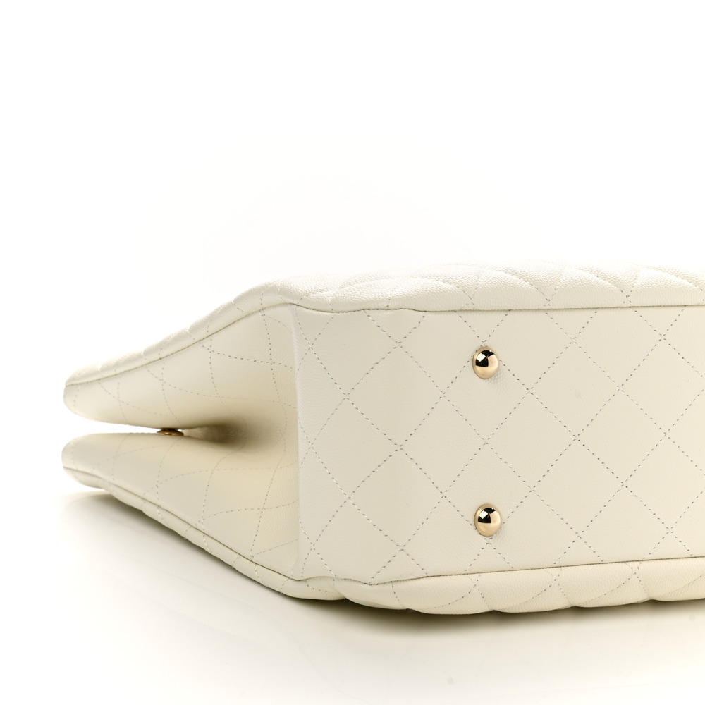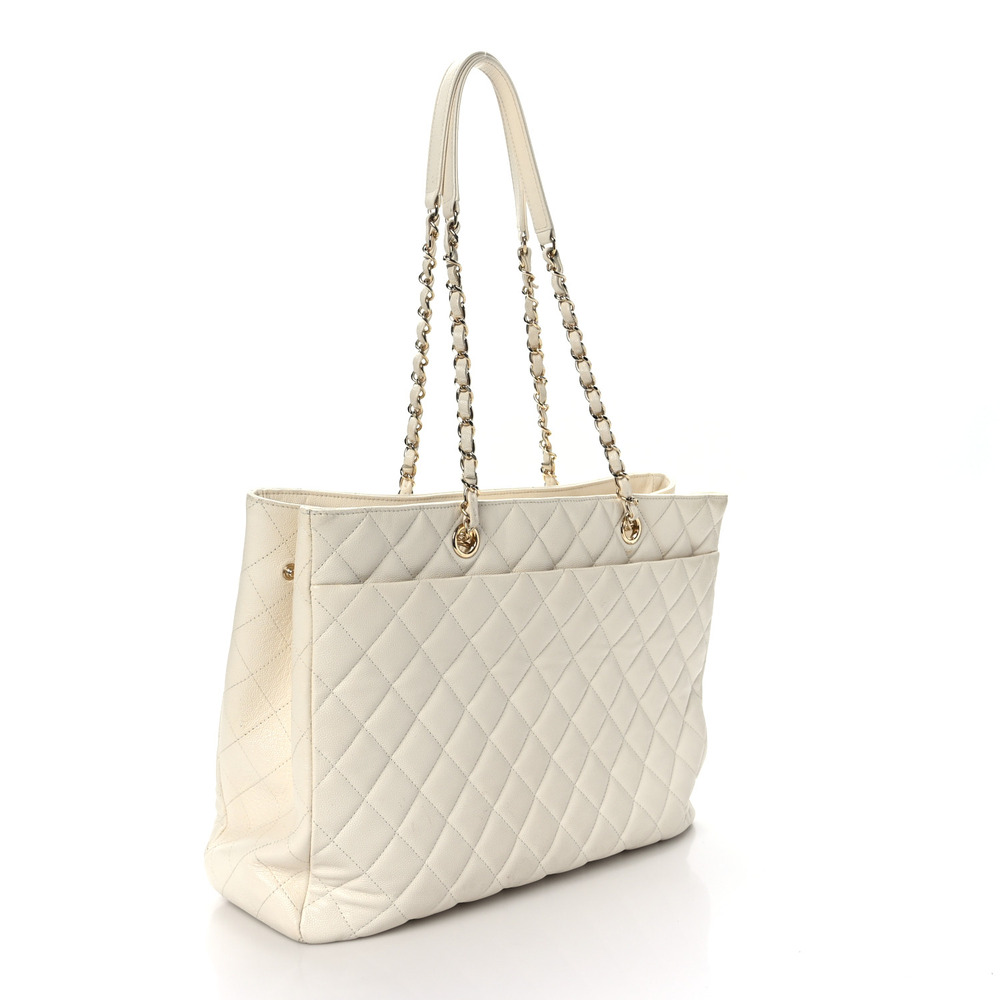 This Timeless tote bag is made of black calfskin with gold tone hardware; featuring the CC signature clasp, rear exterior slip pocket and interwoven gold tone chain link and black leather shoulder straps.