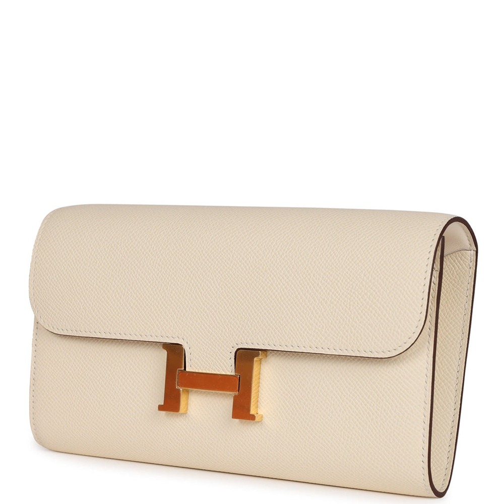 This Constance Wallet To Go is in off-white nata epsom leather with gold hardware and has tonal stitching, metal “H” snap lock closure, open front compartment and removable crossbody strap.The interior is lined with off-white leather and two main compartments with six credit card slots and a zippered center compartment with Hermes H lock pull.