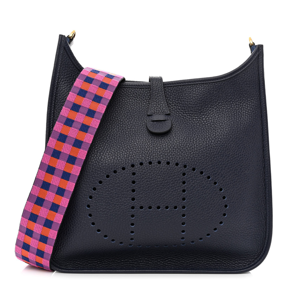 This Evelyne is in Vert Cypress Clemence leather with palladium hardware, has tonal stitching, pull tab top closure and a multicolored removable canvas and leather shoulder/crossbody strap.