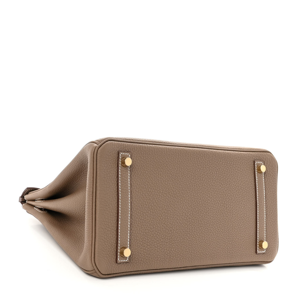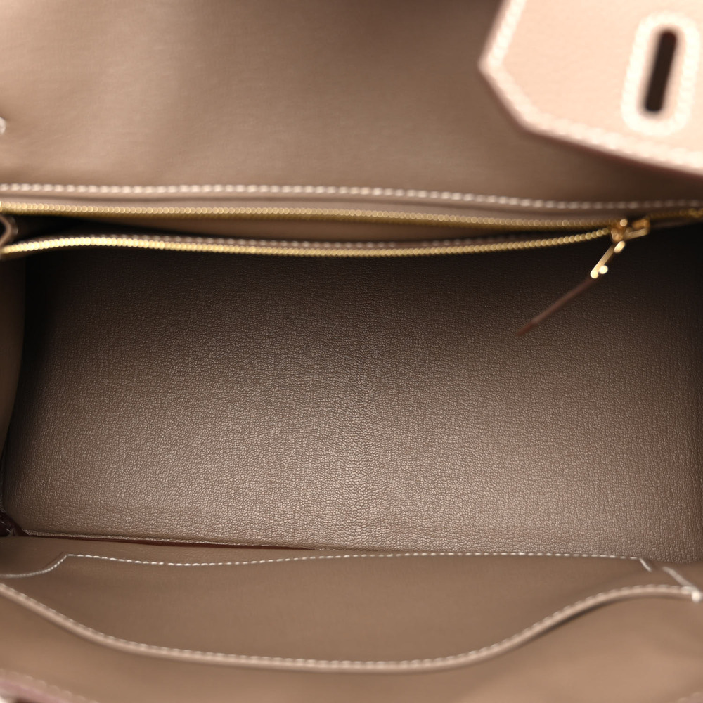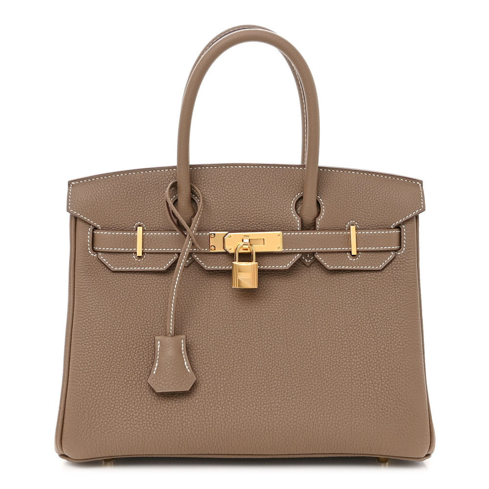 This iconic handbag is finely crafted of grained calfskin leather in taupe. The bag features rolled leather top handles, a leather belt, and polished gold plated hardware, including a turn lock, a padlock, and a hanging clochette with keys. The front flap opens to a matching goatskin leather interior with zipper and patch pockets.