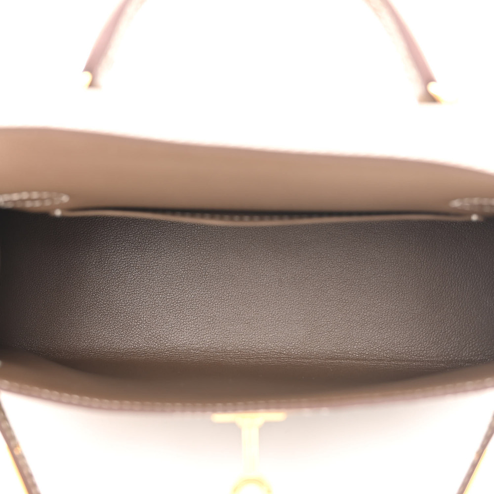 This stunning Hermes classic handbag is beautifully crafted in stamped epsom calfskin leather in taupe. A single rolled leather top handle is secured with gold plated hardware and an optional leather shoulder strap is included. The traditional Kelly turn lock secures the small flap. The interior features a matching chevre goatskin leather with a single flat pocket.