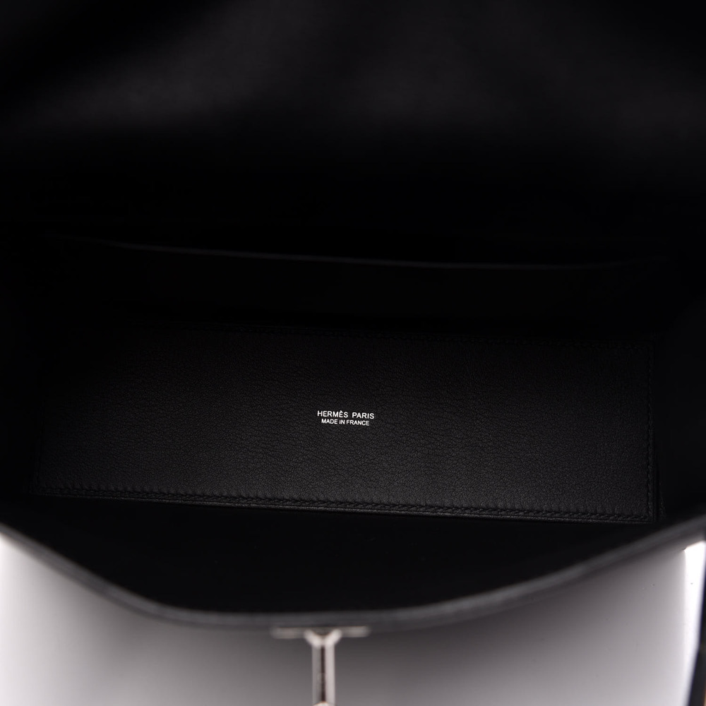 This chic waist bag is finely crafted of smooth black Evercolor leather. This belt bag features an adjustable strap and a frontal flap with a classic palladium plated Hermes Kelly turn-lock that opens to a matching black leather interior with a small patch pocket and a removable base.