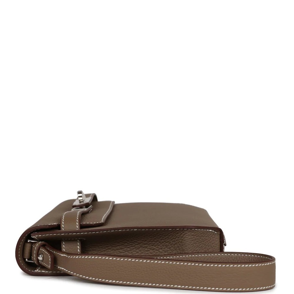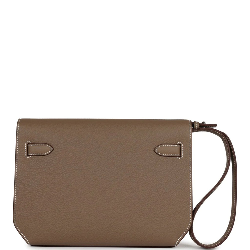This Kelly Depeches Pouch 25 is in Etoupe togo leather with palladium hardware, has contrast stitching, front flap and two straps with front toggle closure.