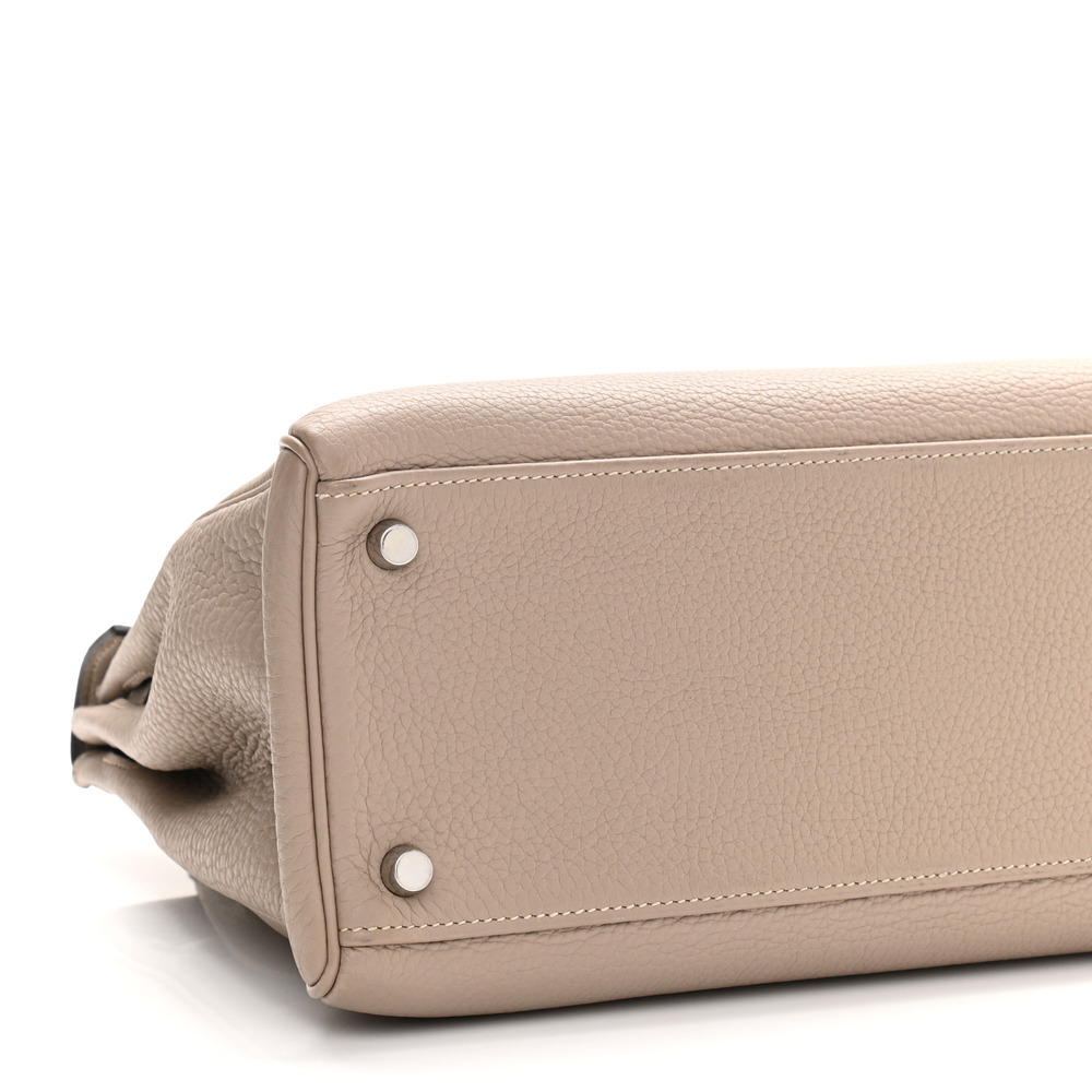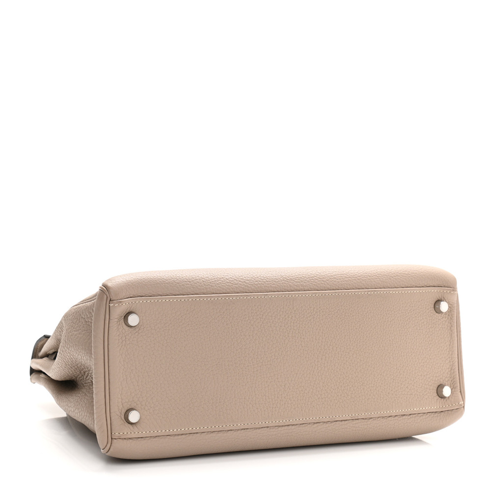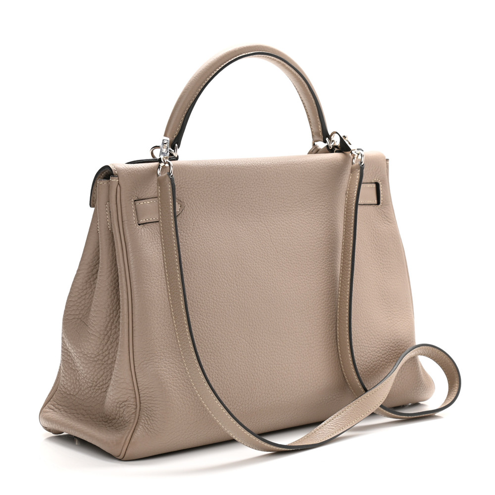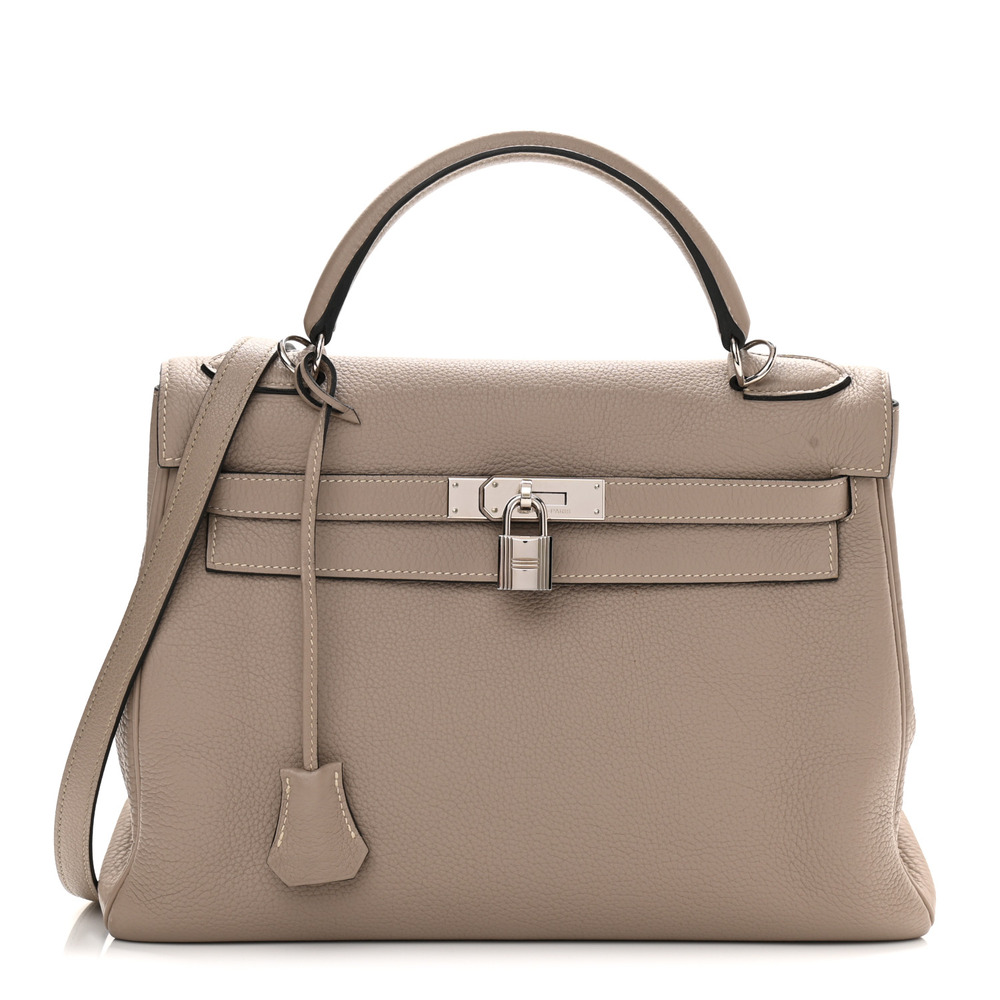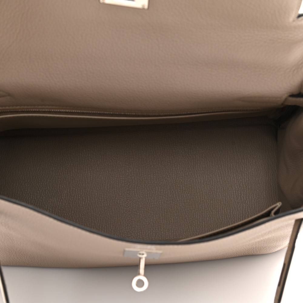This Kelly handbag is crafted of richly textured calfskin leather in light gray. The bag features a reinforced leather top handle with silver palladium hardware links. This Included an optional leather shoulder strap, and the signature Kelly padlock. The front flap opens to a matching matte leather interior with zipper and patch pockets.