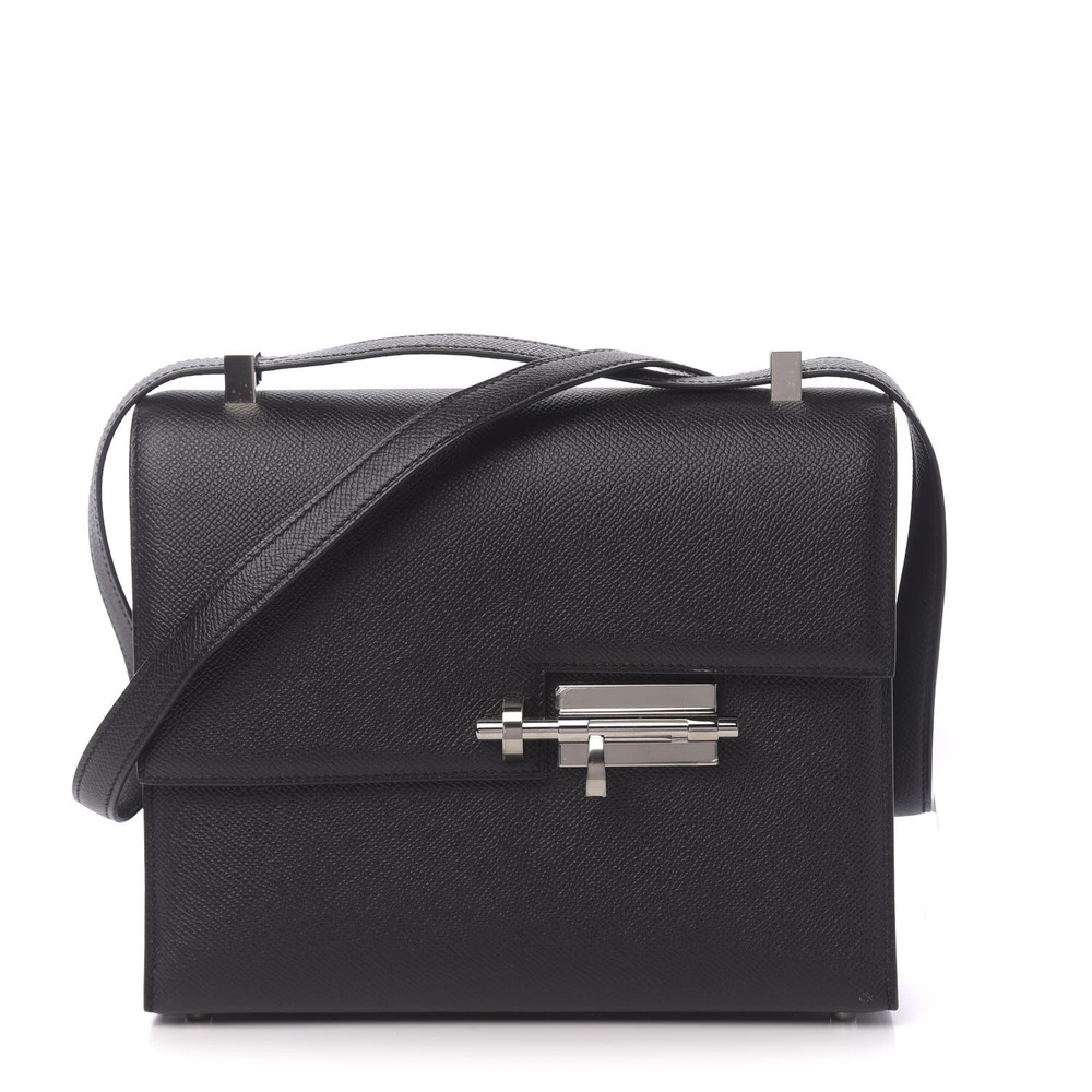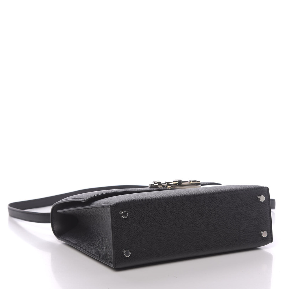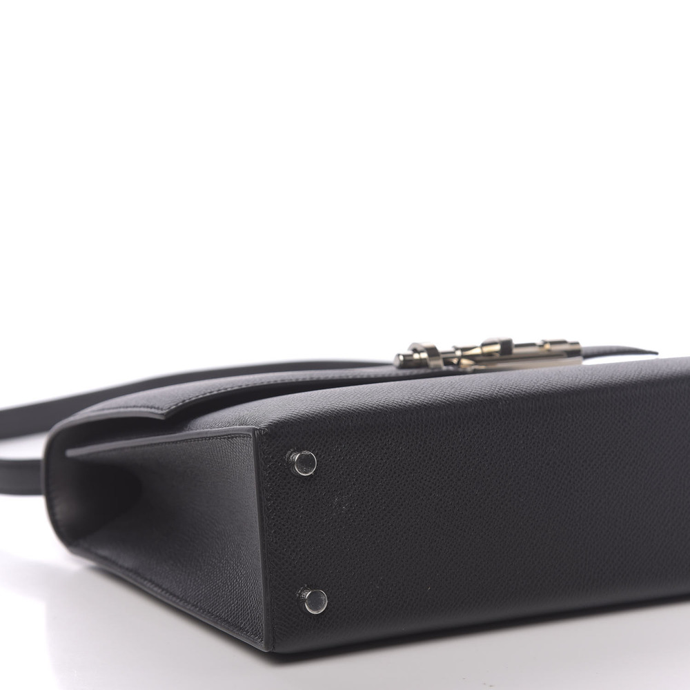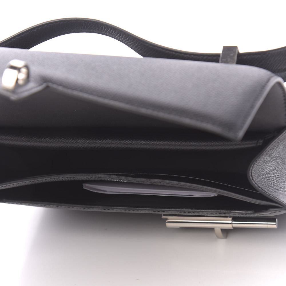 This is a chic small bag that is finely crafted of luxurious epsom calfskin leather in a grey. The shoulder bag features a leather cross body shoulder strap, expandable sides, a front flap, and a polished silver plated Hermes H logo. The flap opens to a partitioned matching leather interior with a patch pocket.