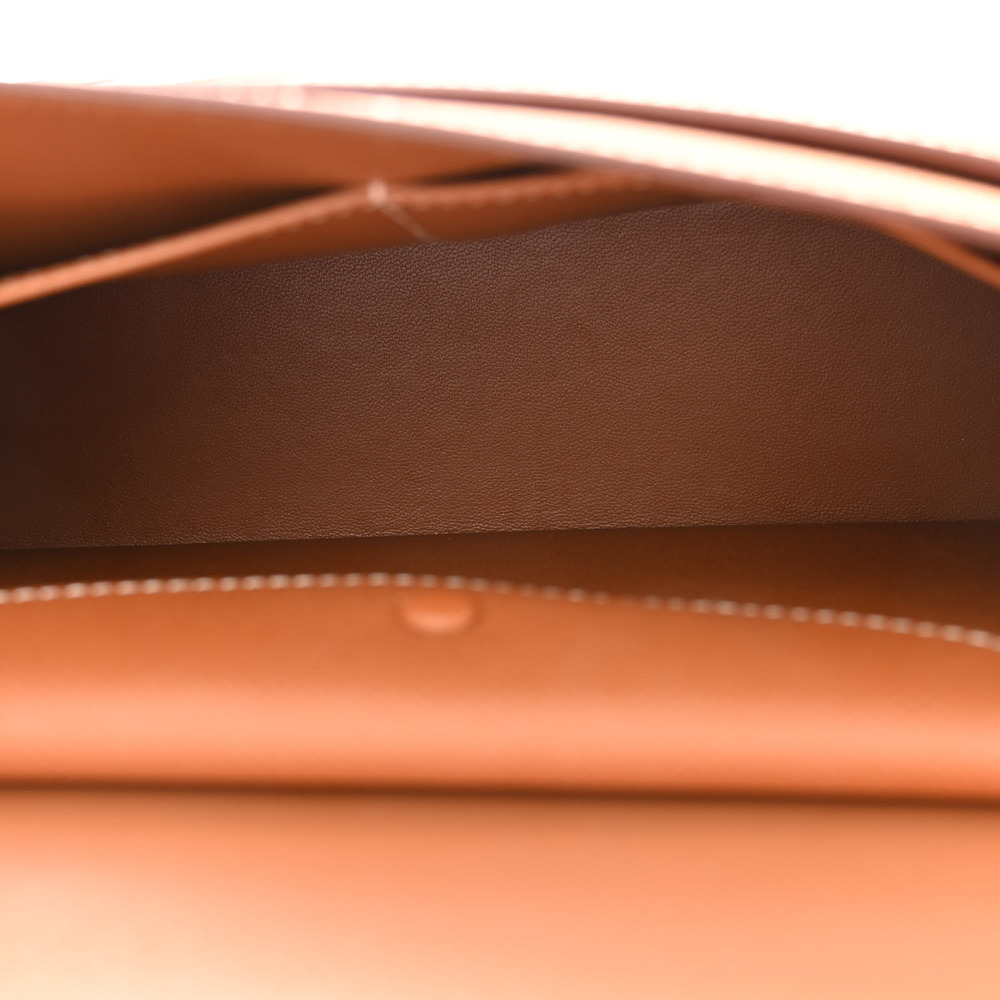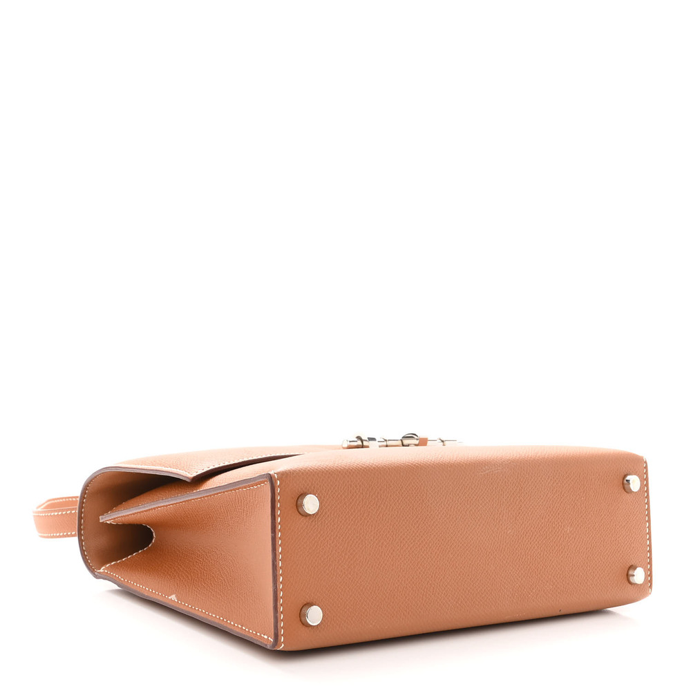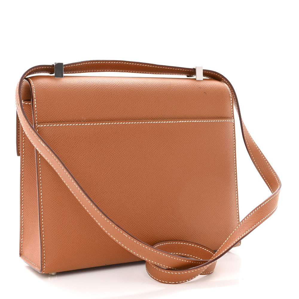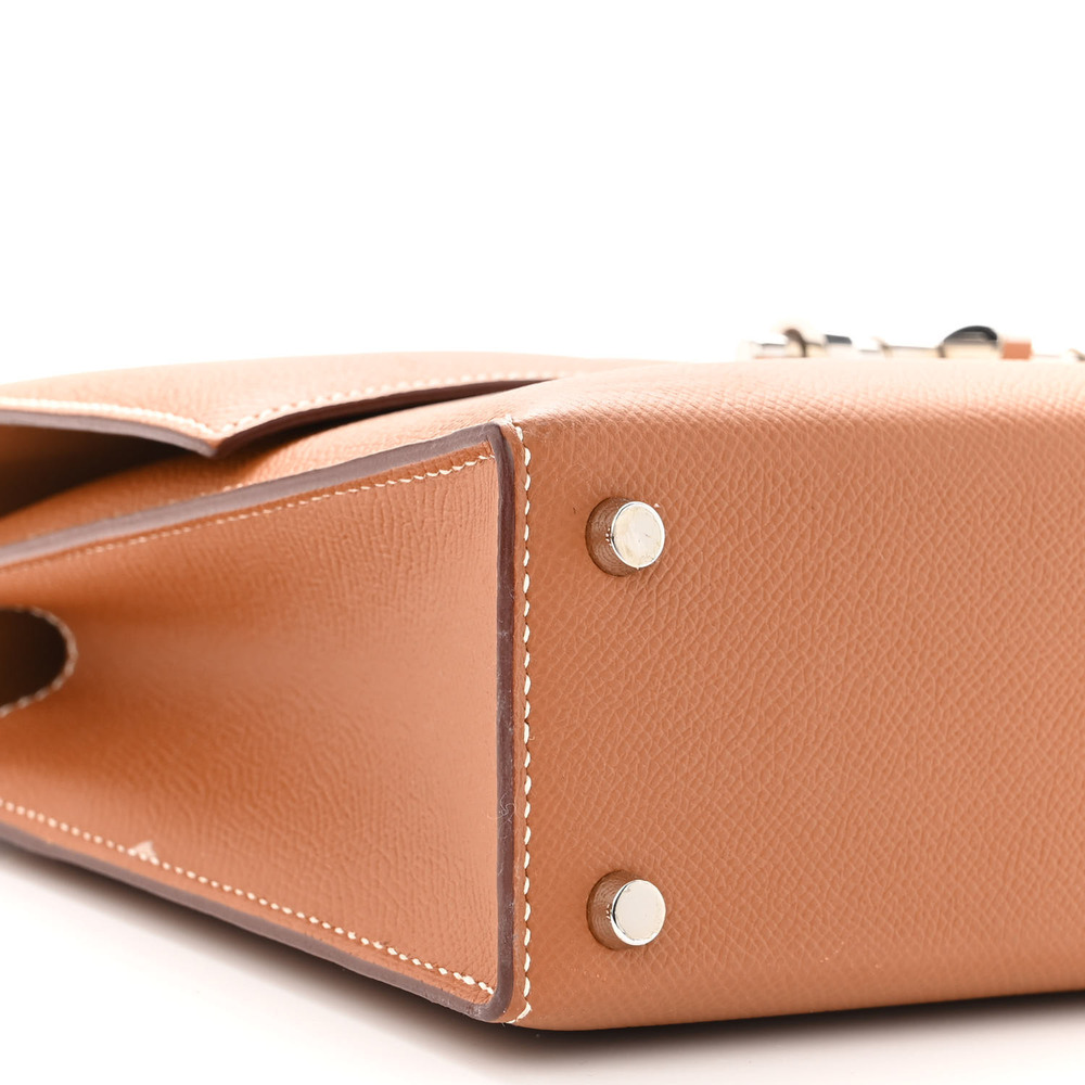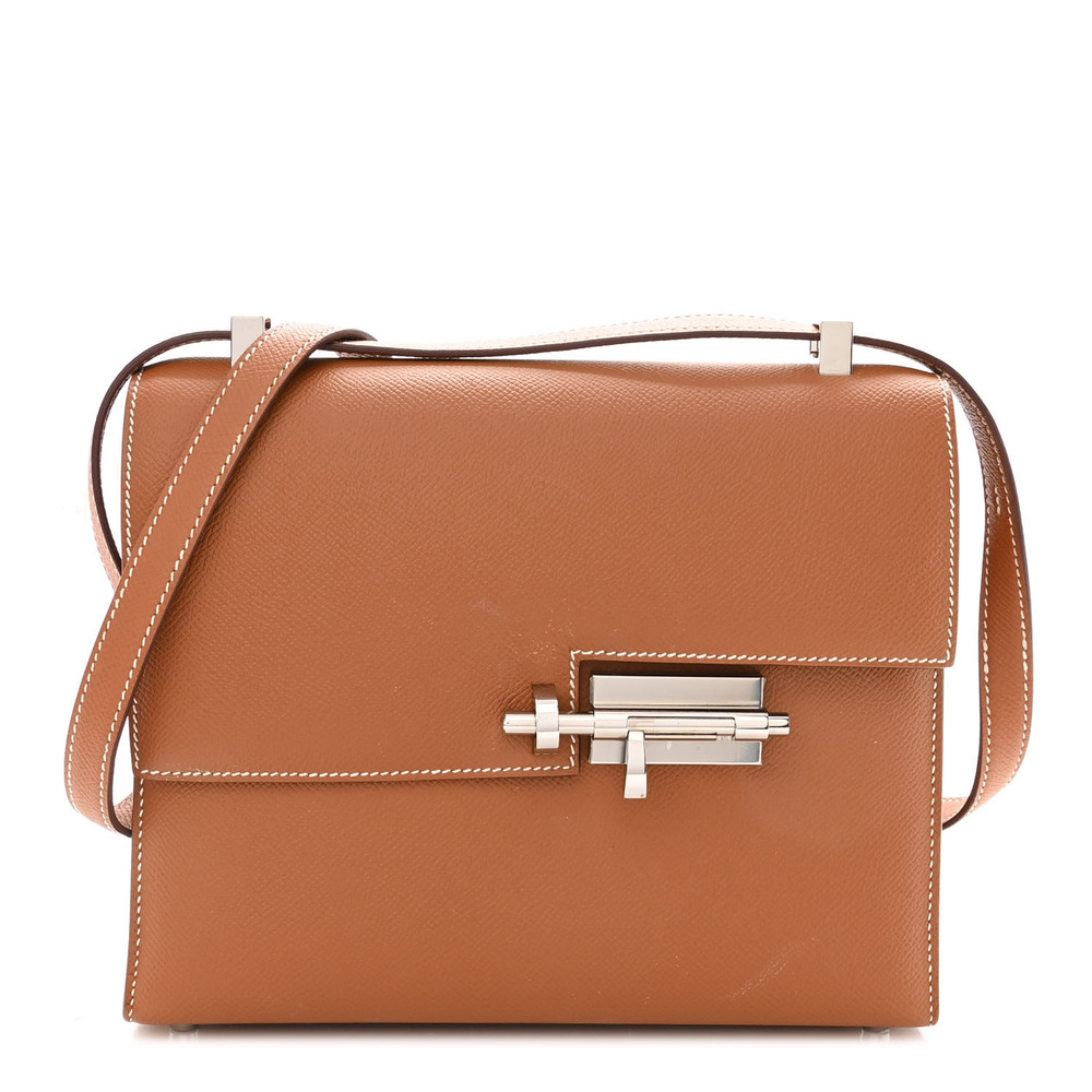 This is a chic small bag that is finely crafted of luxurious epsom calfskin leather in a grey. The shoulder bag features a leather cross body shoulder strap, expandable sides, a front flap, and a polished silver plated Hermes H logo. The flap opens to a partitioned matching leather interior with a patch pocket.