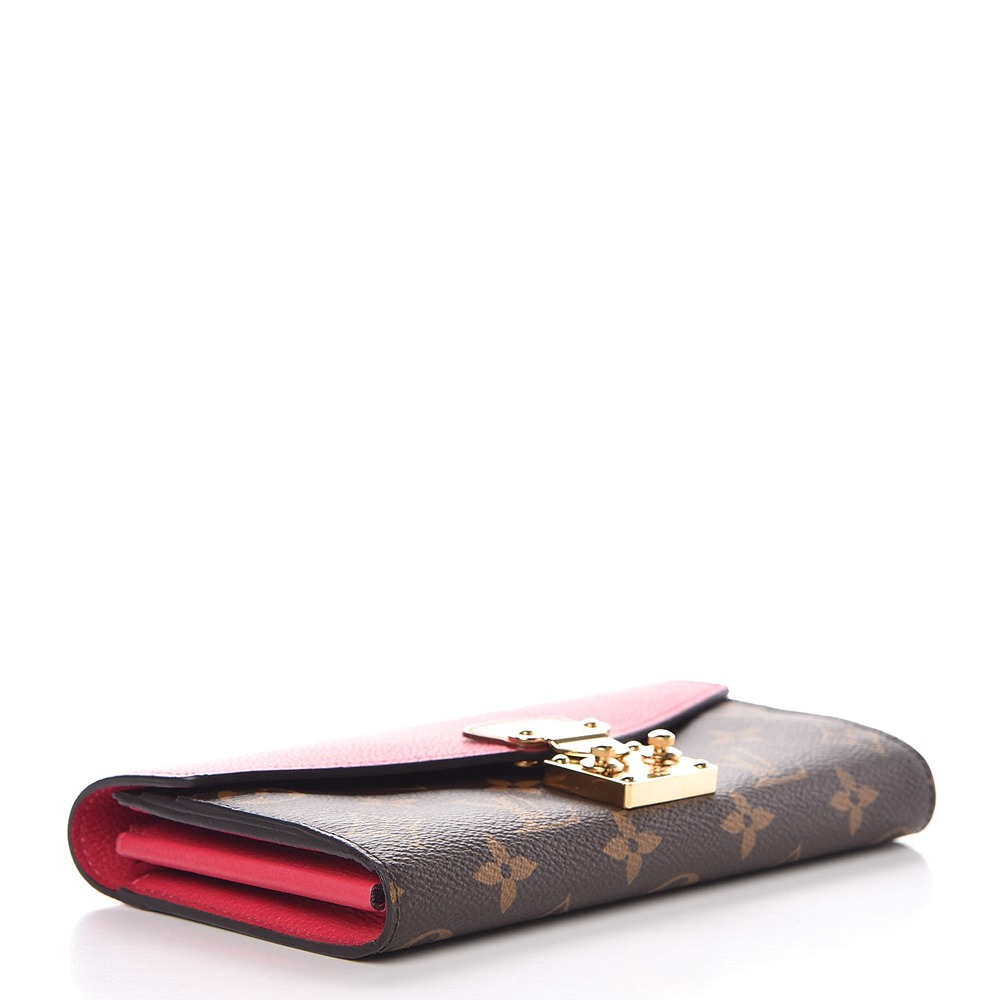 Louis Vuitto NeoNoeam Pallas Wallet in Dahlia. This stylish clutch wallet is crafted of Louis Vuitton classic monogram on toile canvas and has a frontal flap in coral pink leather that opens with a leather tab and a polished brass clasp. The interior is a pink partitioned leather interior with a central dividing zipper pocket and card slot panels. This is an excellent clutch wallet, ideal for everyday use, from Louis Vuitton!