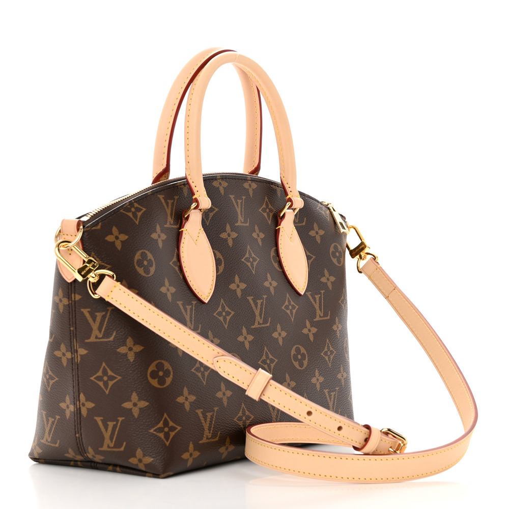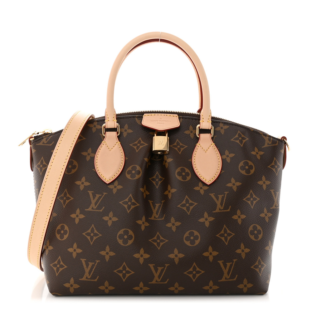The Bo??tie PM zipped tote is made from Monogram canvas with natural leather trim and a vivid Bordeaux textile lining. An ideal everyday bag thanks to its supple and body-friendly design, it features a double smartphone pocket as well as an inside flat pocket. It?s finished with a gold-color padlock and an LV-embossed leather patch.