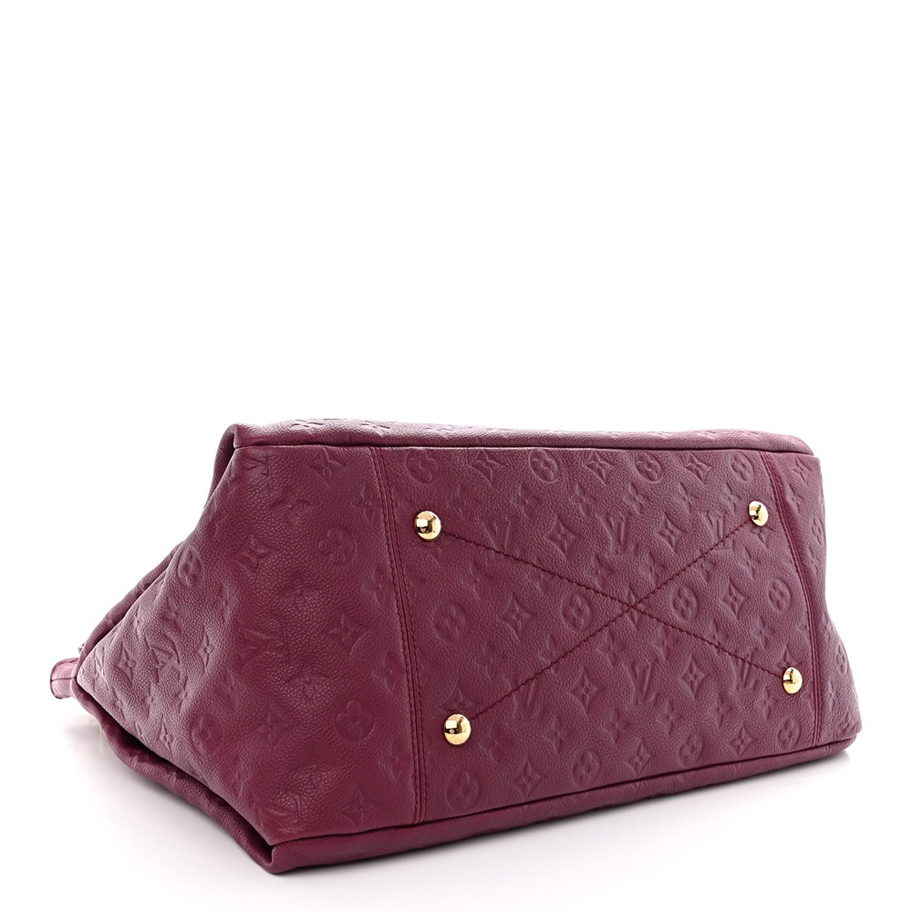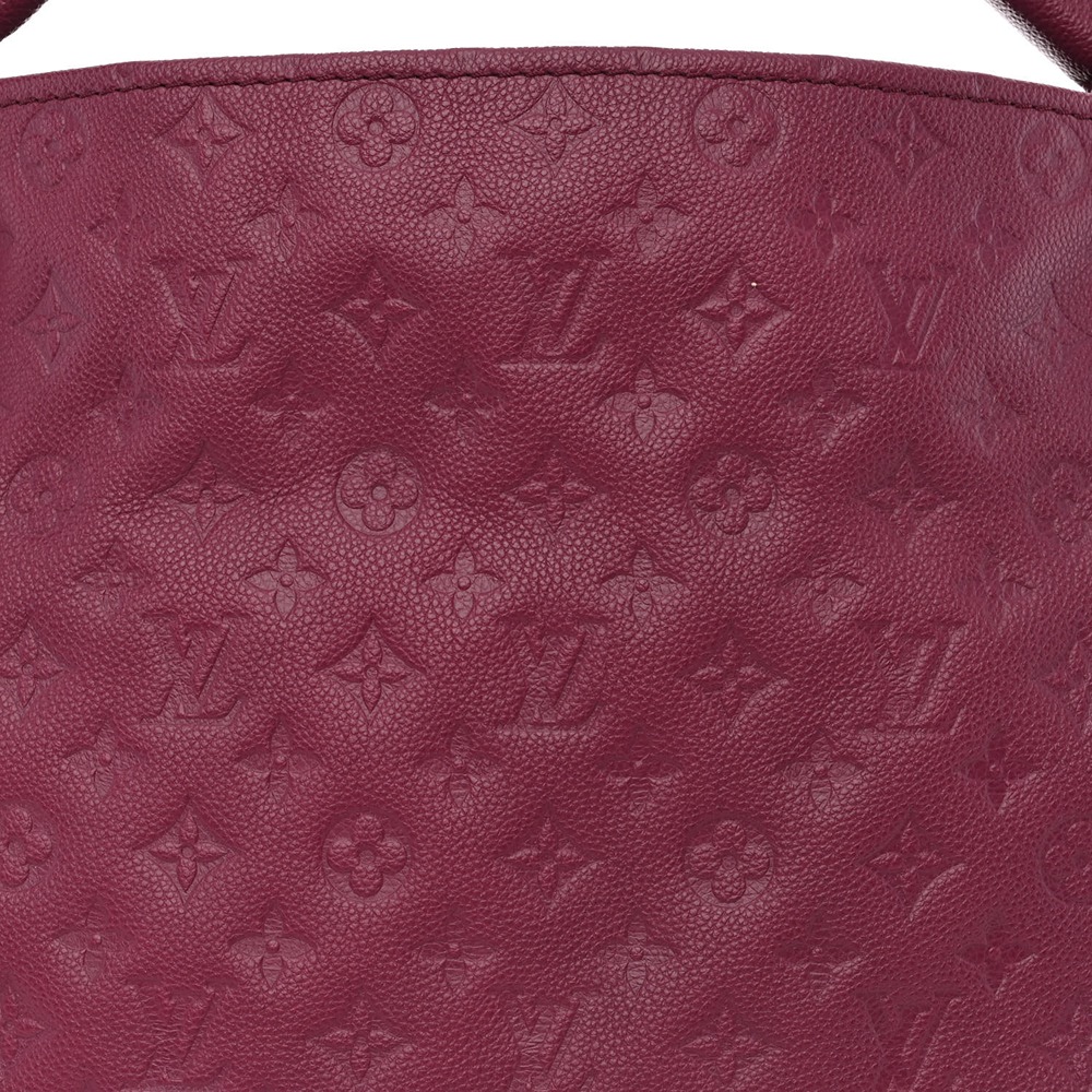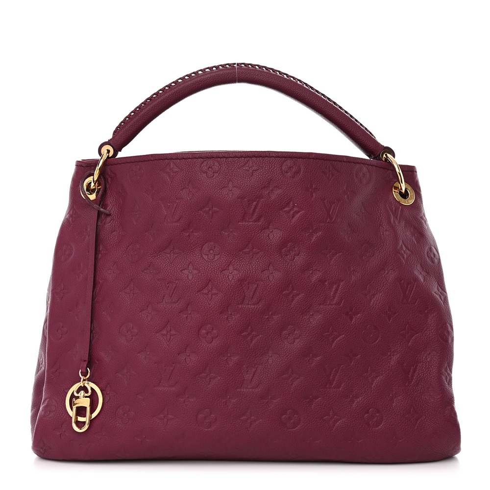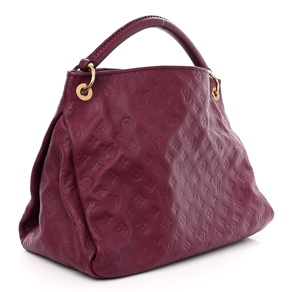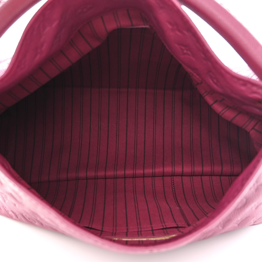 Louis Vuitton Empreinte Artsy MM in Aurore. This stunning shoulder bag is crafted of Louis Vuitto NeoNoeam embossed leather in dark pink. The bag features a thick looping leather shoulder strap with a woven detail and polished gold hardware. The top is open to a dark red striped fabric interior with zipper and patch pockets.