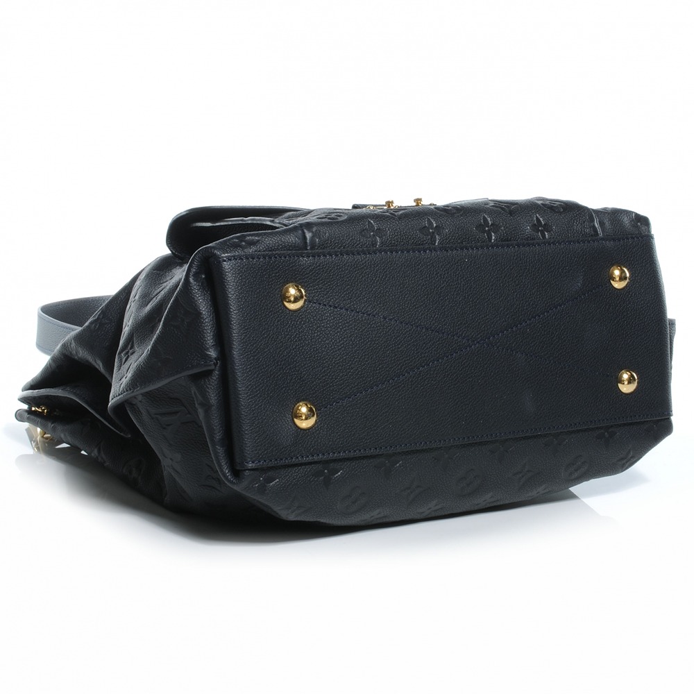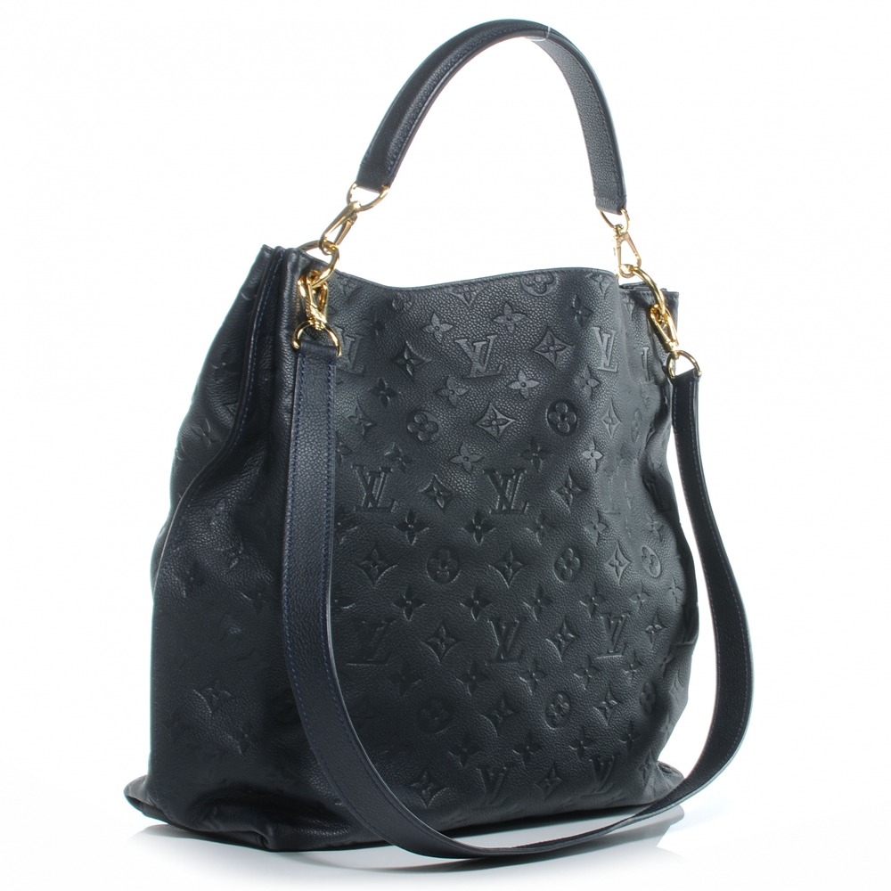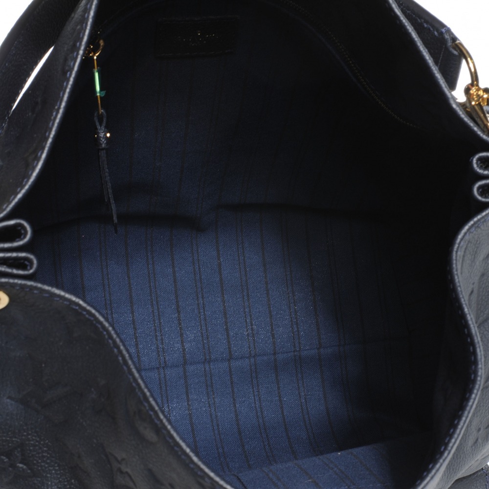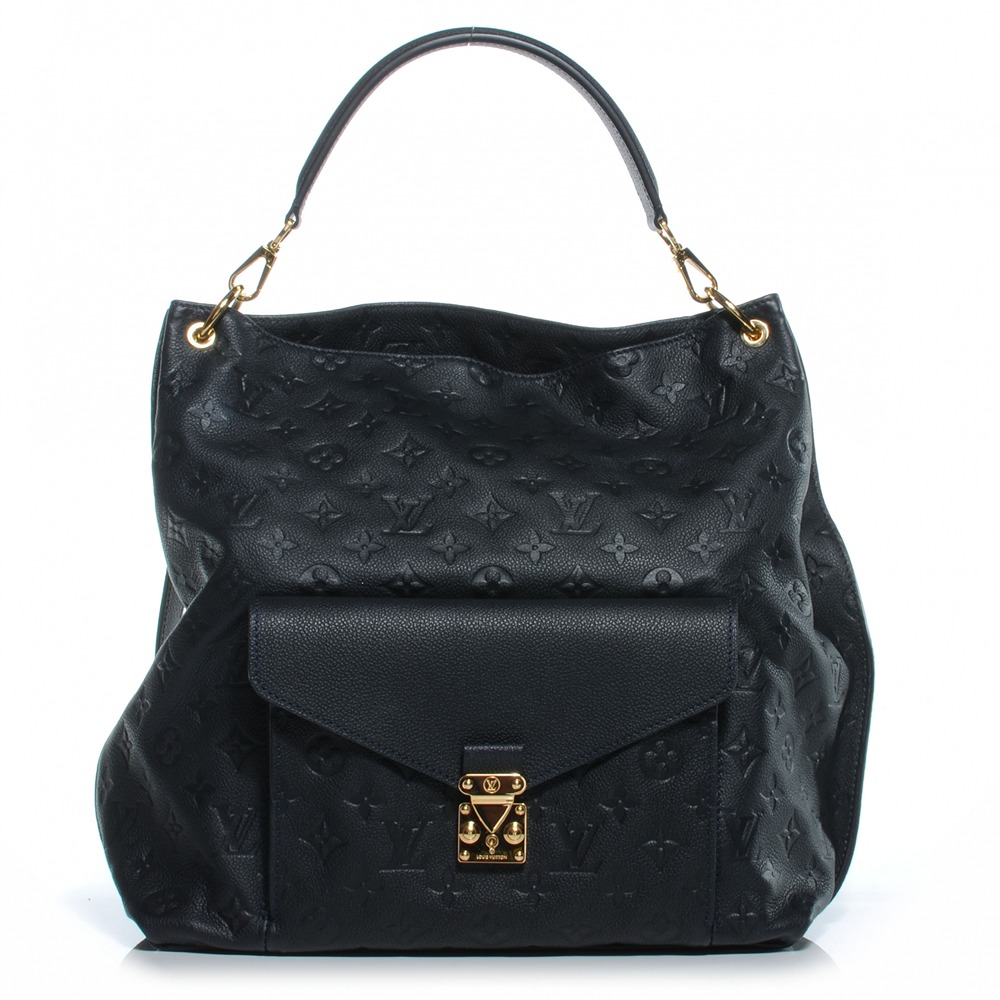 This is an Louis Vuitto NeoNoeam Empreinte Metis in Infini. This stylish hobo is finely crafted of rich leather embossed with the LV monogram. The bag features a removable matching leather handle, adjustable and interchangeable shoulder strap, a front envelope pocket, polished brass hardware, and protective bottom studs. The top is open to a blue striped fabric interior lining with zipper and patch pockets. This is a marvelous hobo that is ideal for day with the luxury and style, from Louis Vuitton!