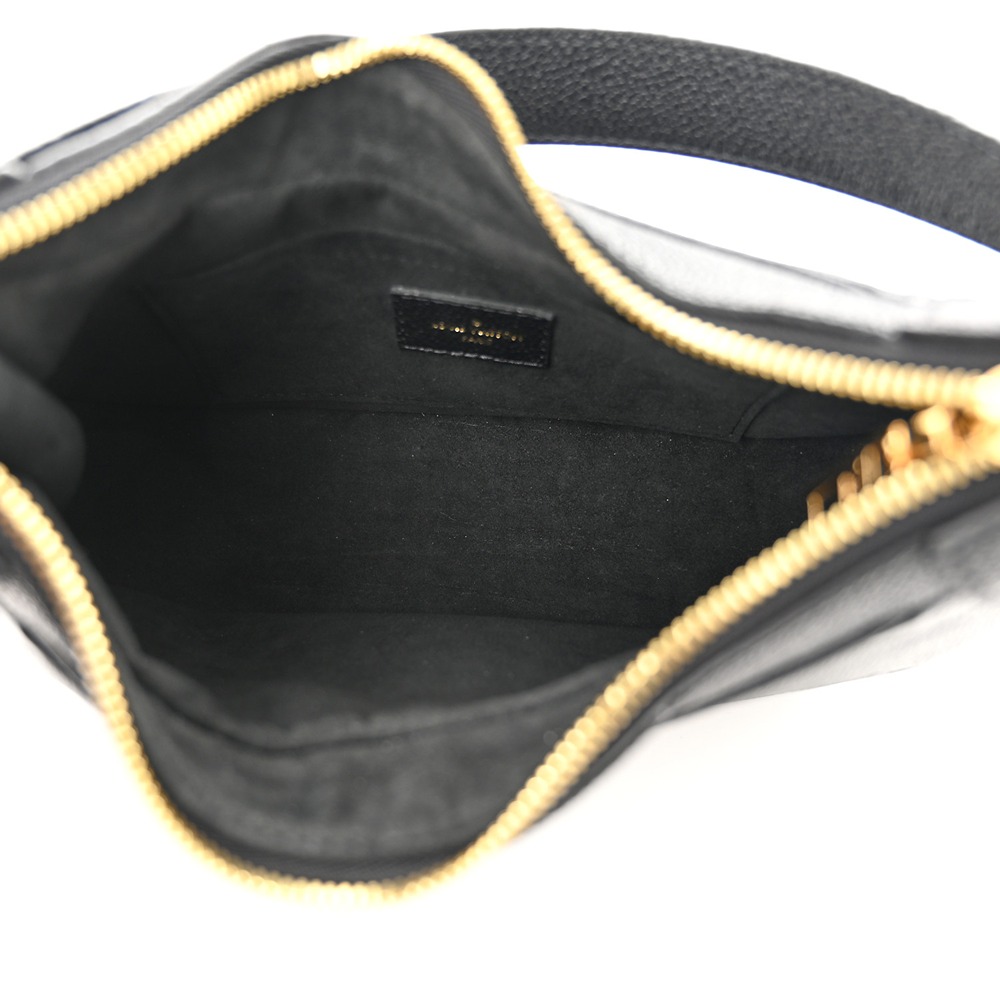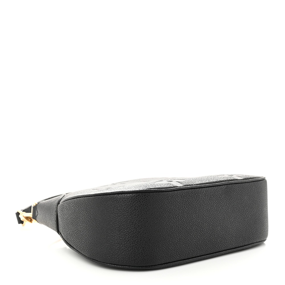 Indulge in luxury with the Louis Vuitton Empreinte Monogram Giant Bagatelle NM in Black. This chic shoulder bag boasts an oversized Louis Vuitto NeoNoeam print on grained calfskin leather, creating a statement of elegance. The bag features a light beige adjustable leather strap handle and an optional matching adjustable shoulder strap adorned with polished gold-tone hardware. Unzip the top to reveal a beige microfiber interior with a convenient patch pocket.