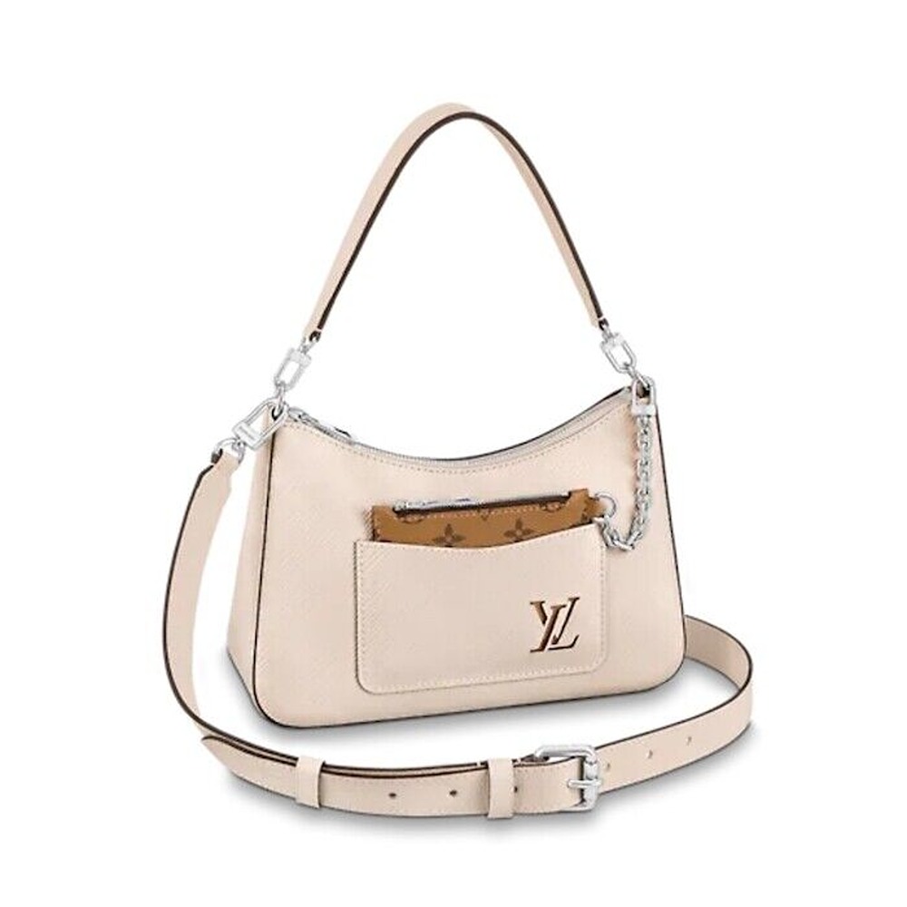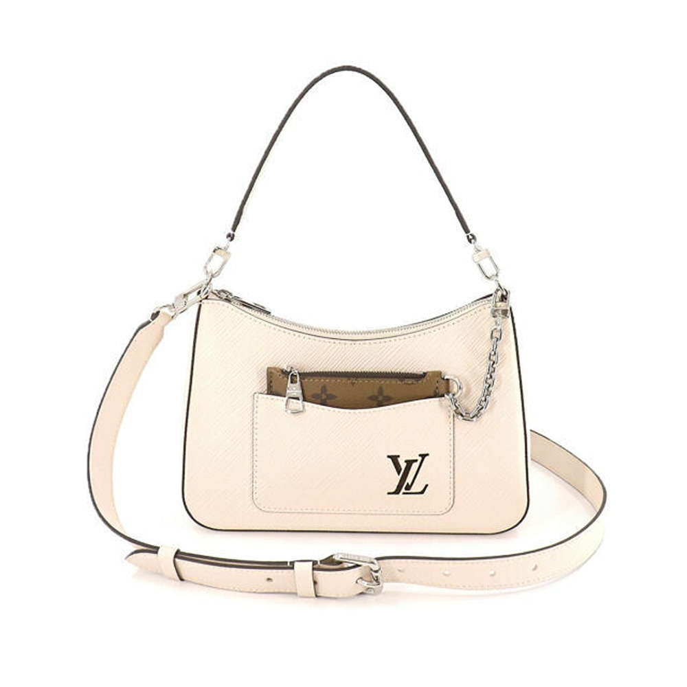 Elevate your style with the Louis Vuitton Epi Marelle Bag. Crafted from luxurious cowhide leather, this off-white bag features a spacious interior, silver hardware, and comes with versatile carrying options including an adjustable, removable crossbody strap