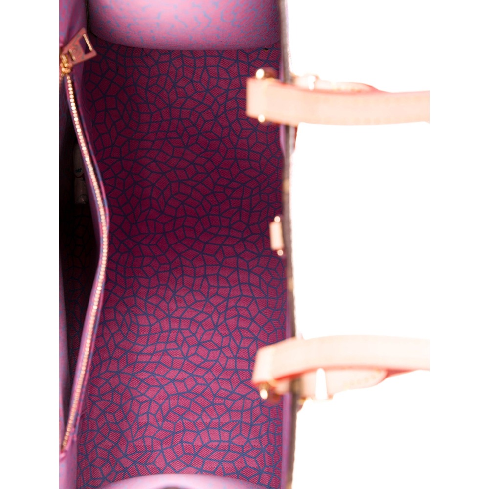 This Louis Vuitton Tote showcases an exquisite blend of sophistication and whimsy with its brown coated canvas featuring a vibrant floral Monogram Pumpkin Dots print. The brass hardware complements the design, enhancing its allure. It offers versatility with both rolled handles and dual shoulder straps, while the leather trim embellishment adds a luxurious touch. Inside, the tote boasts a canvas lining with three spacious interior pockets, ensuring practical organization. The clasp closure at the top keeps belongings secure while maintaining an elegant aesthetic