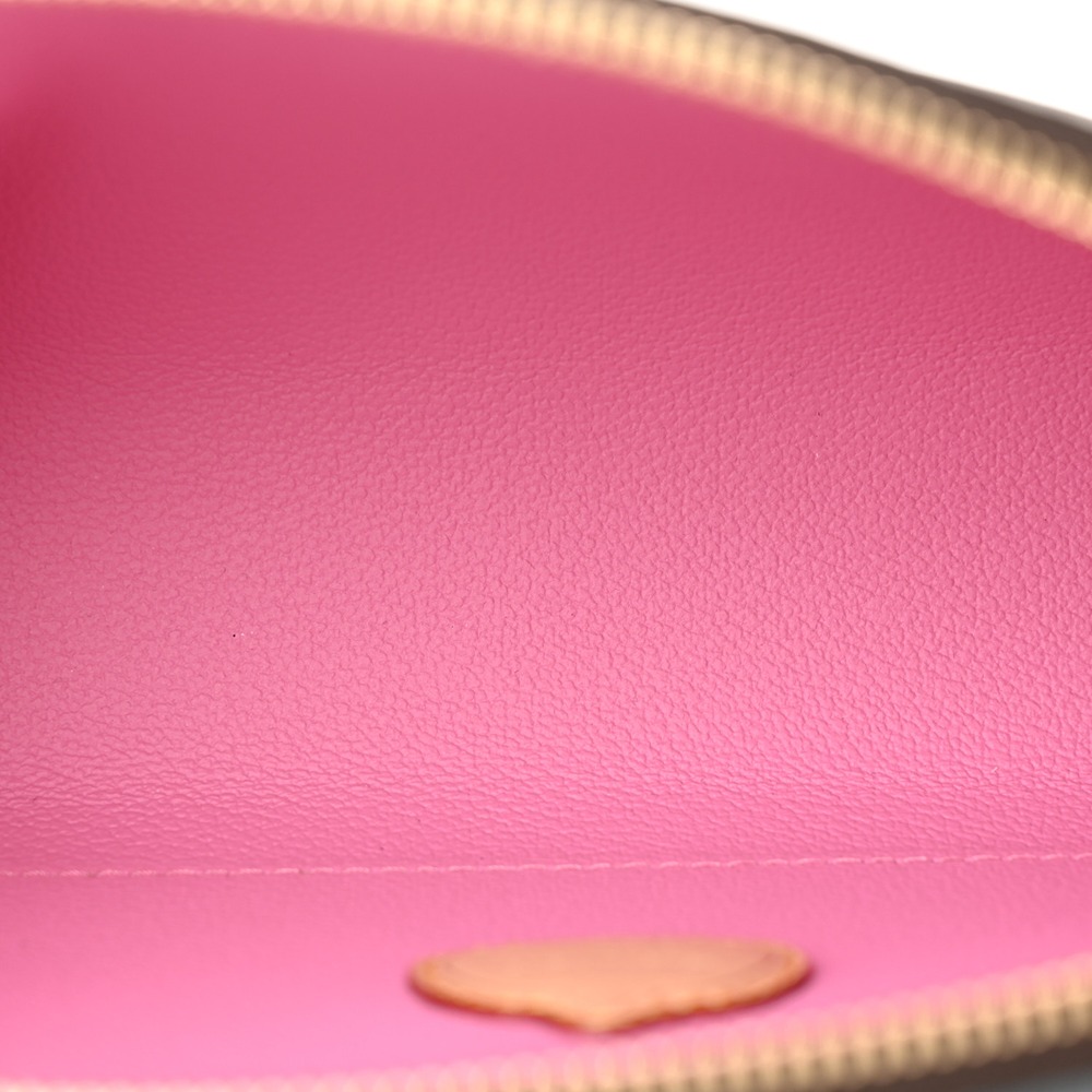 Authentic LOUIS VUITTON LV X YK Monogram Printed Kusama Pumpkin Cosmetic Pouch. This travel-friendly accessory is crafted from Louis Vuitto NeoNoeam on coated canvas, adorned with multicolored printed pumpkin designs on the front and back. The pouch features a top overextended zipper, revealing a spacious pink leather-like interior with a convenient patch pocket