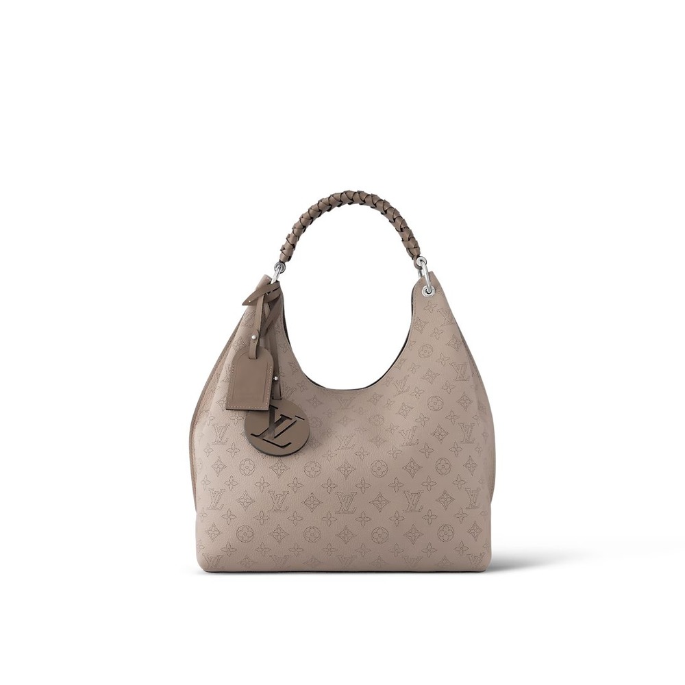 The Carmel hobo bag is made from Mahina calfskin, with the Monogram pattern delicately perforated into the leather. Lightweight and supple but roomy enough for daily necessities, this is a great everyday bag. The braided leather handle enables elbow and shoulder carry. The bag is signed with a leather name tag and LV charm.