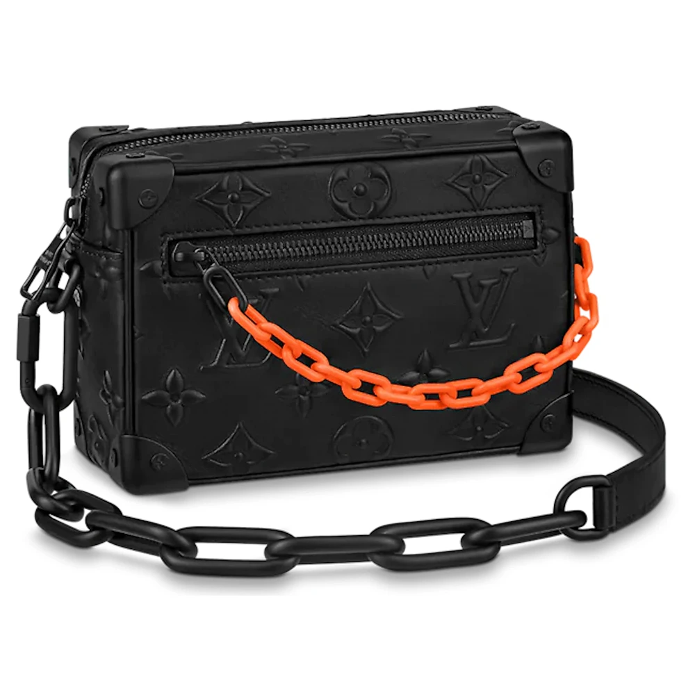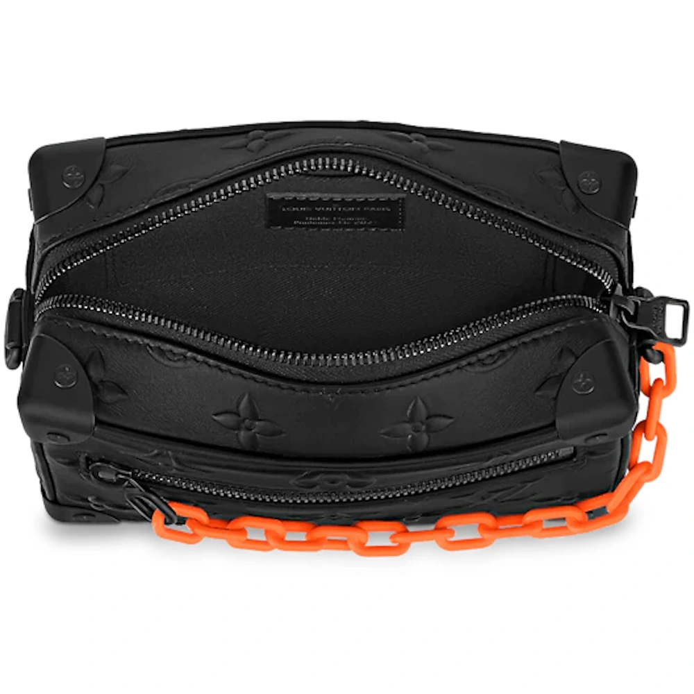 With its riveted corners and boxy shape, the Mini Soft Trunk bag in black Monogram-embossed Taurillon leather is a direct descendent of Louis Vuitton?s original trunks. The two matte-black chains, one connected to the zipper and the other serving as part of the shoulder strap, bring modernity to this small bag.