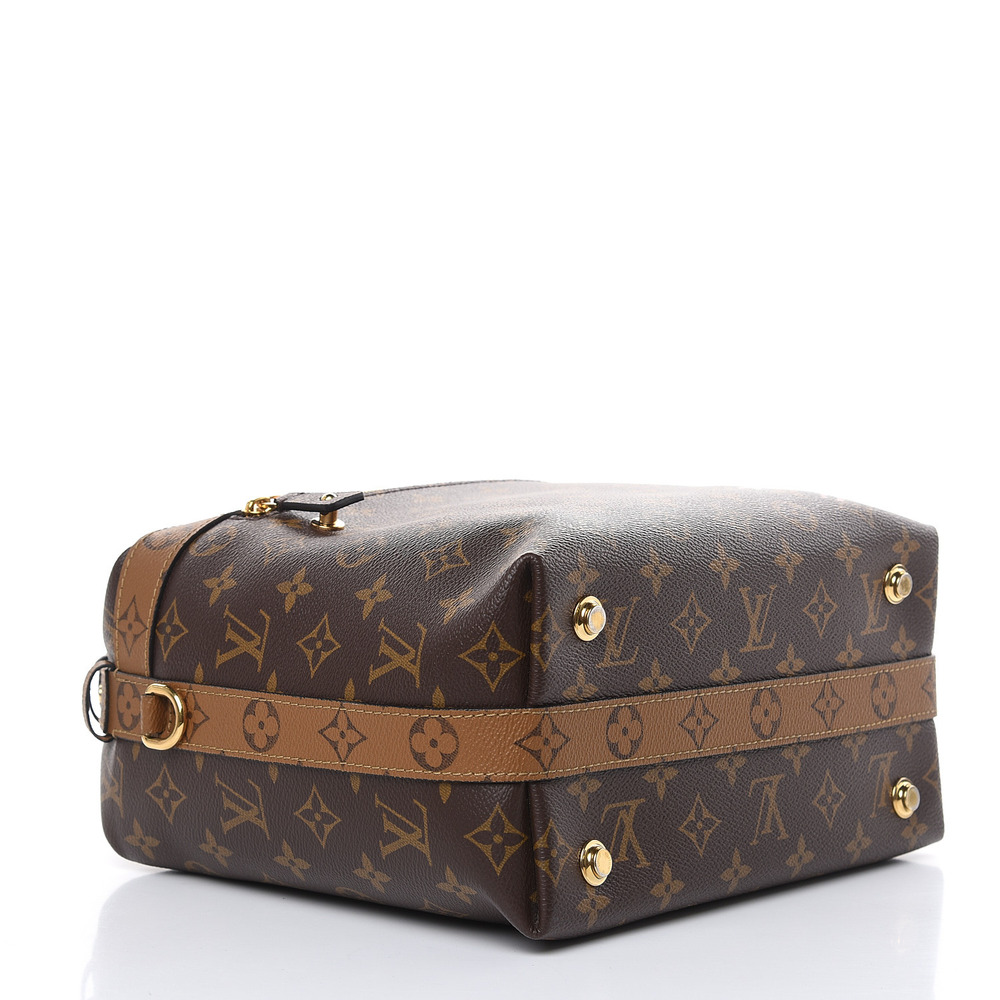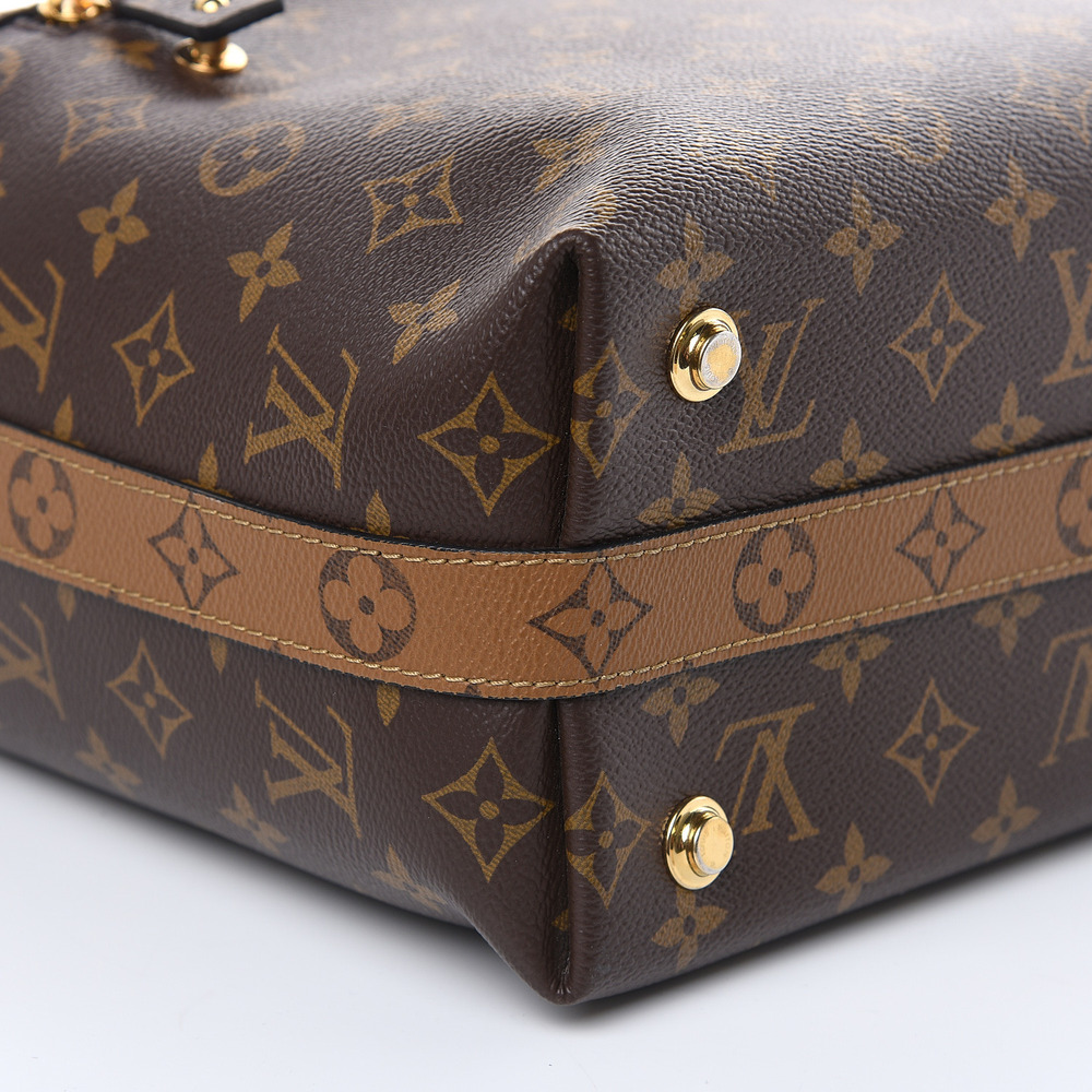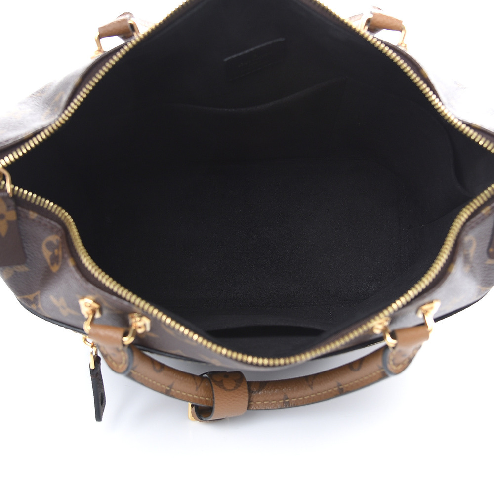 This chic handbag is finely crafted of Louis Vuitto NeoNoeam toile canvas. The bag features a lighter brown canvas trim and top handle, a front exterior zipper pocket and a closing strap with polished brass hardware. The top zipper opens to a black microfiber interior with patch pockets. This is the perfect handbag for everyday essentials, from Louis Vuitton!
