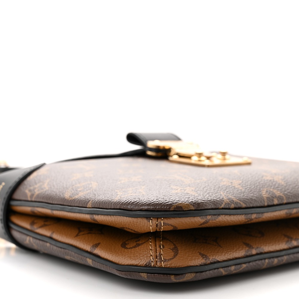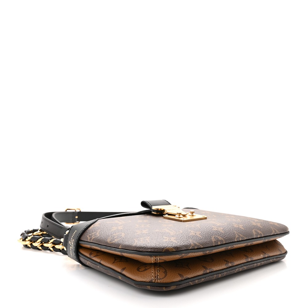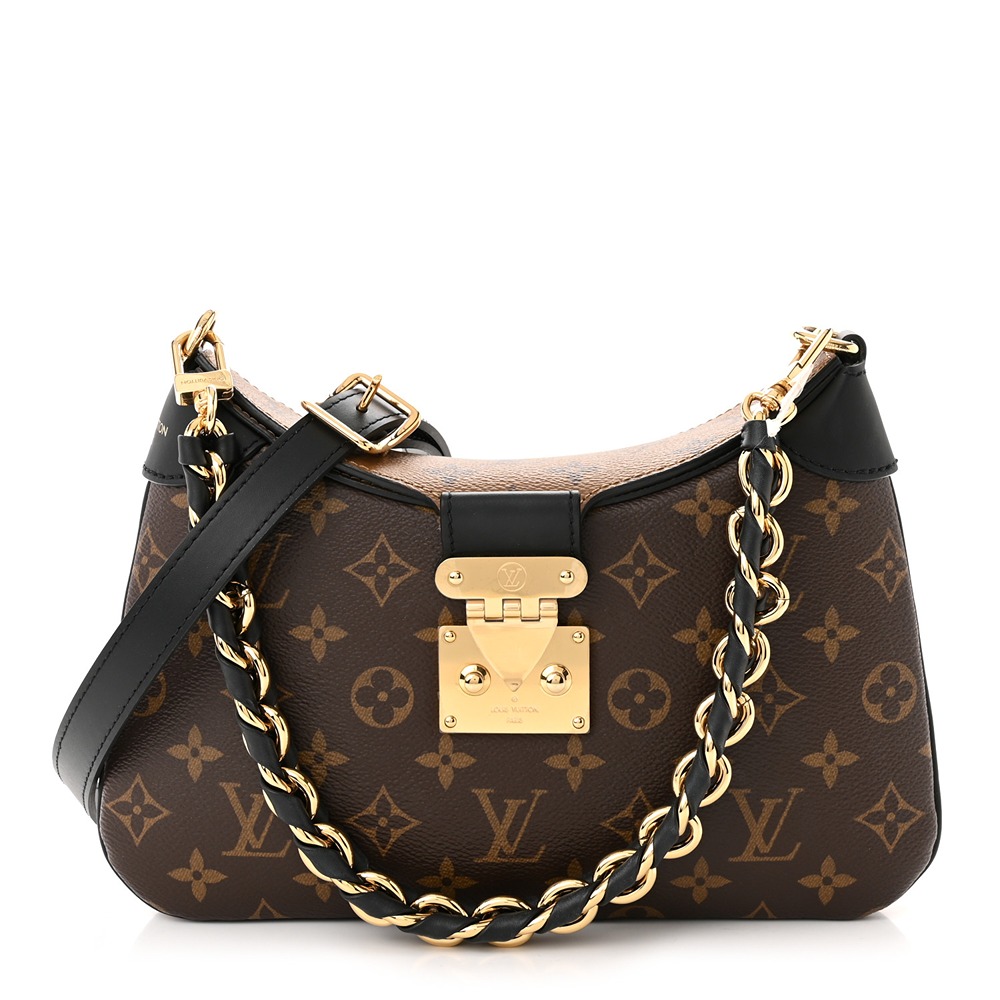Louis Vuitton Reverse Monogram Twinny, featuring the classic Louis Vuitto NeoNoeam printed in brown on coated canvas. The bag showcases a distinctive moon-shaped opening, an adjustable black leather strap, a leather-threaded gold chain strap, and polished gold hardware. The top opens to a spacious black fabric interior with zipper and patch pockets.