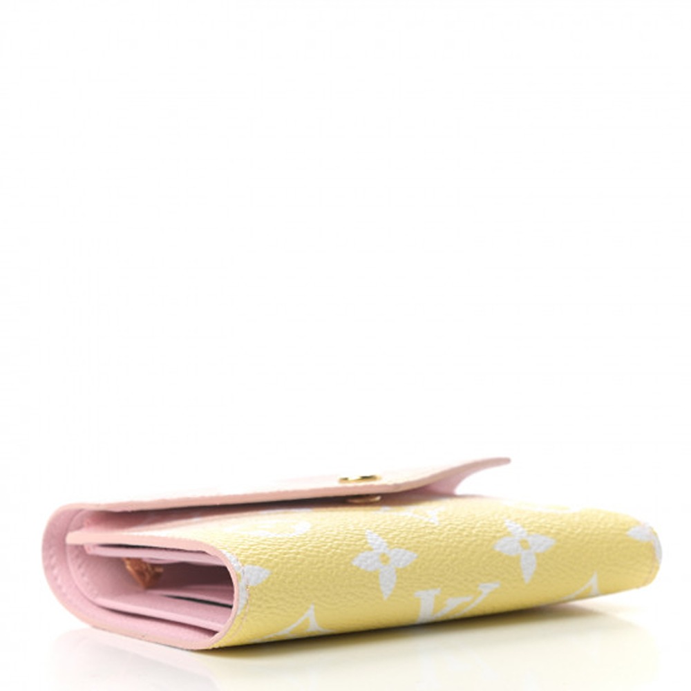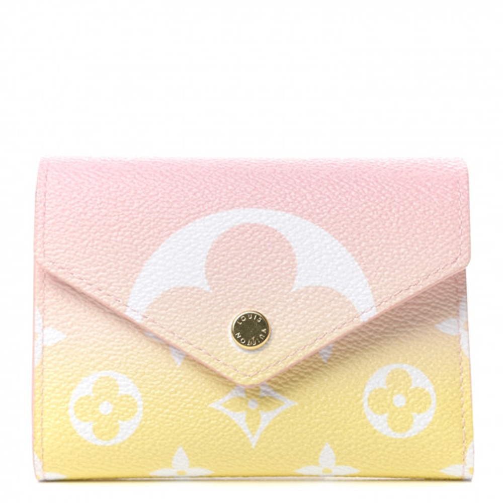 This is a Louis Vuitto NeoNoeam Giant By The Pool Victorine Wallet in Light Pink. This stylish wallet is crafted of traditional Louis Vuitto NeoNoeam toile canvas in soft pink to yellow. This wallet features a gold snap closure that opens to a light pink cross-grain leather interior with card slots, patch pockets, a bill compartment, and a zipper pocket.