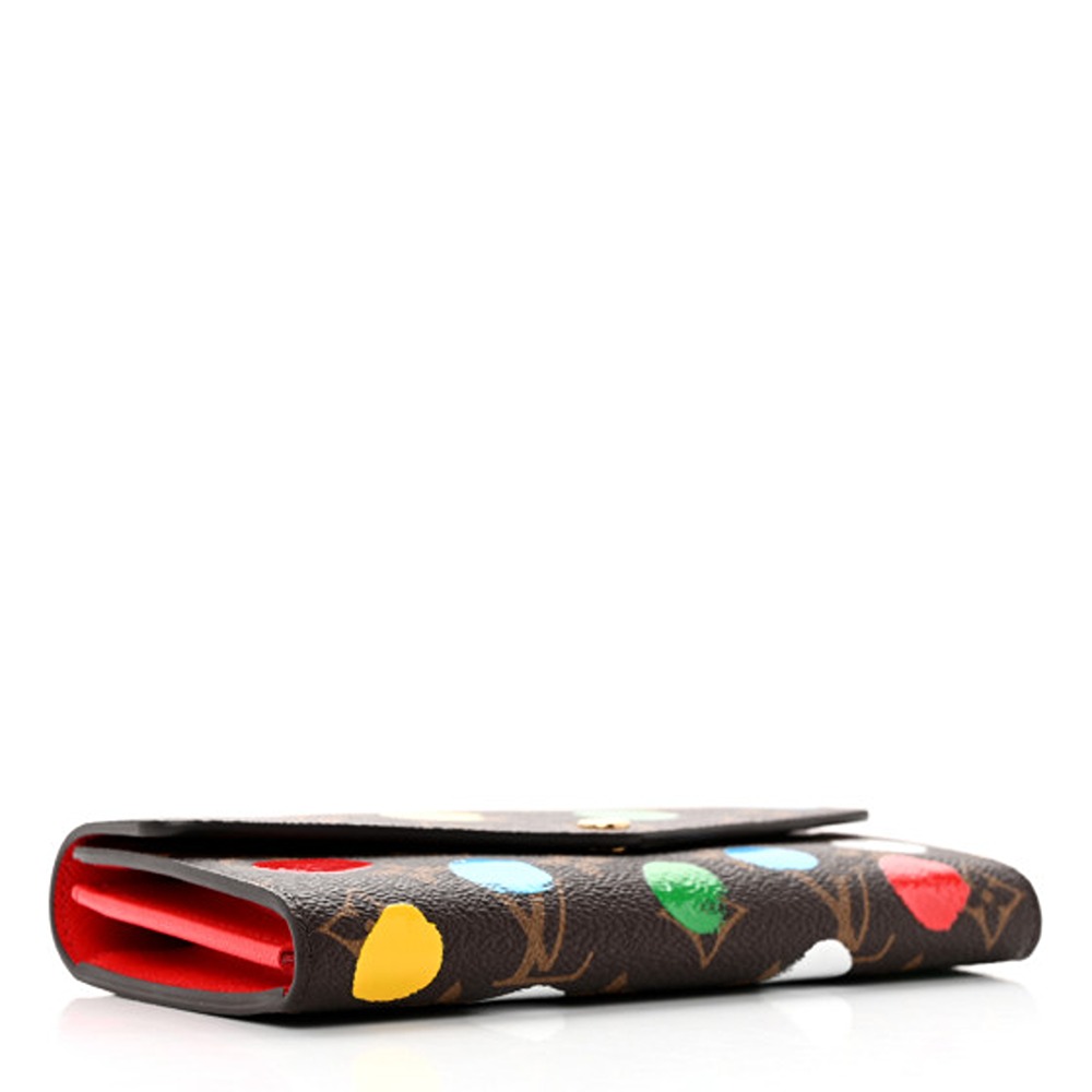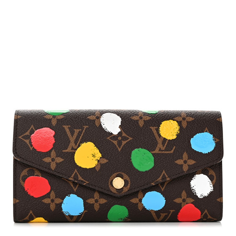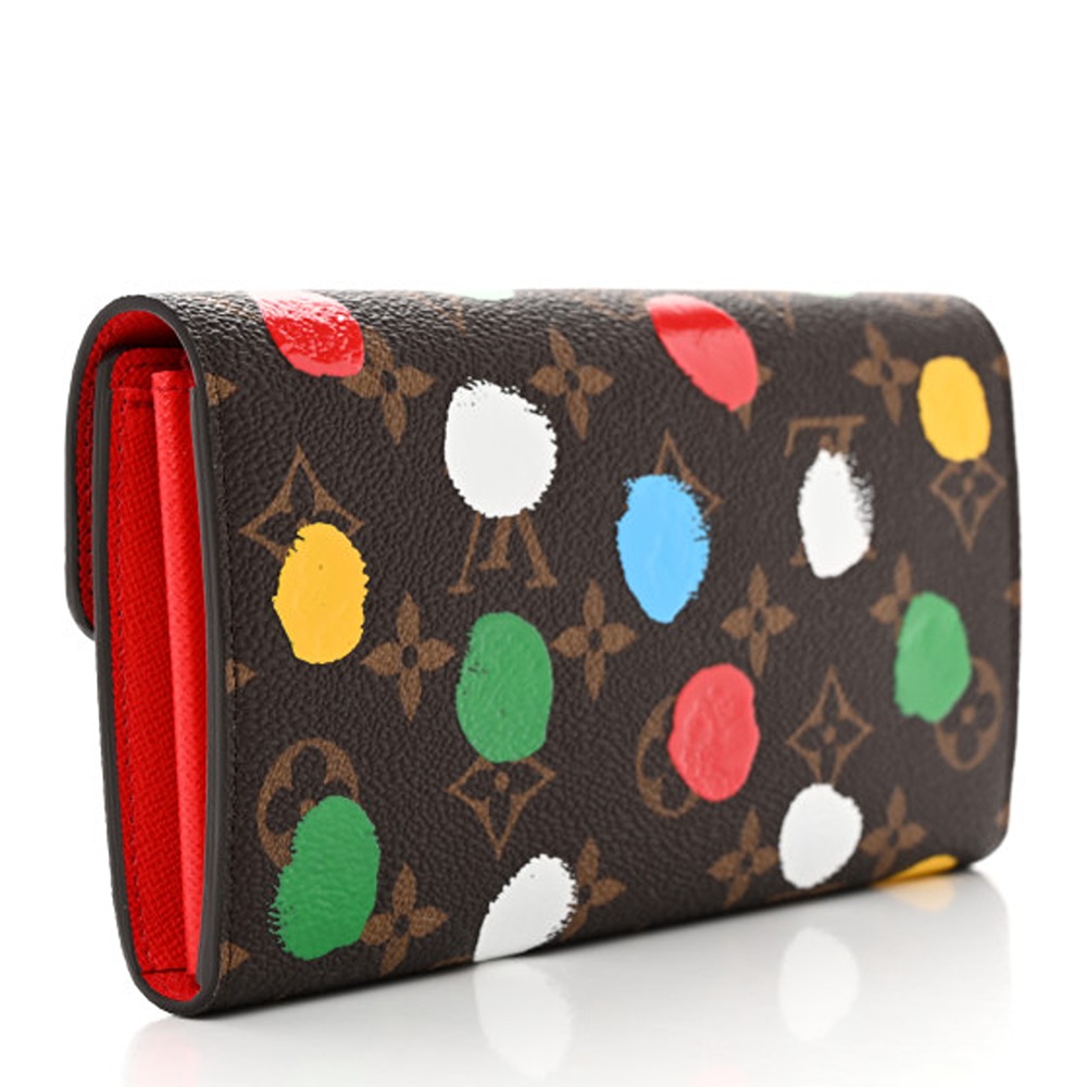 Louis Vuitton X YK Monogram Sarah Wallet. This chic clutch wallet is crafted of traditional monogram coated canvas, adorned with 3D painted dots in collaboration with Yayoi Kusama. The snap closure flap opens to a red cross-grain leather interior with multiple credit card slots, a zipped coin compartment, and two large gusseted compartments.