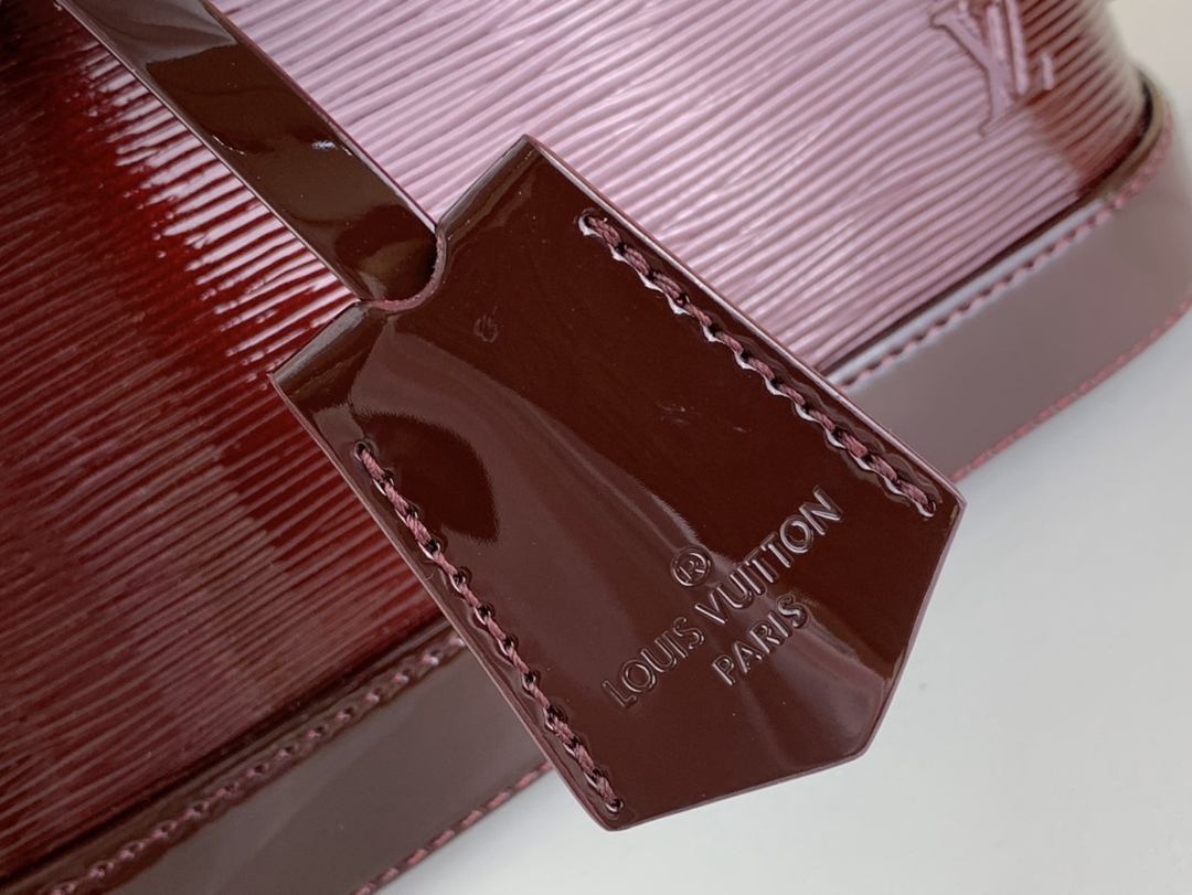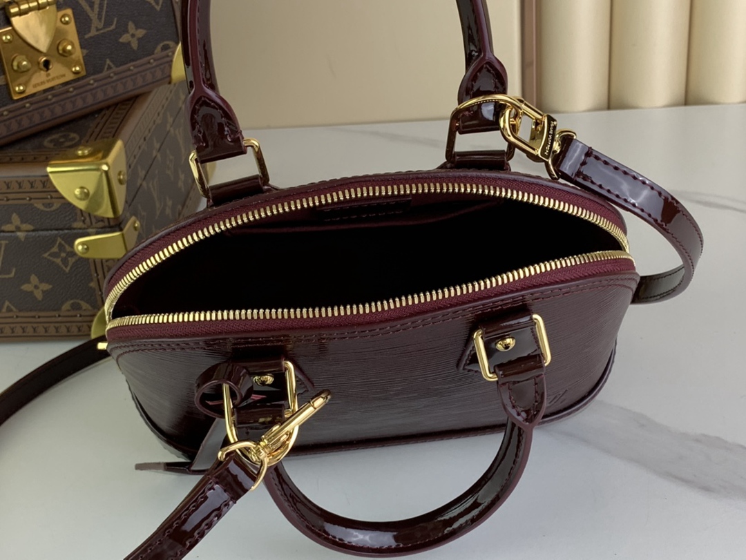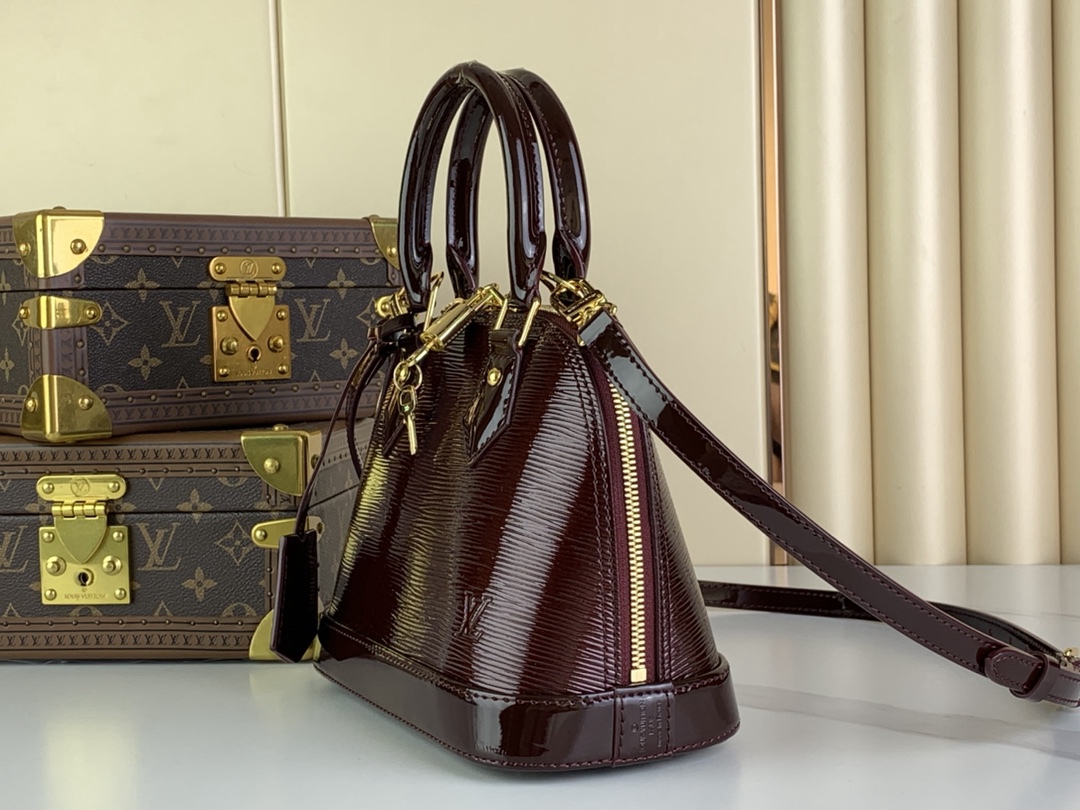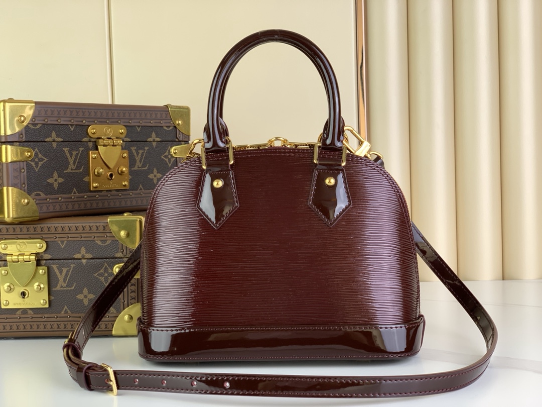 The Louis Vuitton Epi Alma PM exudes elegance with its stunning metallic black textured epi leather. Featuring smooth cowhide rolled leather top handles and trim, this bag is accented with silver hardware, including durable handle rings and a double wrap-around zipper. The interior, lined with grey microfiber, offers practicality with patch pockets, making it an ideal accessory for both day and evening wear. Size:23.5 x 17.5 x 11.5 cm