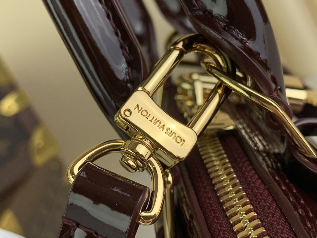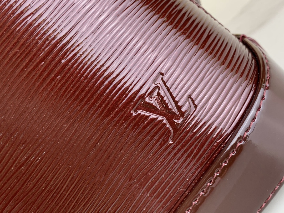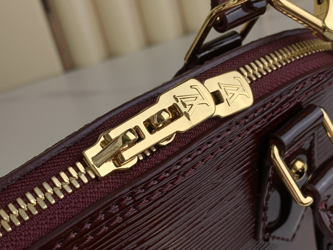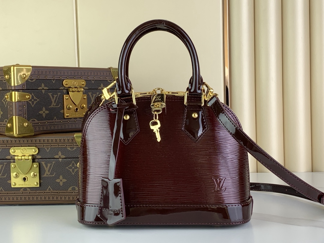 The Louis Vuitton Epi Alma PM exudes elegance with its stunning metallic black textured epi leather. Featuring smooth cowhide rolled leather top handles and trim, this bag is accented with silver hardware, including durable handle rings and a double wrap-around zipper. The interior, lined with grey microfiber, offers practicality with patch pockets, making it an ideal accessory for both day and evening wear. Size:23.5 x 17.5 x 11.5 cm