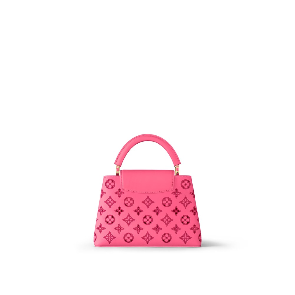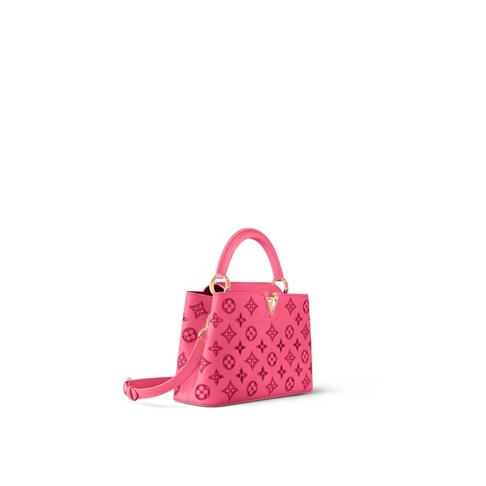 This Capucines BB handbag by Nicolas Ghesqui??re showcases the LV Broderie Anglaise theme from the Pre-Fall 2022 collection. The impressive craftsmanship involves perforating the Monogram pattern into the calfskin and embroidering the edges for durability. The bold yet soft colorway and gold LV initials exude glamour.