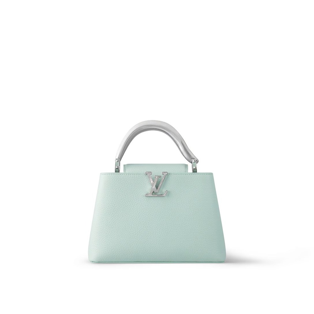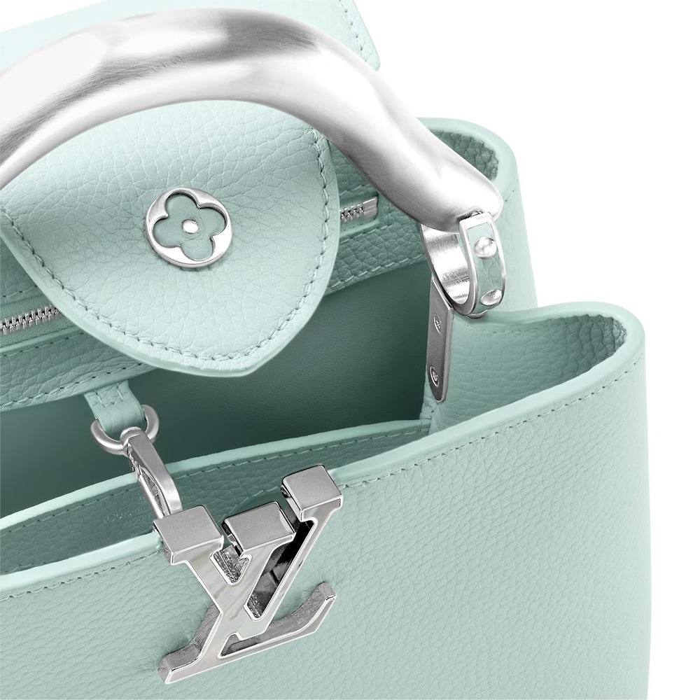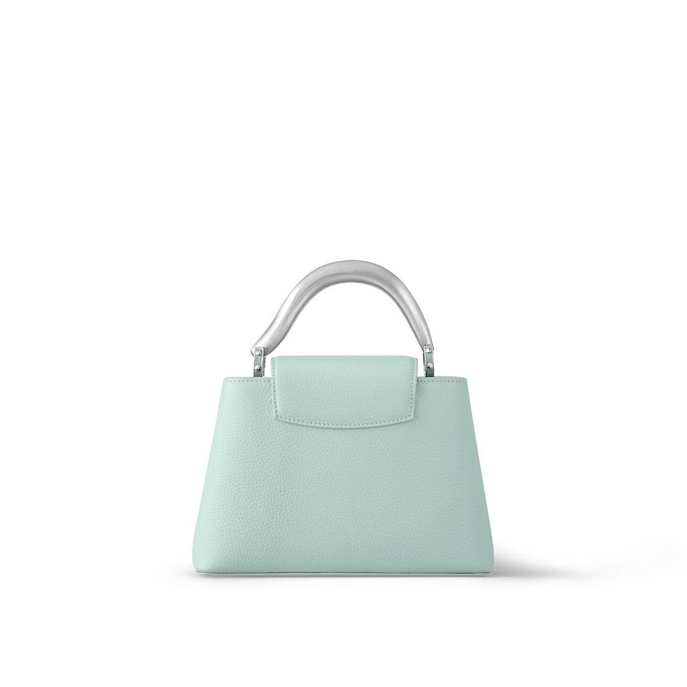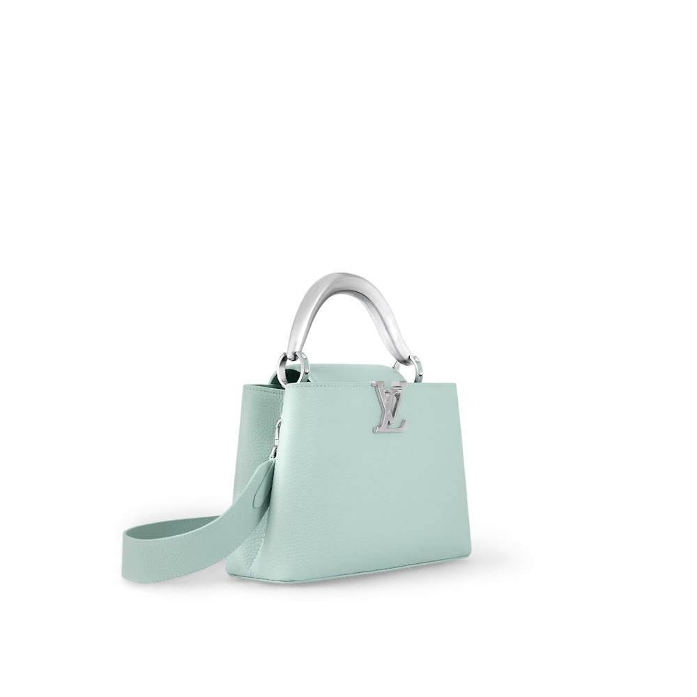 Crafted from Taurillon leather, this Capucines BB hand bag features a unique top handle in a striking organic shape inspired by the glassmaking workshops on the Venetian island of Murano. The matte brushed metal used for the handle, and LV Initials in resin in the same color of the bag?s leather, make this bag eye-catching.