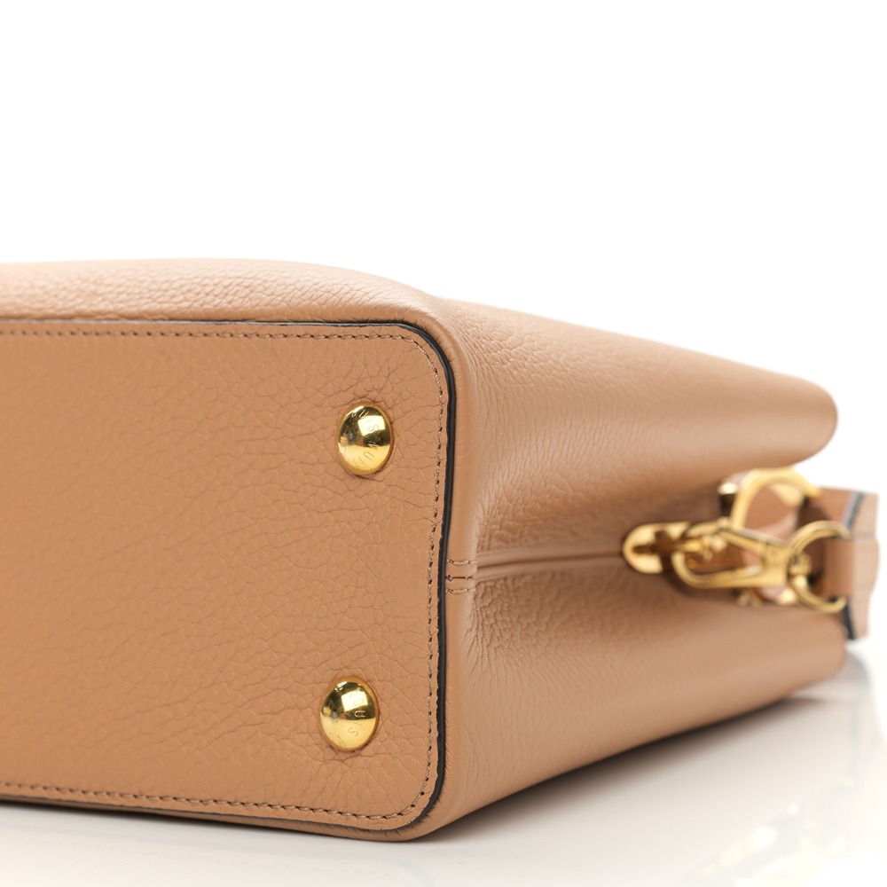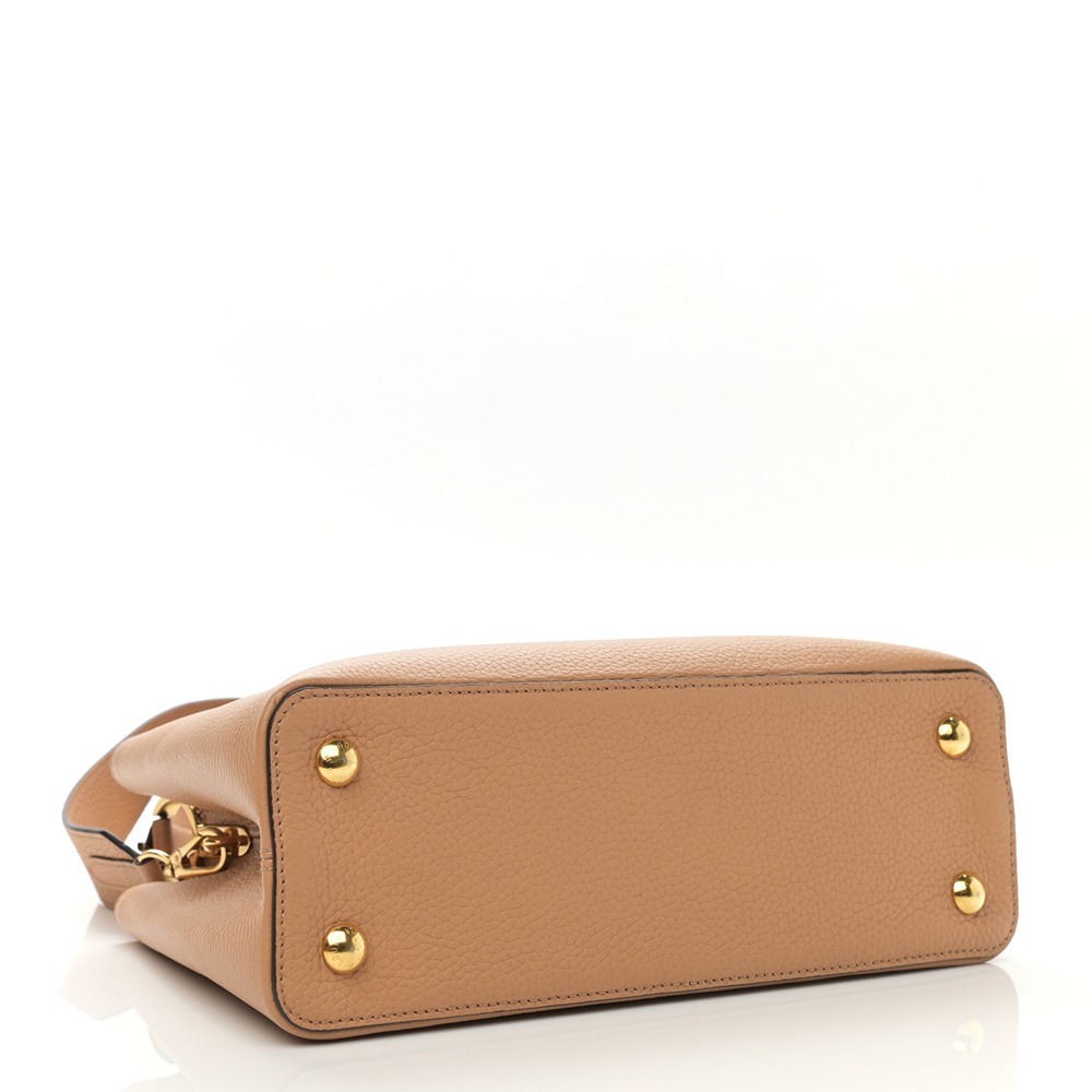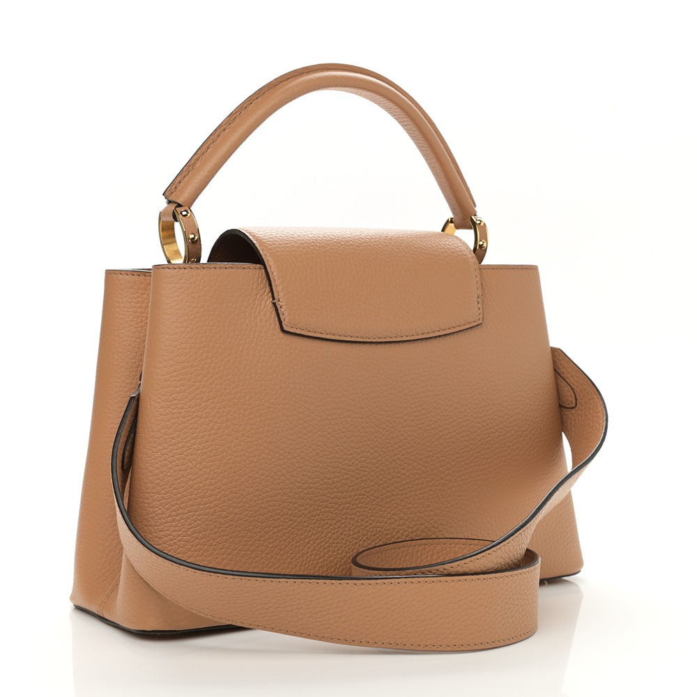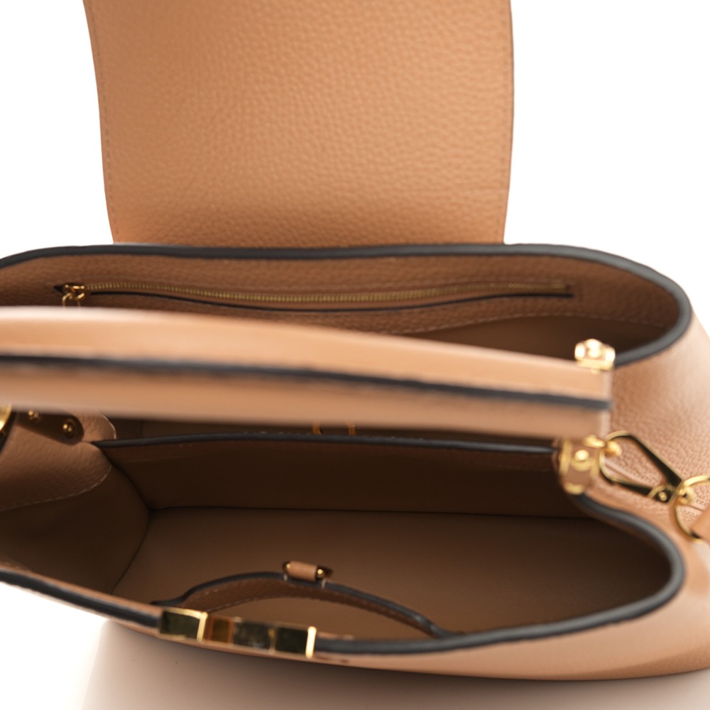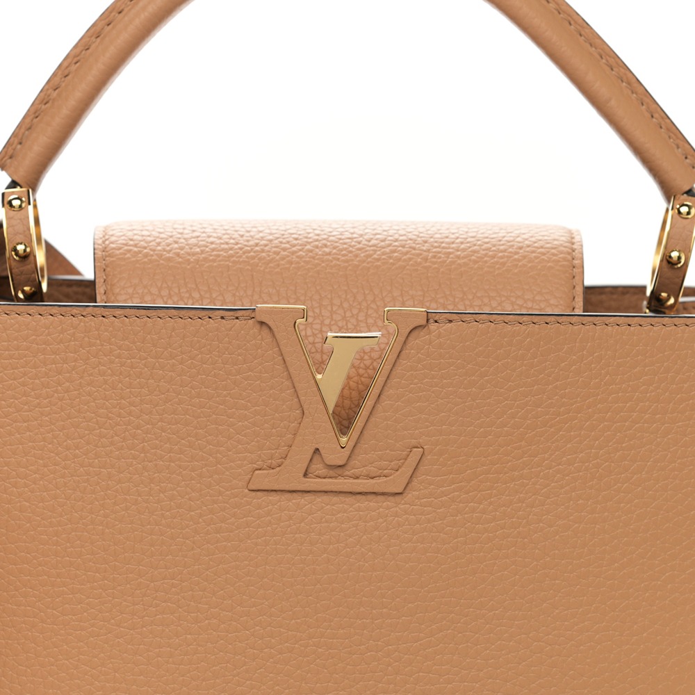 The Louis Vuitton Taurillon Capucines PM in Arizona offers sophistication in a lovely tote design. Crafted from soft taurillon pebbled calfskin leather in dark beige, this tote exudes elegance. It features a leather top handle adorned with gold links and a small facing flap enclosing a brass Louis Vuitton LV encased with leather. The flap opens to reveal a partitioned matching leather interior with a zipper compartment.