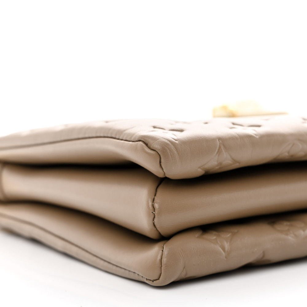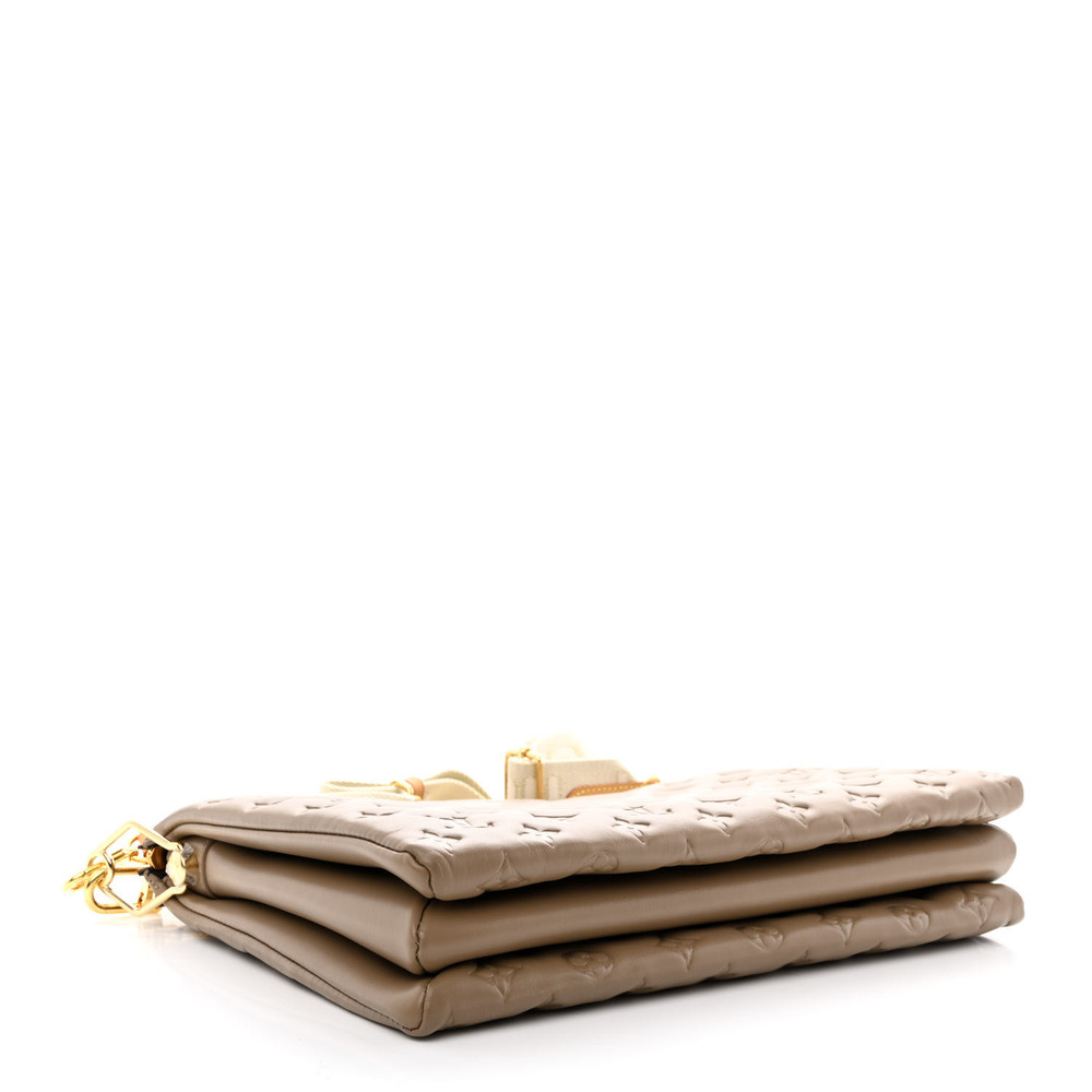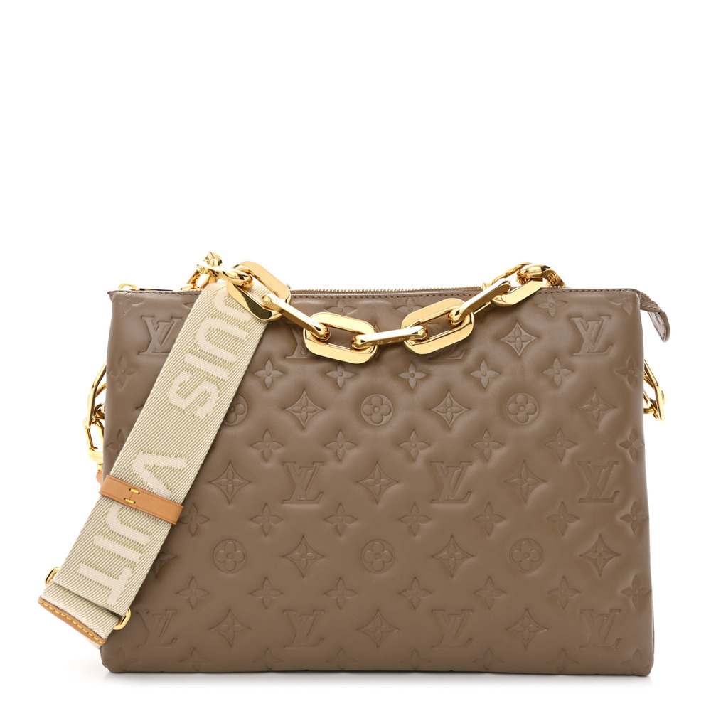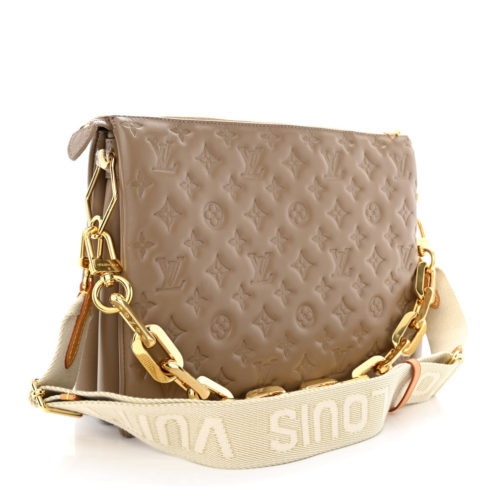 The epitome of luxury and style, the Louis Vuitton Coussin MM in Taupe Medium ?C a masterpiece that redefines elegance. This exquisite handbag is more than an accessory; it’s a declaration of sophistication and a testament to the unparalleled craftsmanship of Louis Vuitton. Crafted from the brand’s iconic monogram-embossed puffy lambskin, this piece isn’t just designed to turn heads; it’s created to set hearts aflutter.
