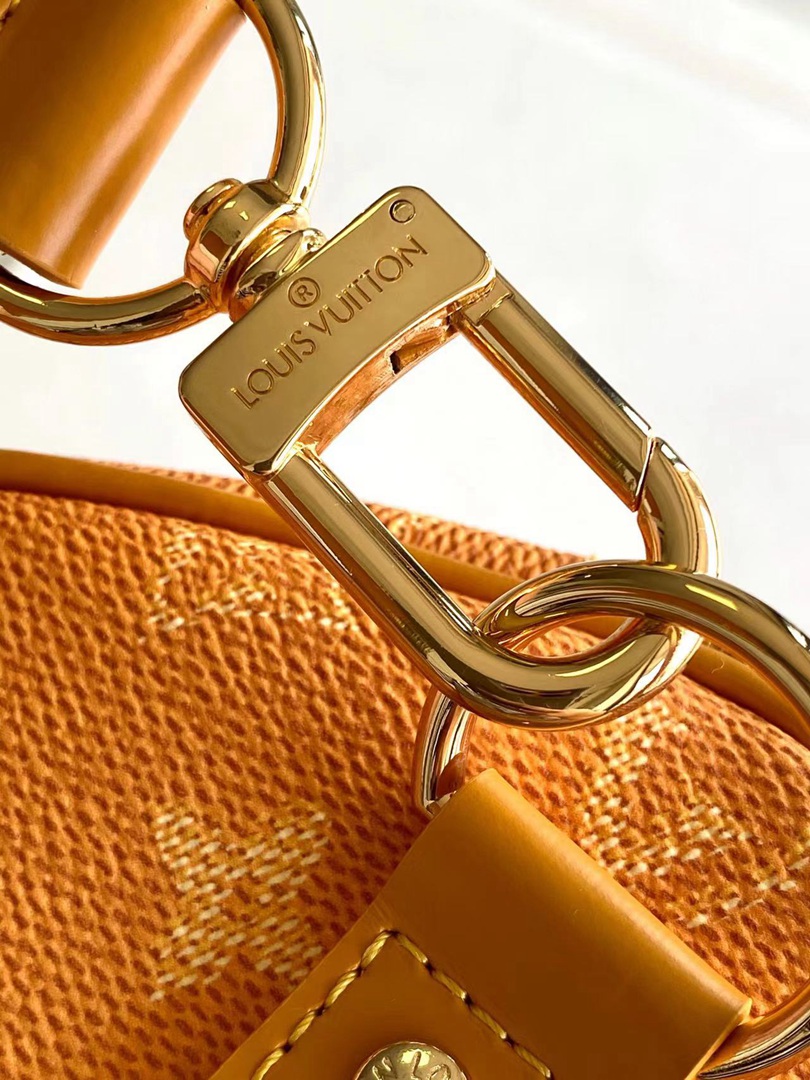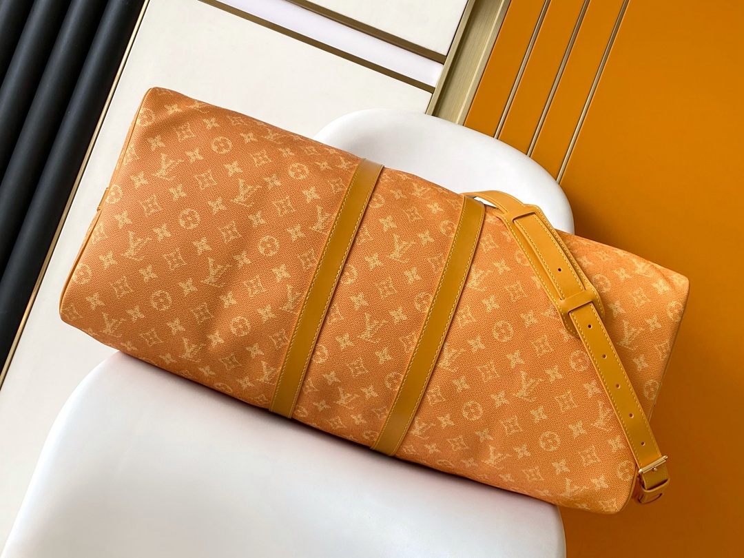 Whether carried by hand or on the shoulder with its removable strap, this Keepall 25 bag in canvas looks stunning. It features saffron on the top handles, name tag, and on the bag?s central stripe. But what makes this bag truly shine is the Parisian-style street sign that says: ?Louis Vuitton Paris 1854. Size: 27x20x45cm