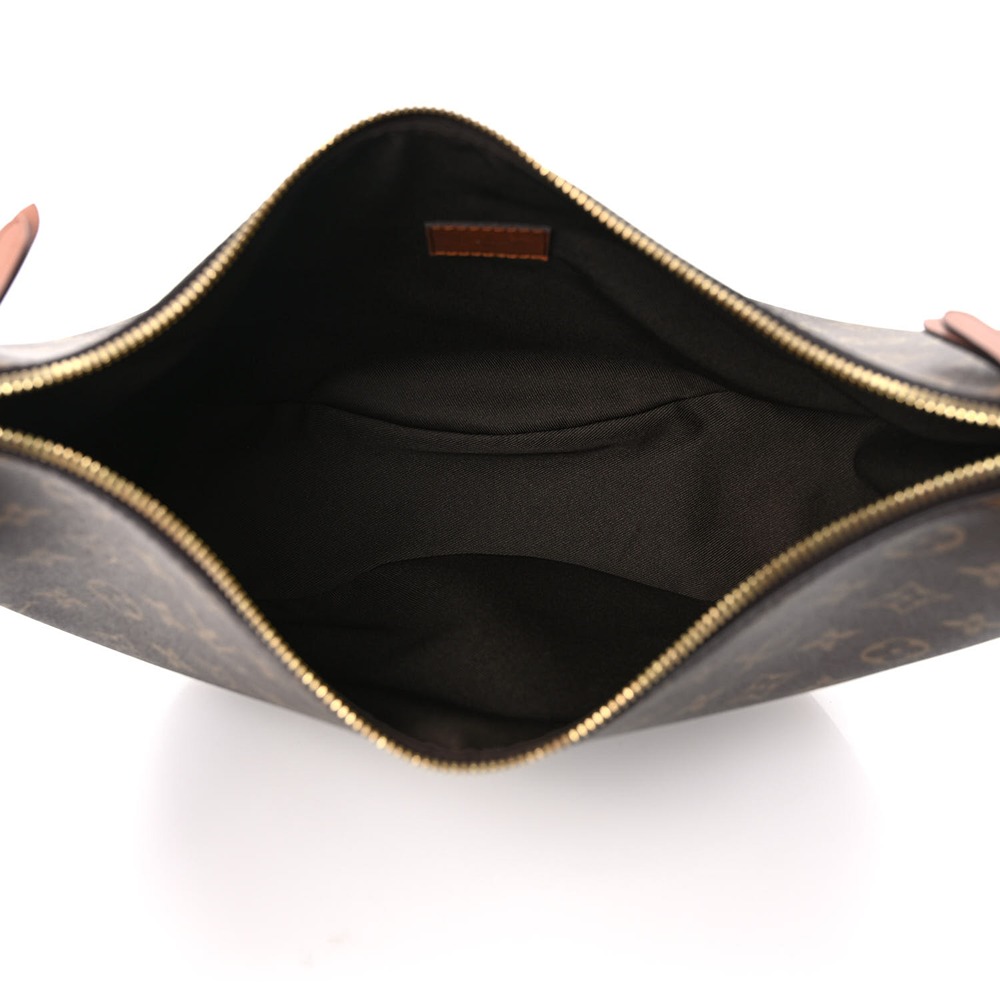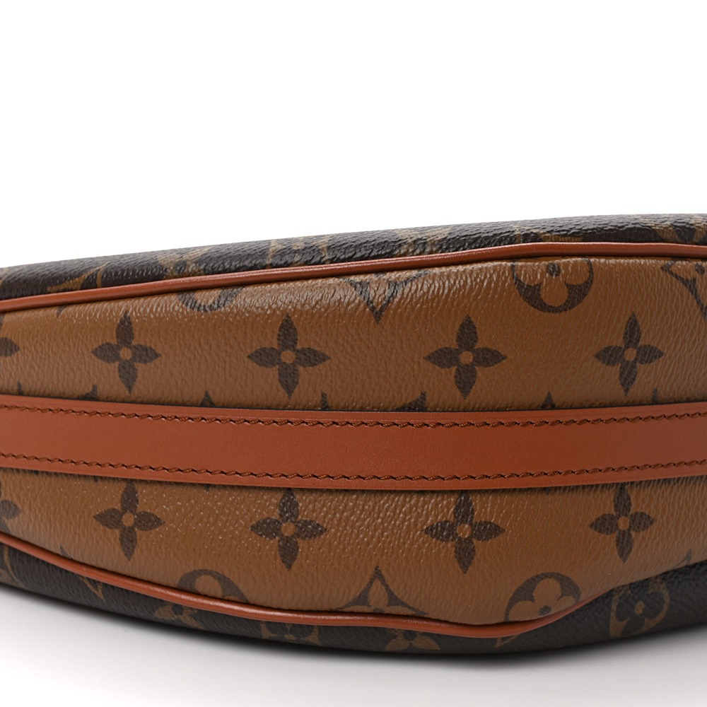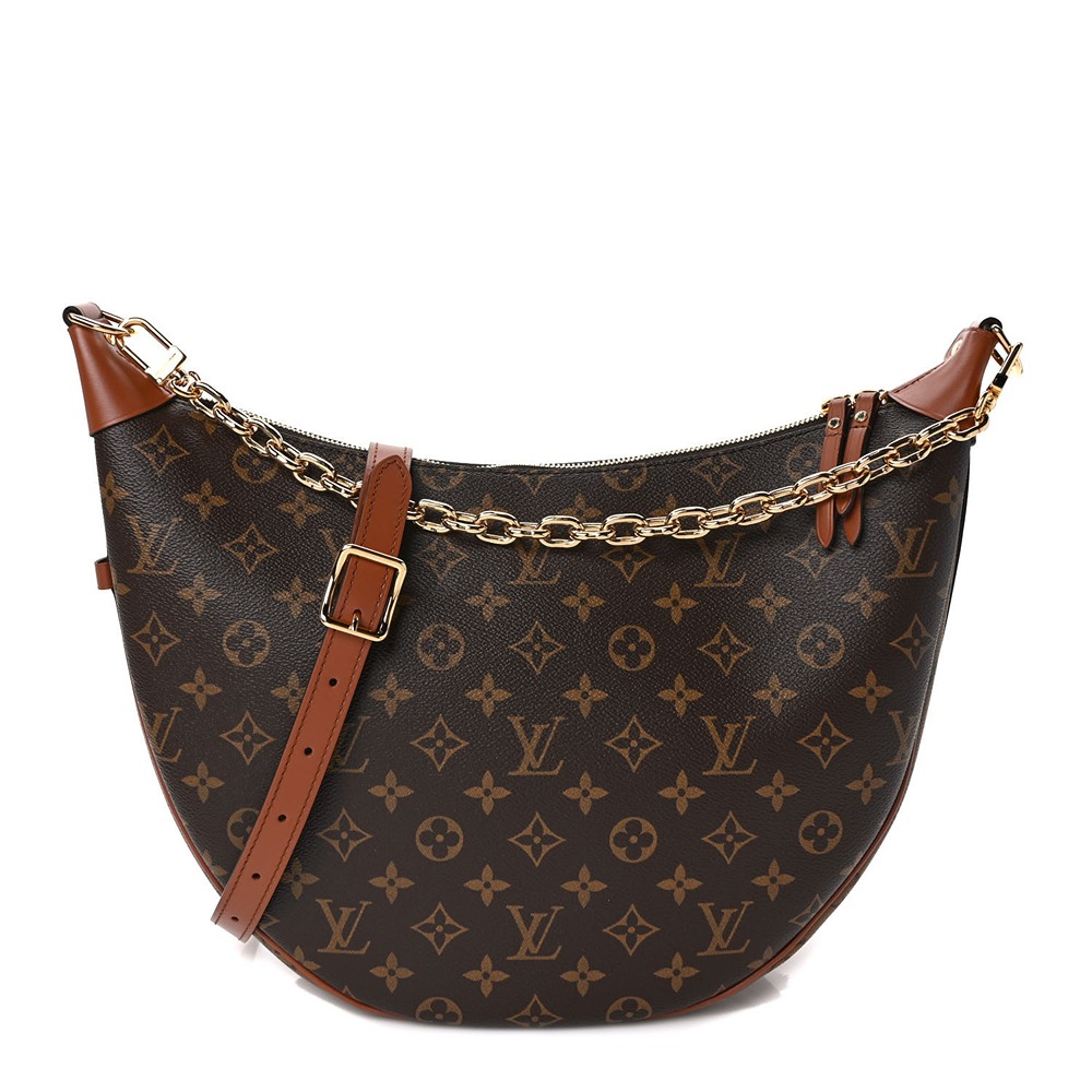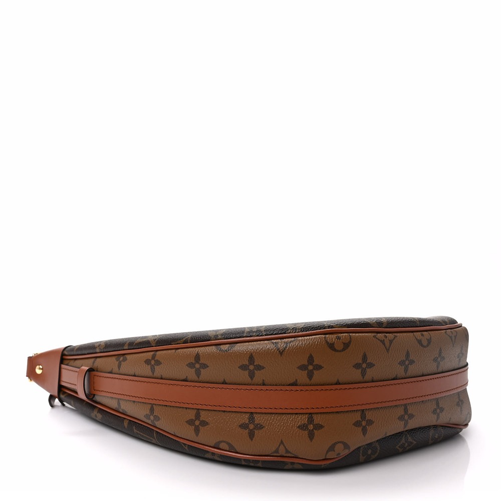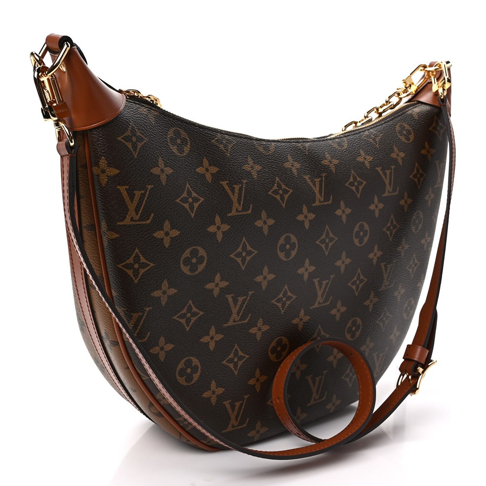 This is an Louis Vuitton Reverse Monogram Loop Hobo. This stylish bag is crafted of Louis Vuitto NeoNoeam-coated canvas. This shoulder bag features a gold chain strap, an optional leather shoulder strap, and gold hardware. The top zipper opens to a brown fabric interior.
