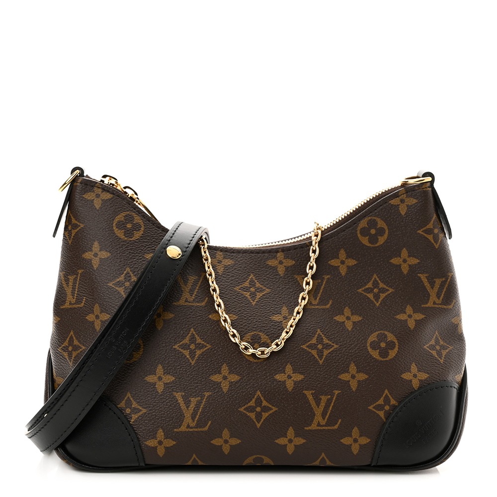 Authentic Louis Vuitto NeoNoeam Boulogne NM in Black, crafted with Louis Vuitto NeoNoeam coated canvas. Features polished brass hardware, an adjustable leather shoulder strap, and an optional chain strap. Opens with a top zipper to reveal a black fabric interior with a pocket. Includes FASHIONPHILE Certificate of Authenticity, dust bag, and strap.