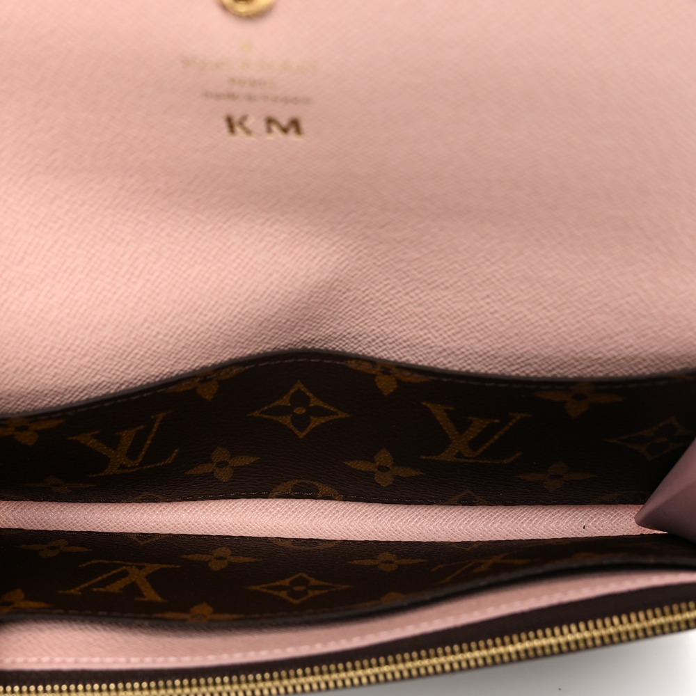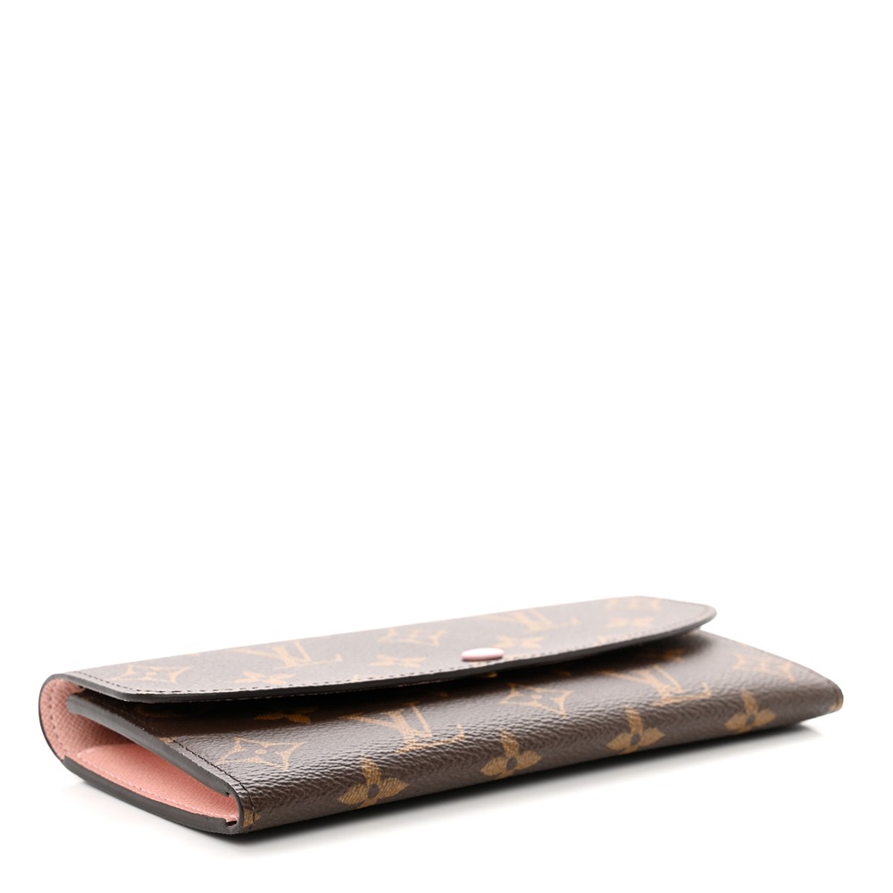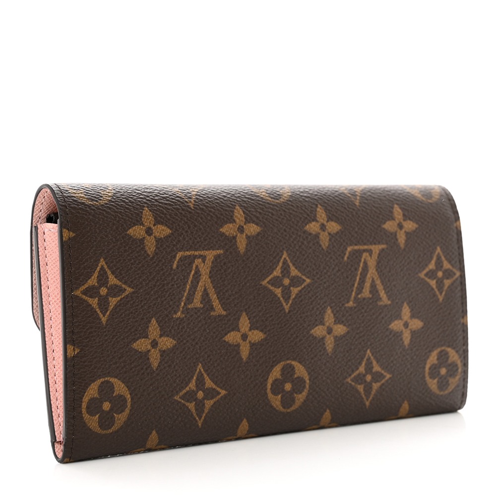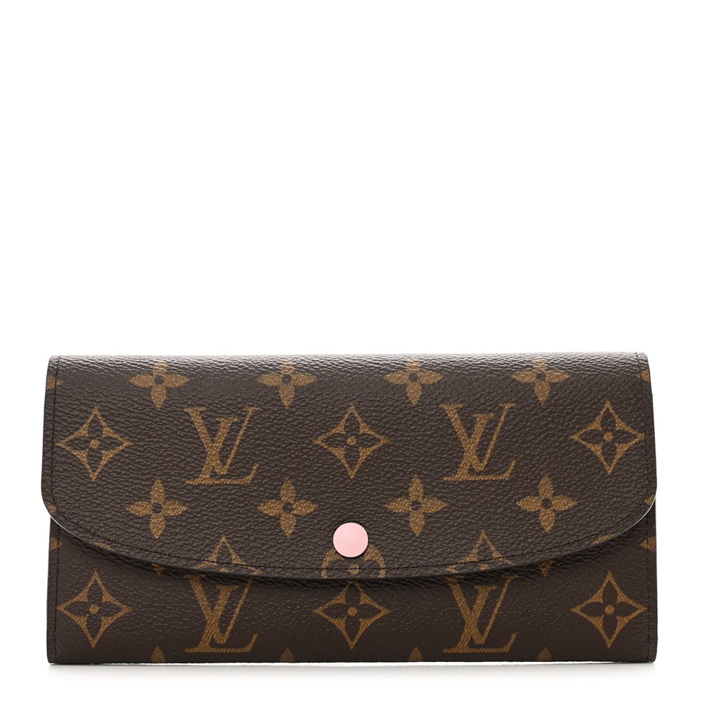 Louis Vuitto NeoNoeam Emilie Wallet in Rose Ballerine. This stylish wallet is crafted of classic Louis Vuitto NeoNoeam coated canvas in brown and features an envelope-style flap with a ballerina pink snap. This opens to a pink cross-grain leather and monogram canvas interior with card slots, patch pockets, and a zipper compartment.
