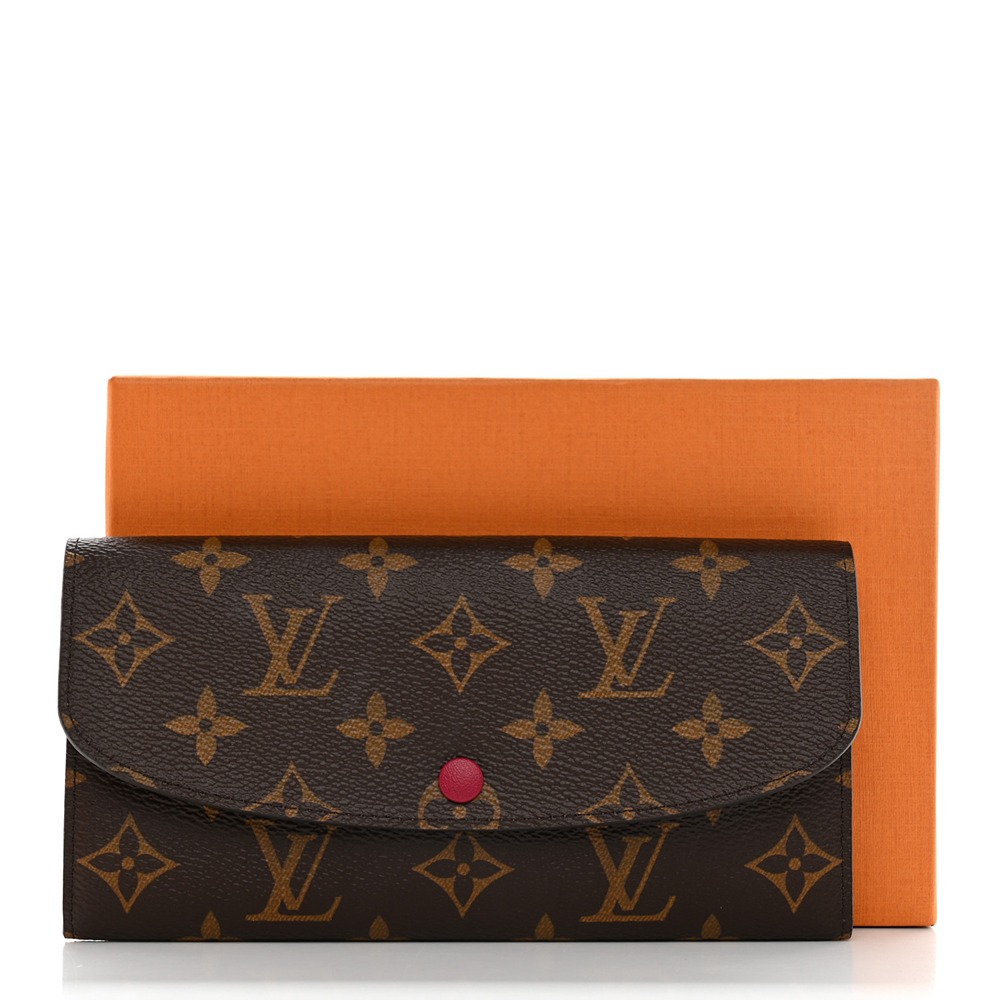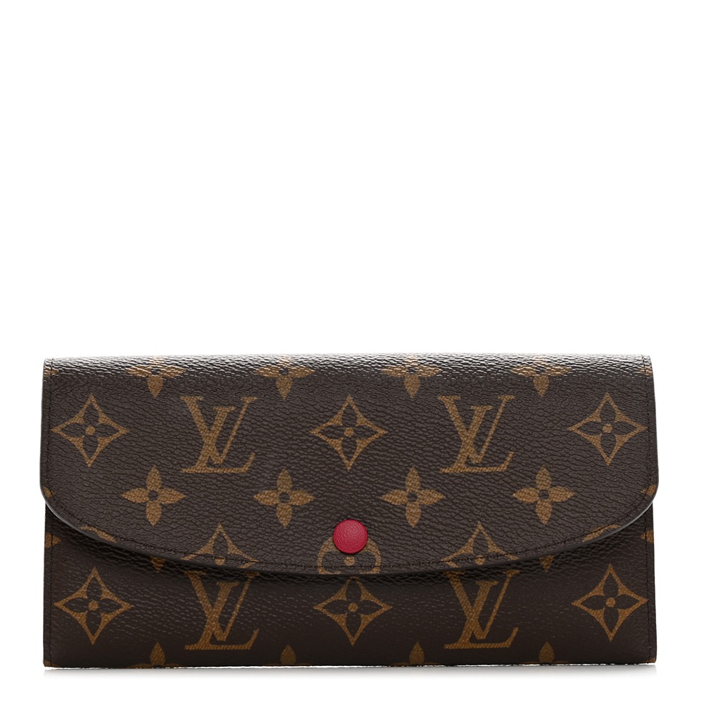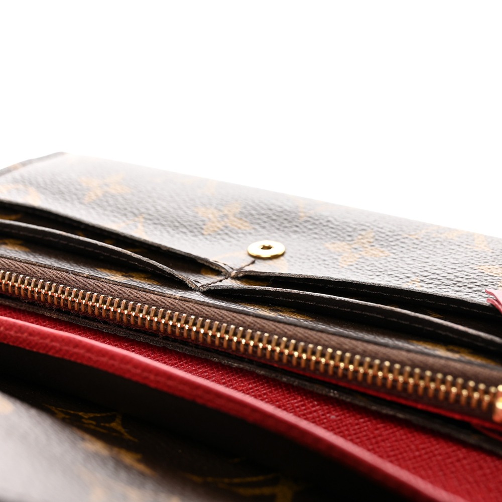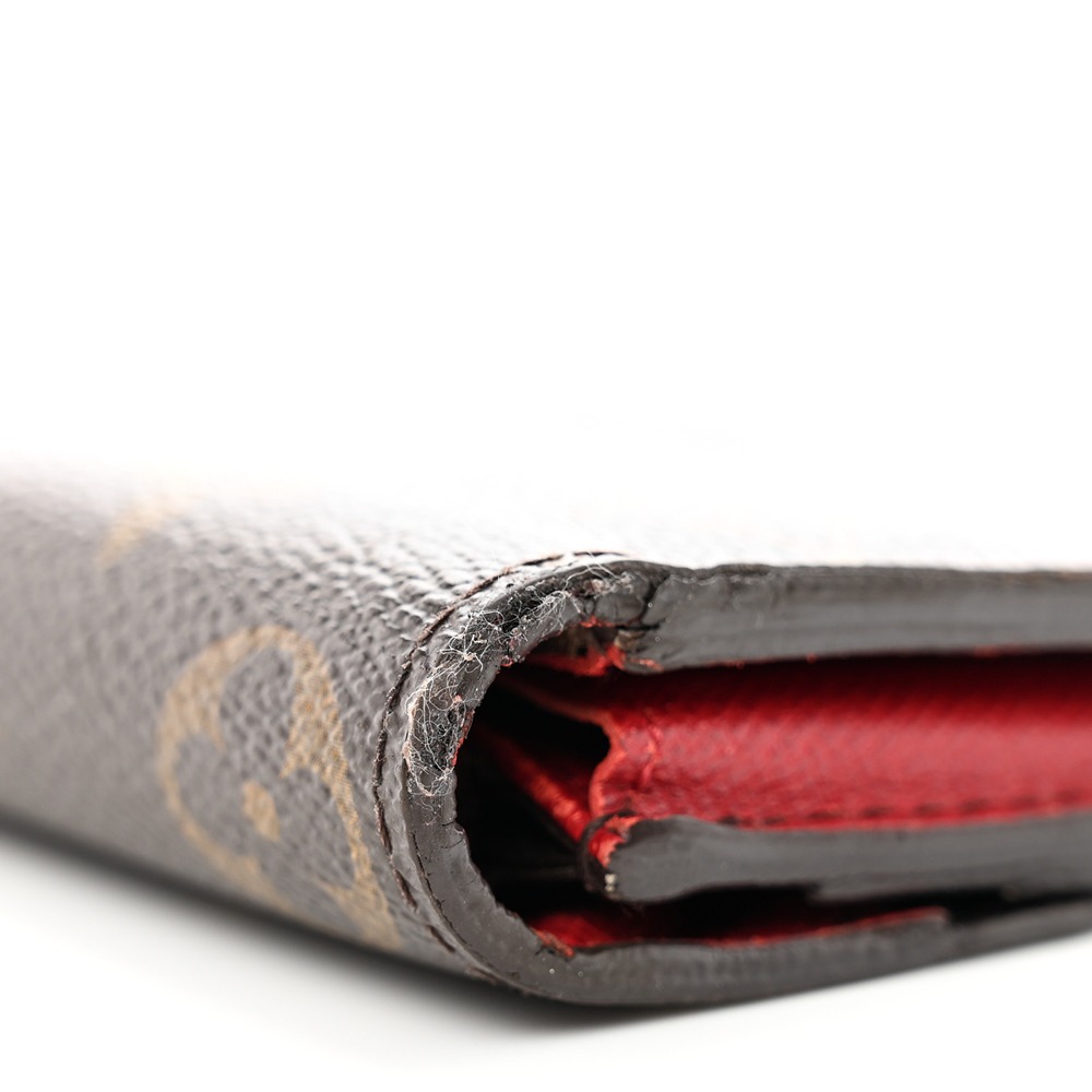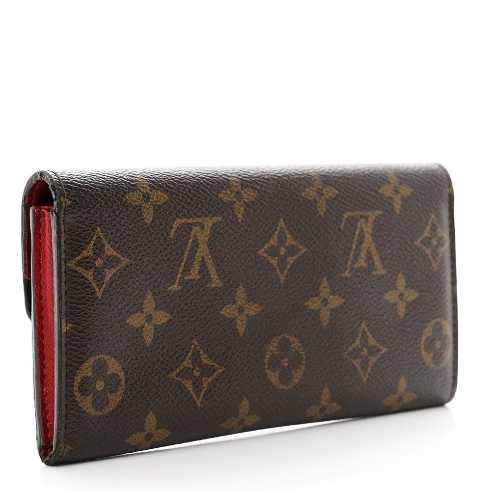 Louis Vuitto NeoNoeam Emilie Wallet in Rouge. This stylish wallet is crafted of classic Louis Vuitto NeoNoeam coated canvas in brown and features an envelope-style flap with a Rouge snap. This opens to a red cross-grain leather and monogram canvas interior with card slots, patch pockets, and a zipper compartment.